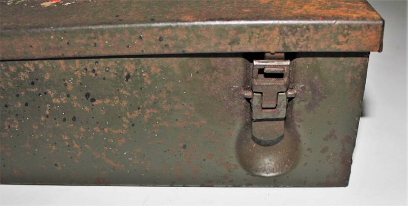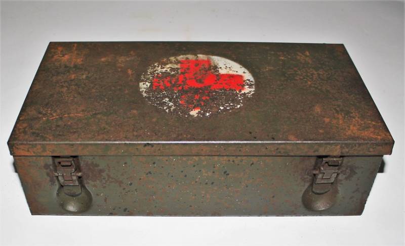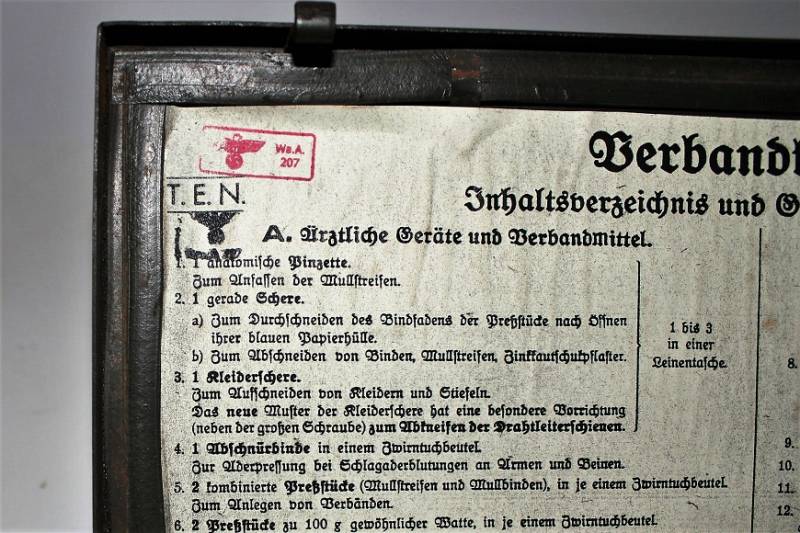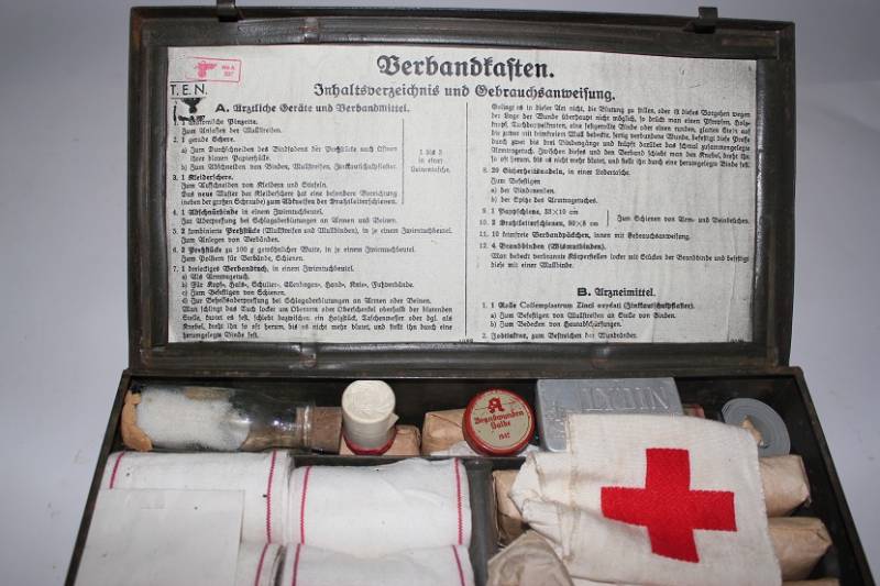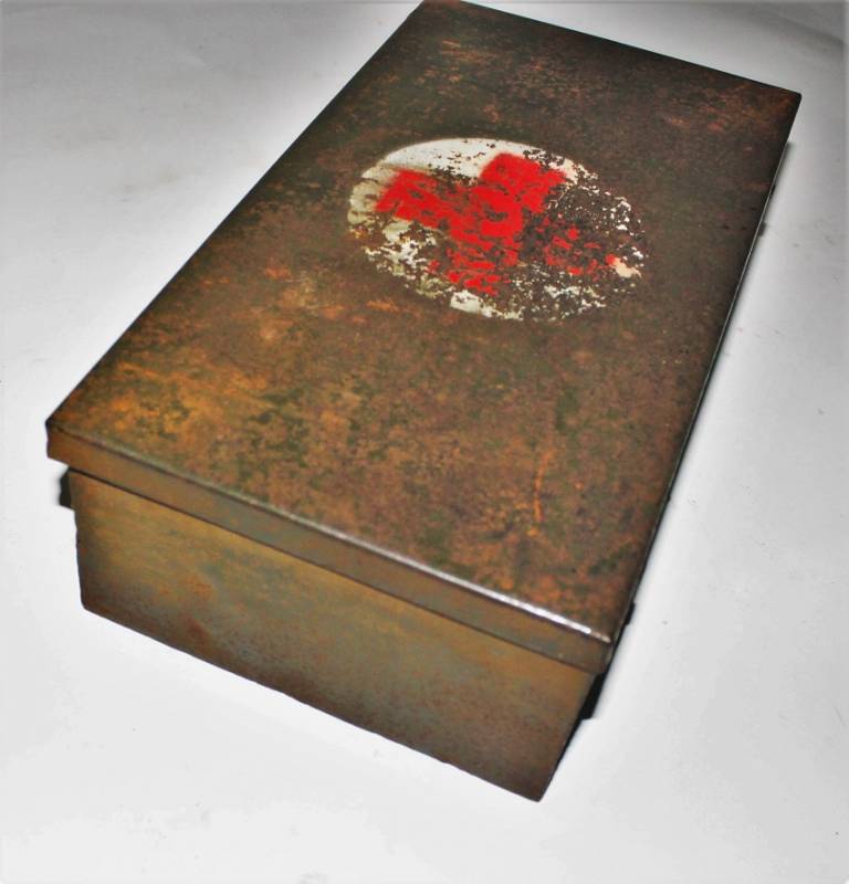 Cassetta di metallo VERBANDSKASTEN mod.1930 in colorazione verde felgrau in buone condizioni, con vernice al 70%, patina del tempo e dellŽuso, completa in ogni sua parte, non riparata o restaurata, con allŽinterno tutti gli accessori necessari per il 1°intervento medico (come da foto). Originale 100% WWII periodo.