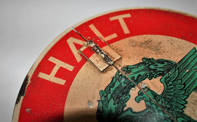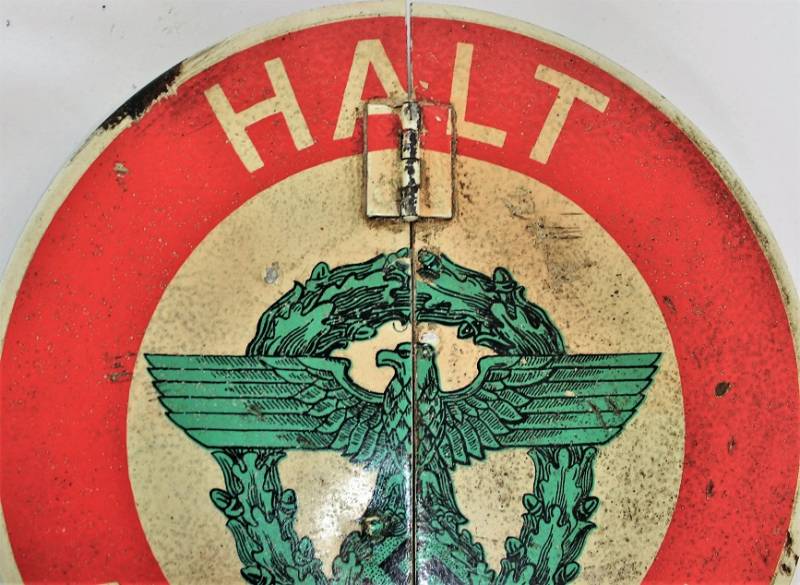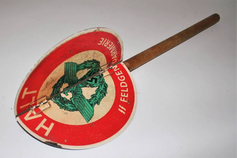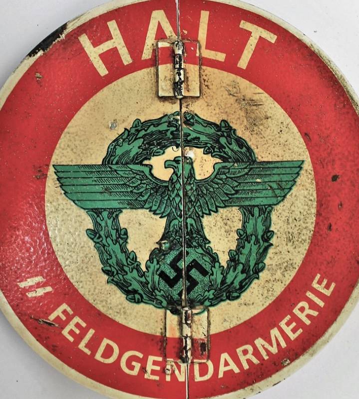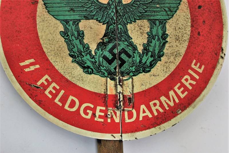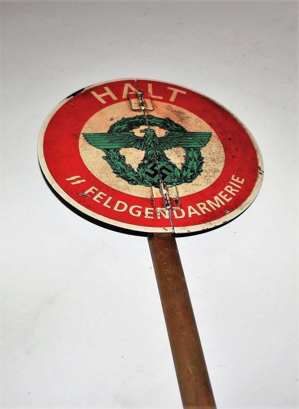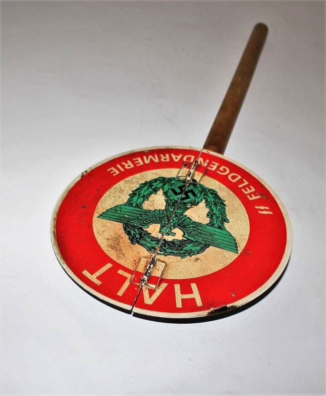 Paletta controllo traffico della "Feldgendarmeria W.SS", in ottime condizioni al 95% di conservazione e colorazione, lŽimmagine "halt, SS Feldgendarmeria e aquila" sono stampate in maniera corretta su base di metallo su entrambe le parti, modello incernierato divisibile per facilitarne il trasporto, leggera patina di usura e del tempo. Oggetto molto raro. Originale 100% WWII periodo.