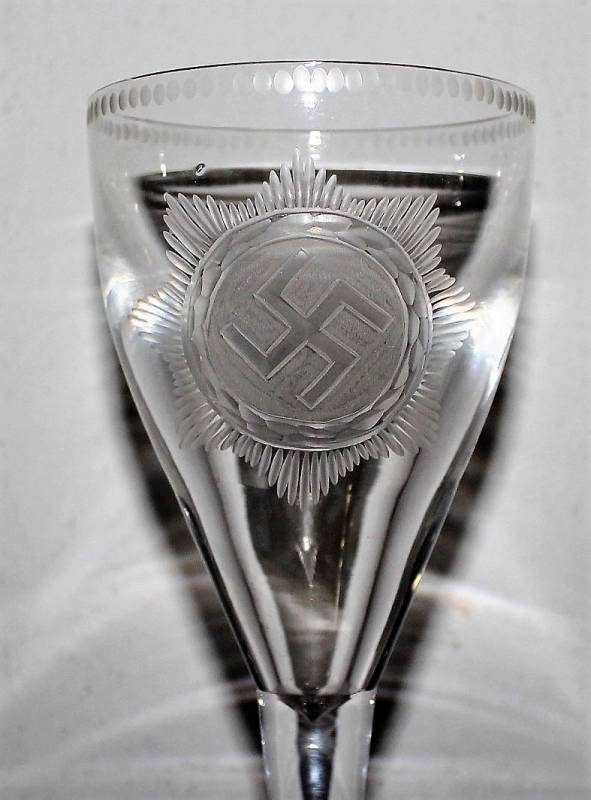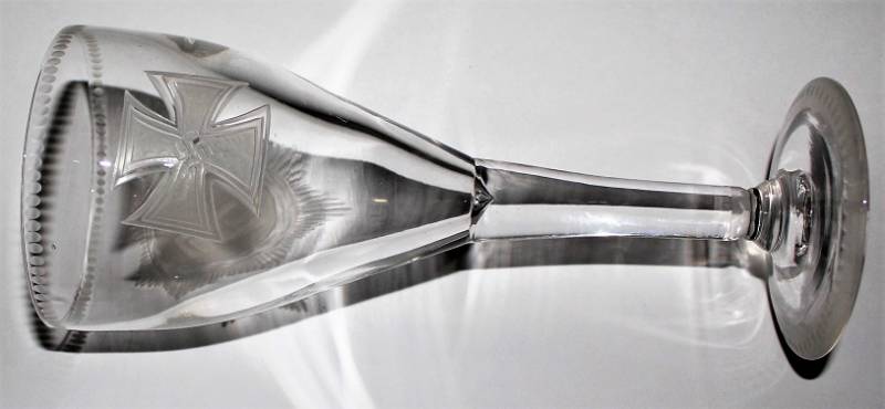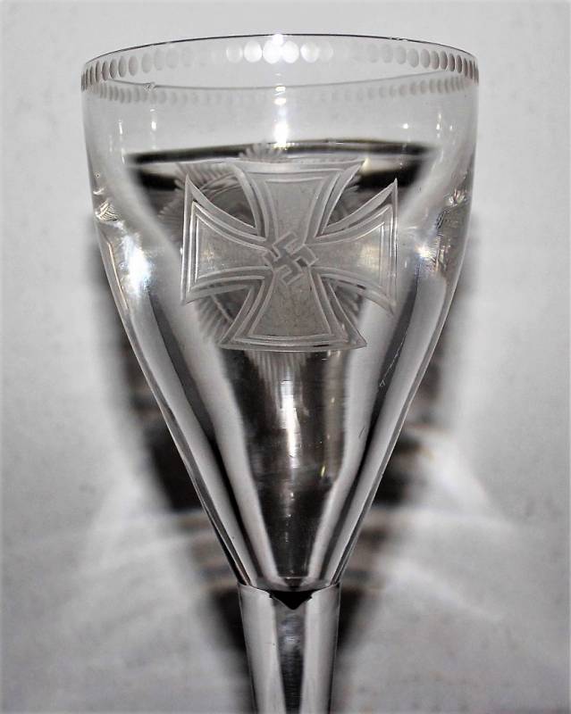 Calice in cristallo commemorativo con croce di ferro e croce di Germania incise a molatura satinata sulla coppa, condizioni perfette. Originale 100% WWII periodo.