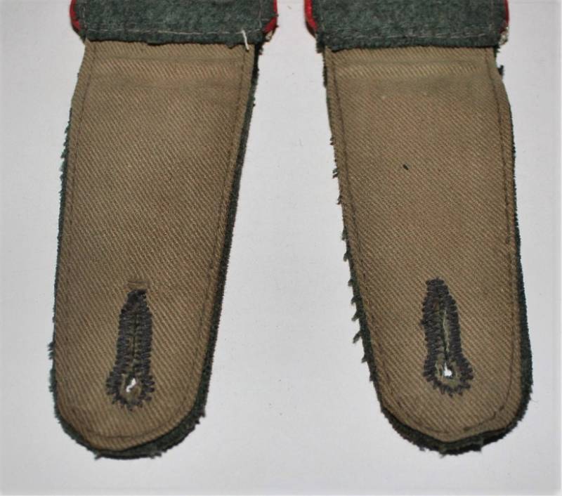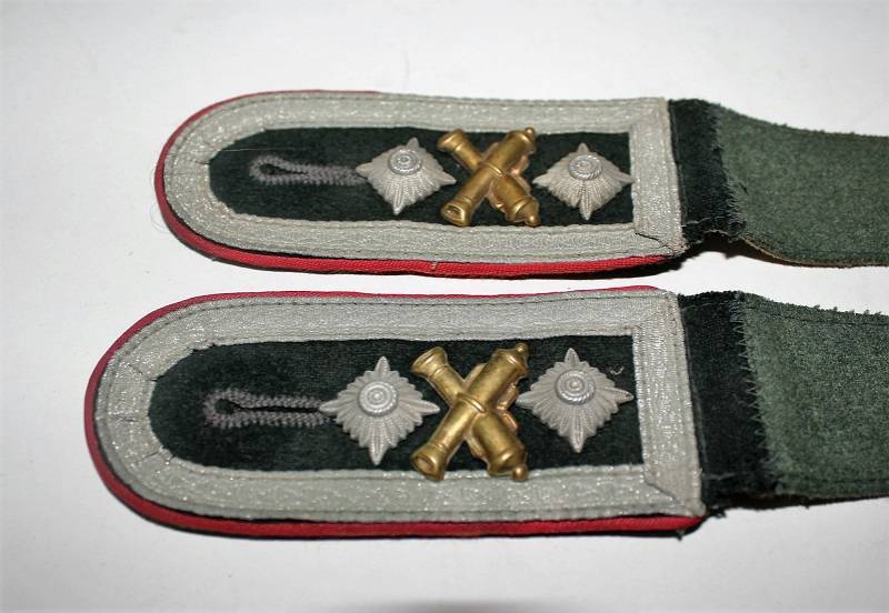 Spalline sottufficiale della WH mod.36, waffenfarbe rosso reparti artiglieria, complete di monogrammi, condizioni ottime, leggera patina del tempo e dellŽuso (unŽastina del monogramma è mancante). Originale 100% WWII periodo.