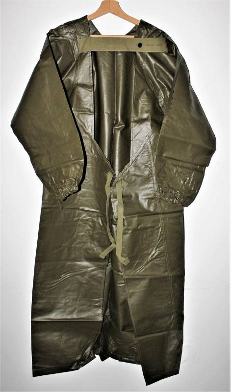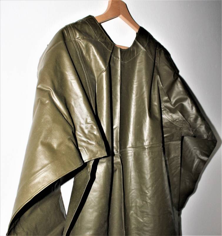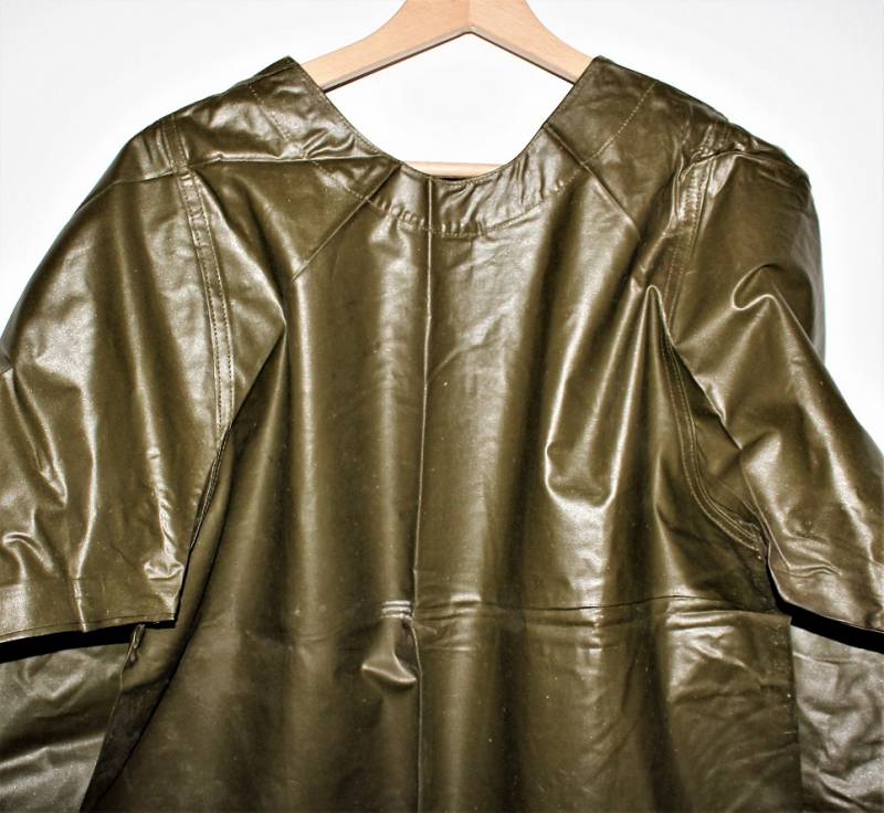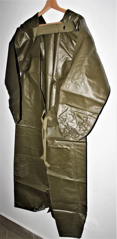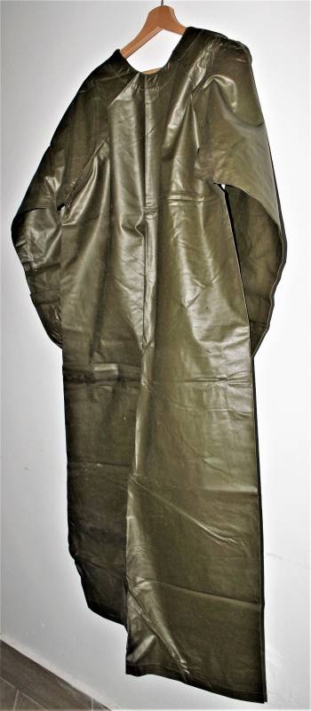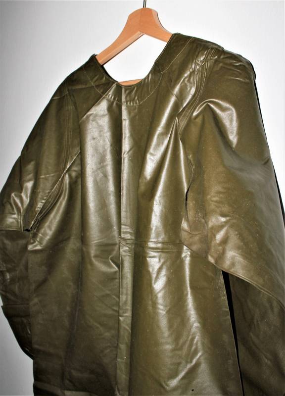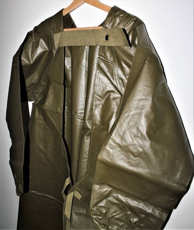 US Army protective raincoat M1 in perfect condition, new from stock, never used, complete in all its parts and not restored or repaired and without holes or tears, marked with lot numbers and small size.