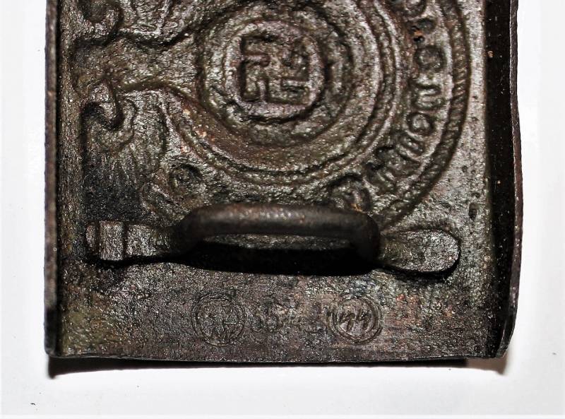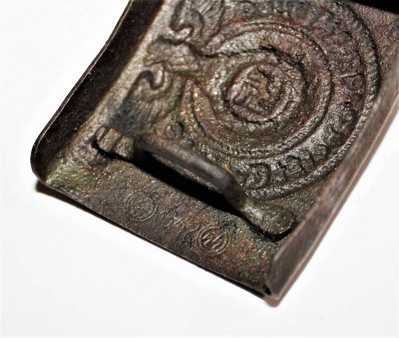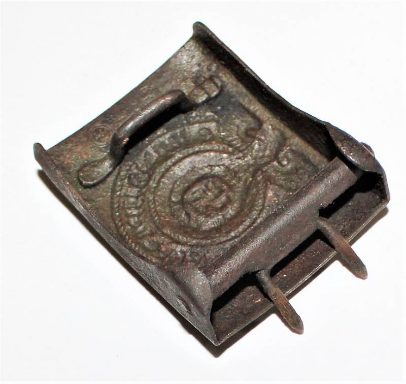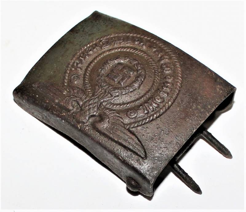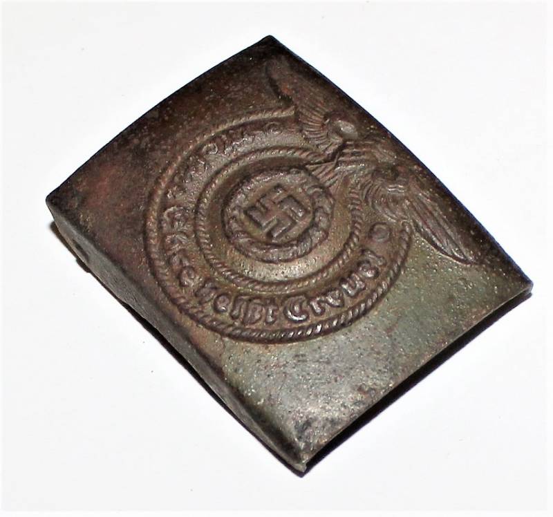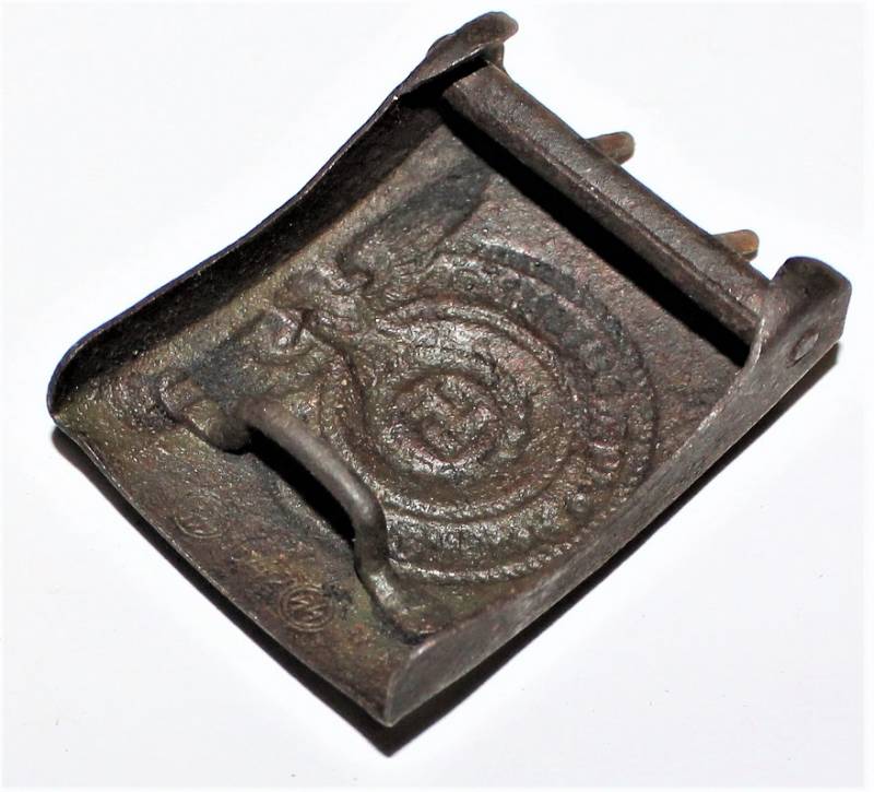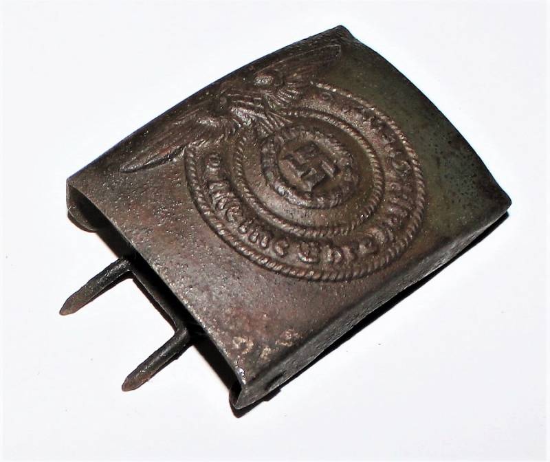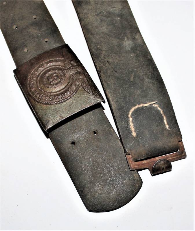 NCO W.SS buckle and belt, steel model buckle with superficial rust, some traces of green paint visible, leather belt in good condition but the leather is slightly dry, all not restored or repaired. The buckle is marked RZM SS. Length approximately 95 cm. 100% original WWII period.