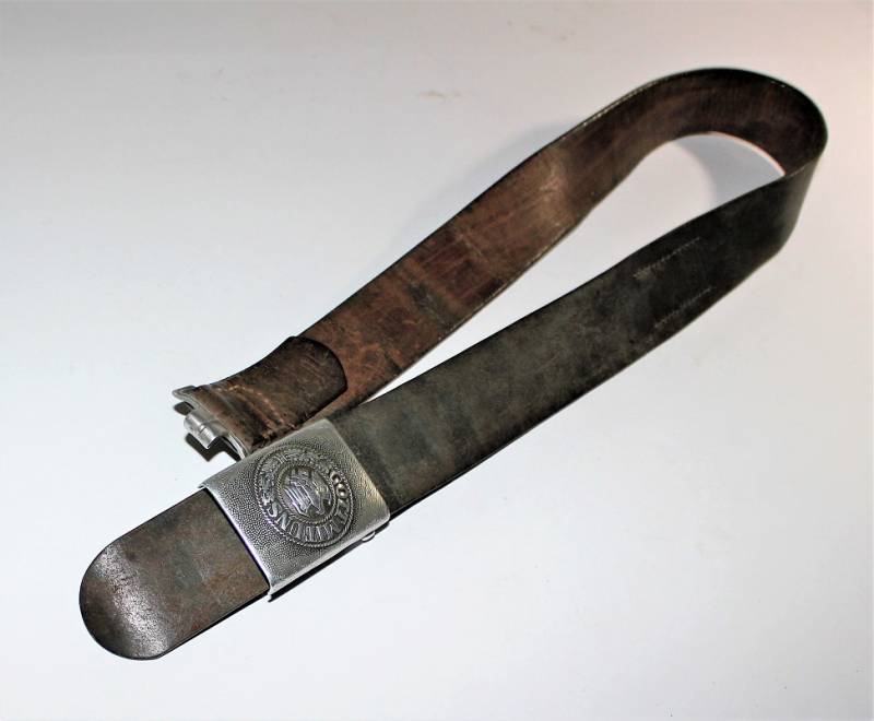 Belt and buckle NCO WH all in good condition, aluminum buckle marked with manufacturer code, complete with leather loop also marked with manufacturer and date 1939, black leather belt in excellent condition, length approx. 100 cm, not damaged and with perfect seams only vintage repair close to the hook.