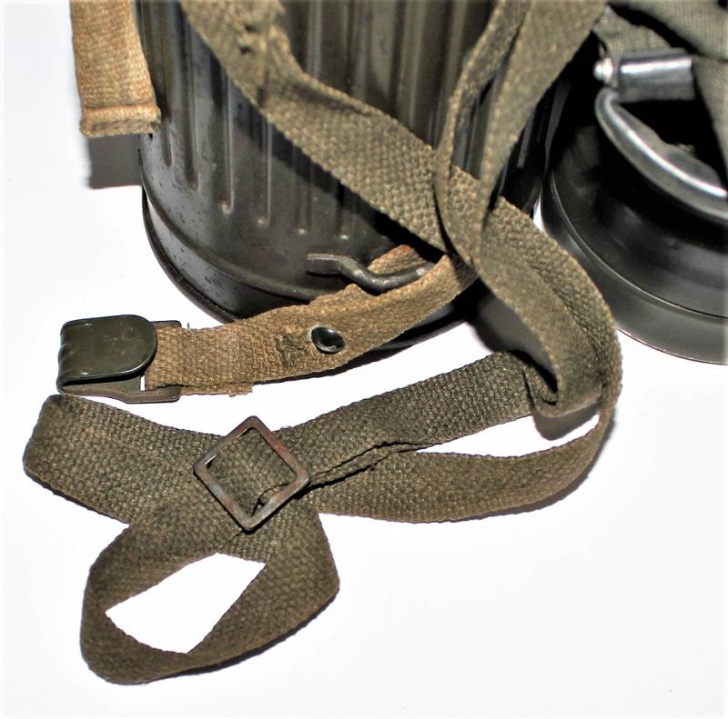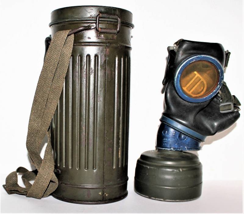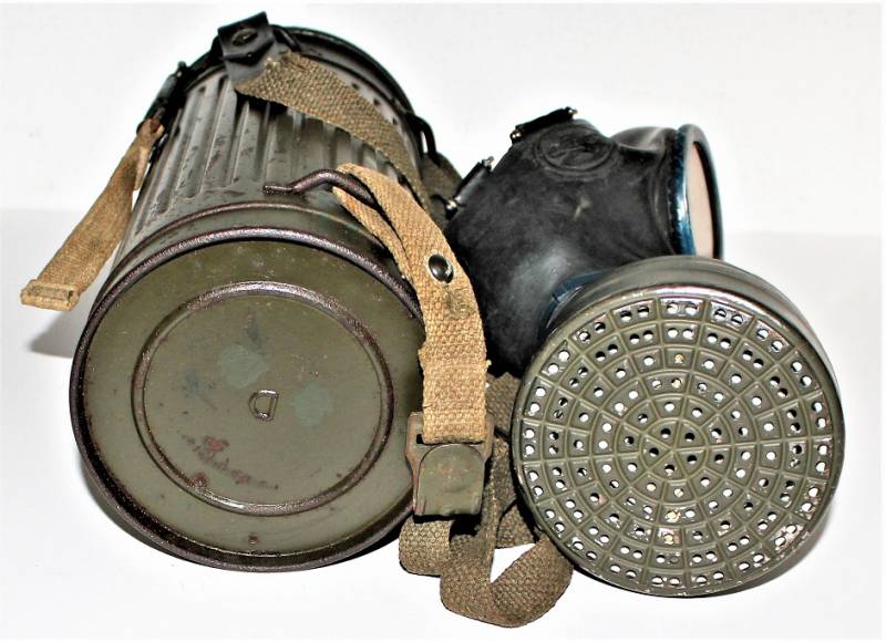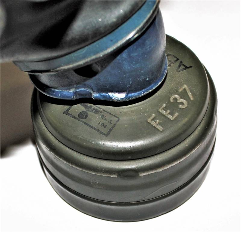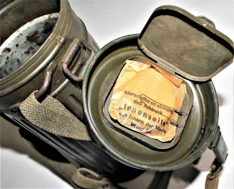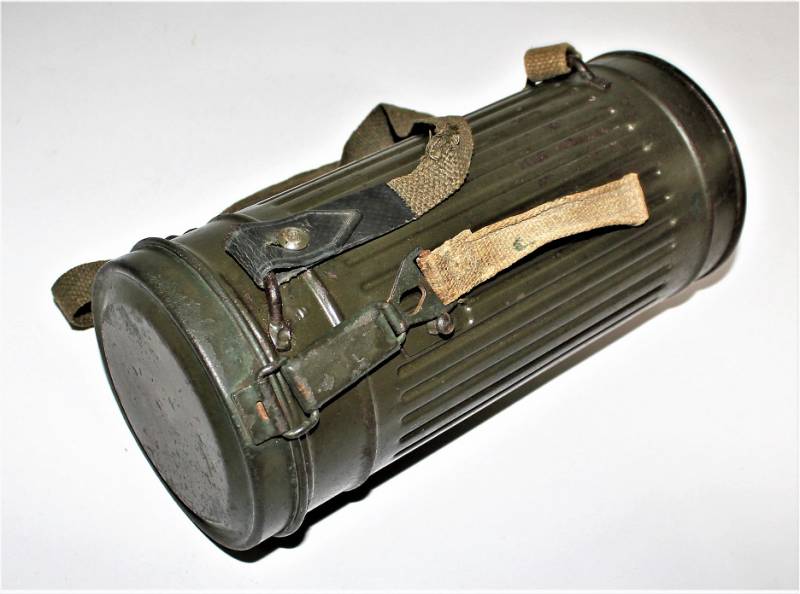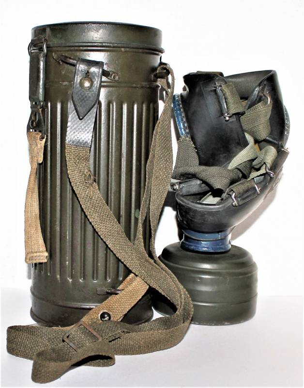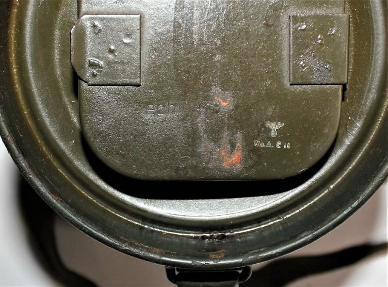 Gas mask born in 90% dark green color in excellent condition, not restored or repaired, with light signs of aging and use, complete in all its parts, including hemp strap and spare lenses. Internally marked with manufacturer code, waffenamt and date 1943. Original 100% WWII period.