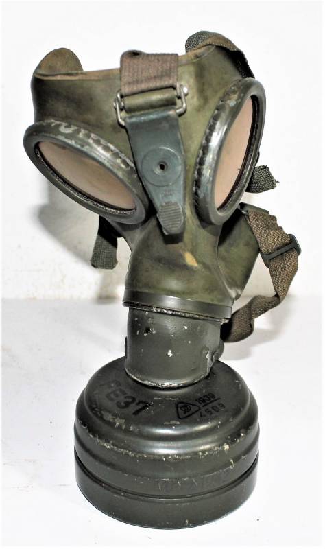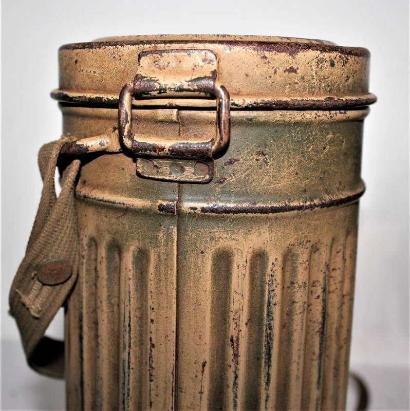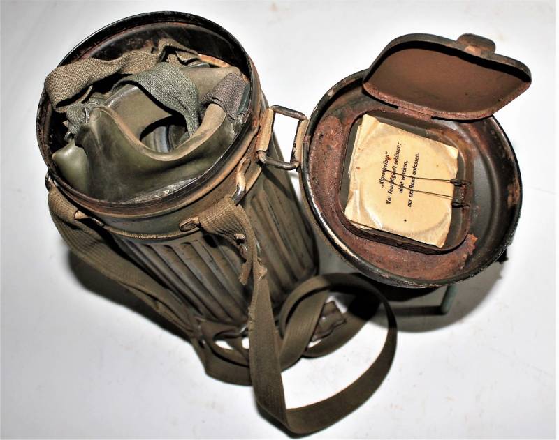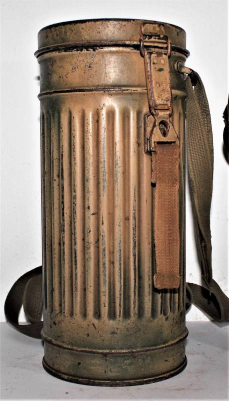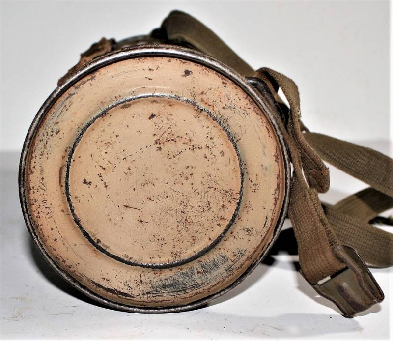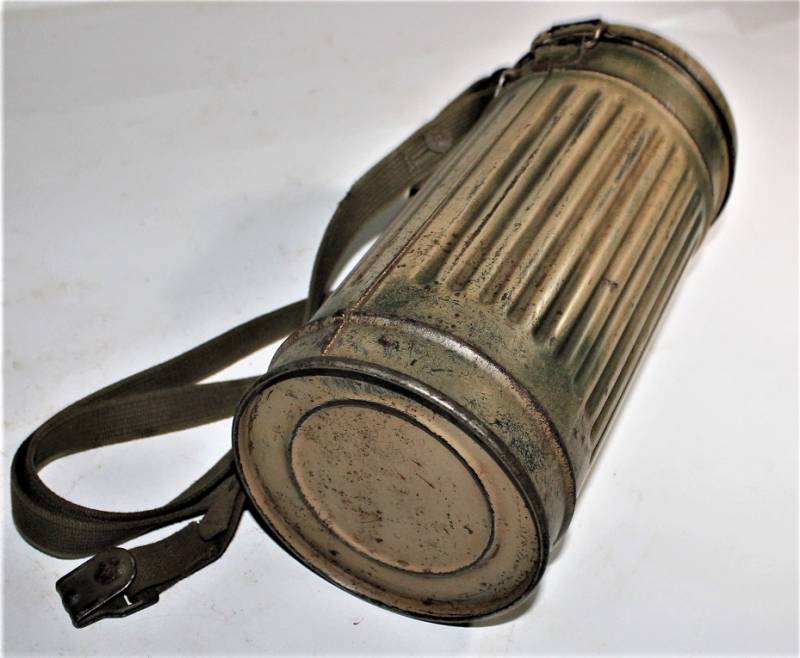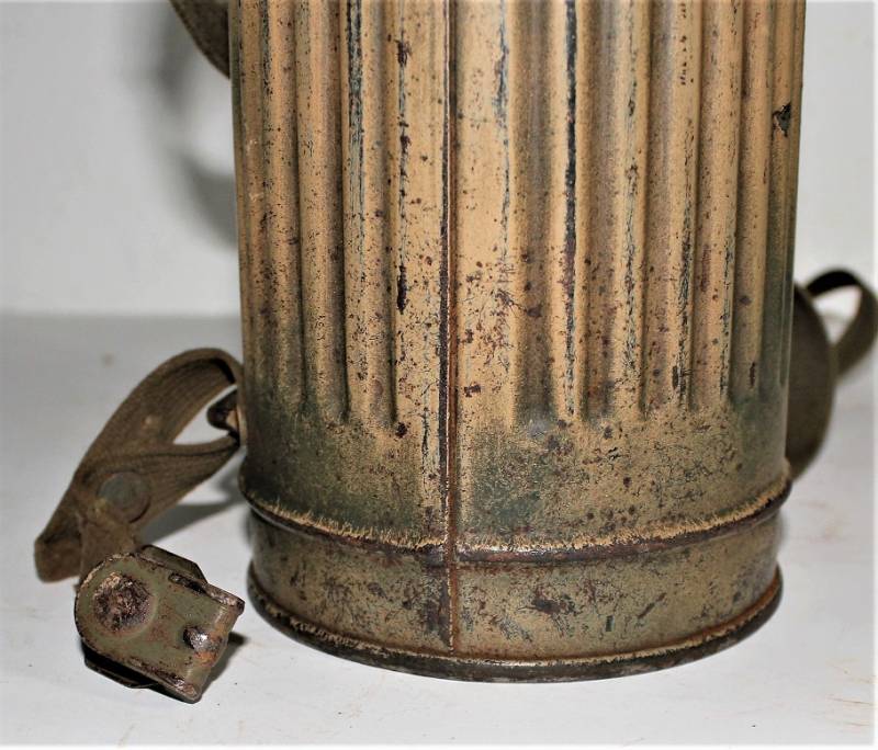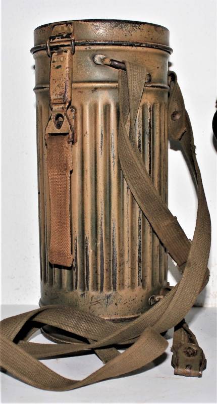 Yellow camouflage gas mask with green shades, likely in front of Northern Europe, very beautiful conditions, with patina of time and use, not restored or repaired, the camouflage color is about 85%, complete in all its parts, including the convas harness. Original 100% WWII period.