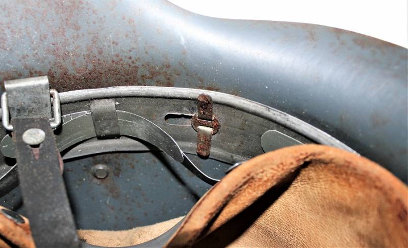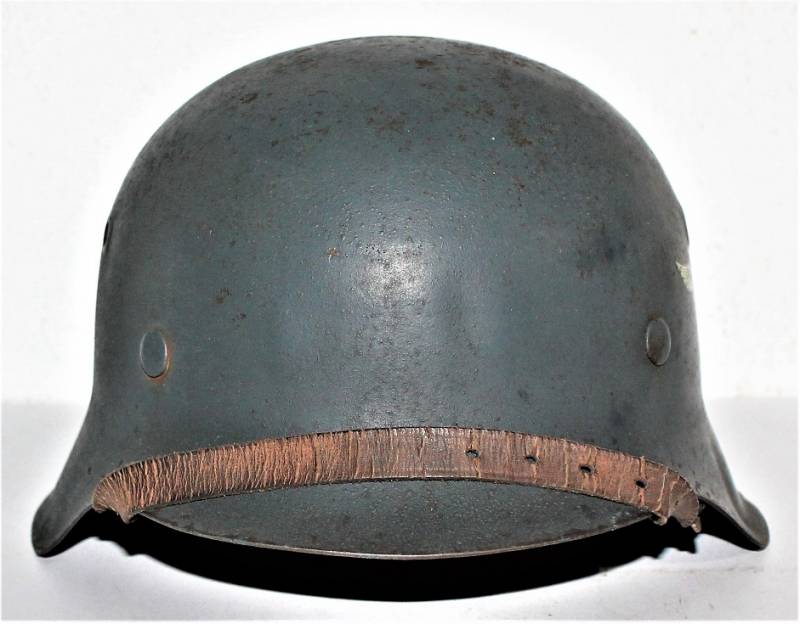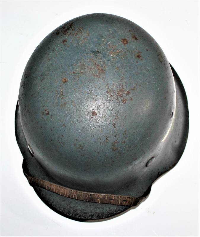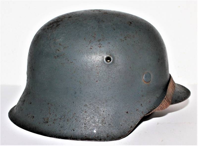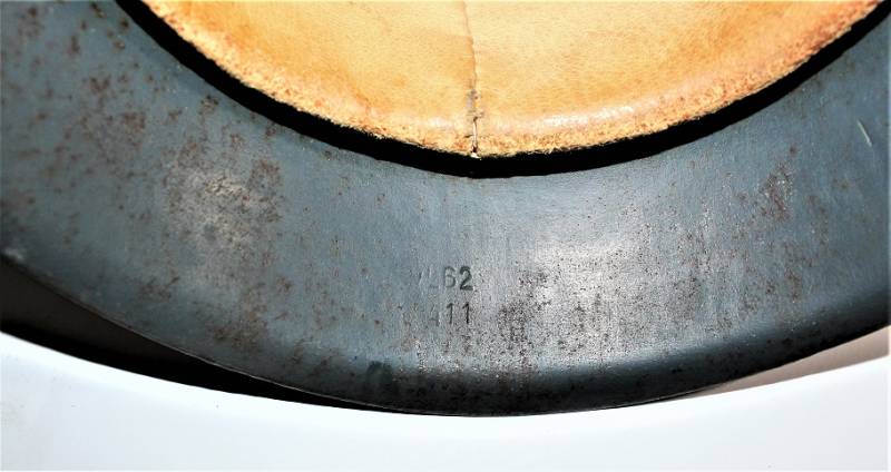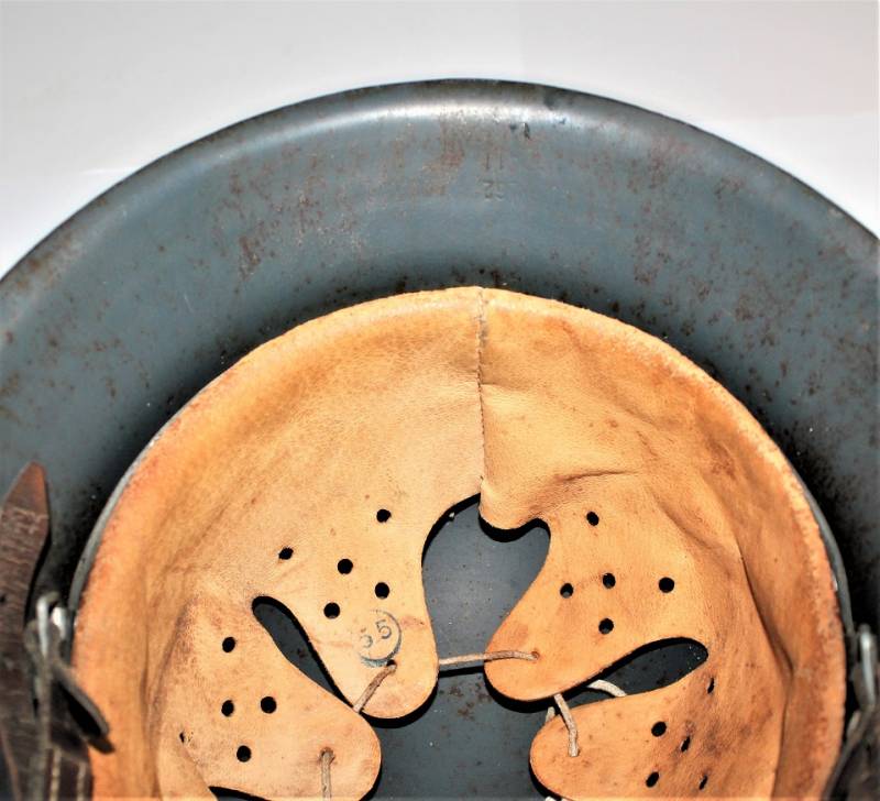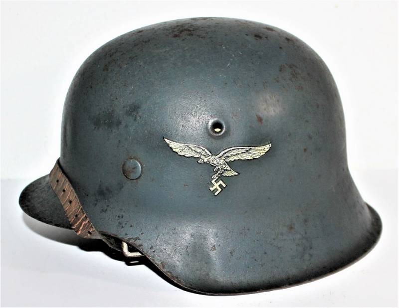 M42 helmet of the LW singoldekal in excellent condition, born in Luftwaffe blue color, not restored or repaired and never disassembled, complete in all its parts, only light patina of time and use, color 85-90% decal 85-90 %, leather in excellent condition, not damaged, iron marked with manufacturer code, iron size 62 and lot number, leather size 55, chinstrap marked with manufacturer name and date 1942. Original 100% WWII period.