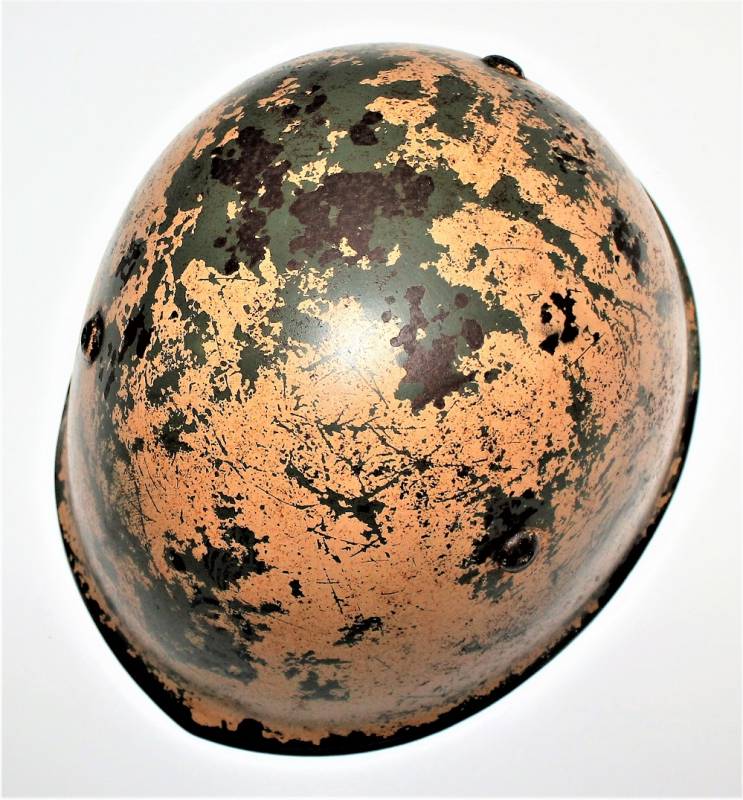Helmet model 33 R.E. with partially visible insigna of the Tank Infantry in 70% Afrika yellow camouflage color, beautiful condition, not restored or repaired, never disassembled, complete in all its parts with patina of time and use, excellent leather on the inside and no chin strap damaged, size 56, internally marked leather with Arsenali di Torino stamp.