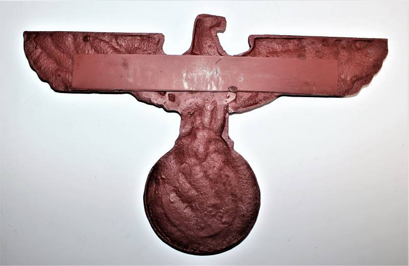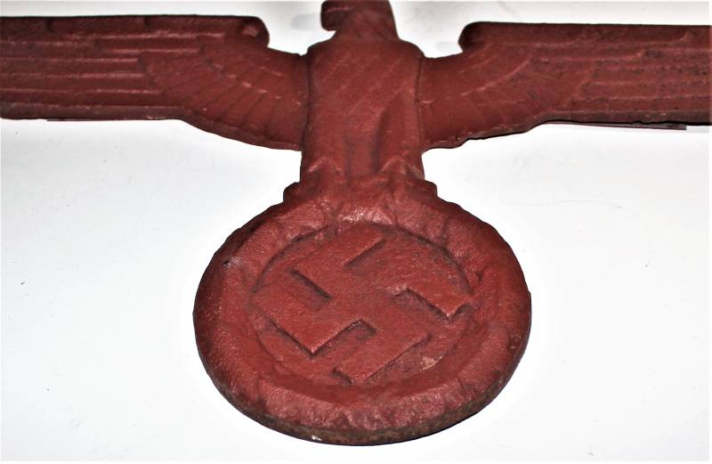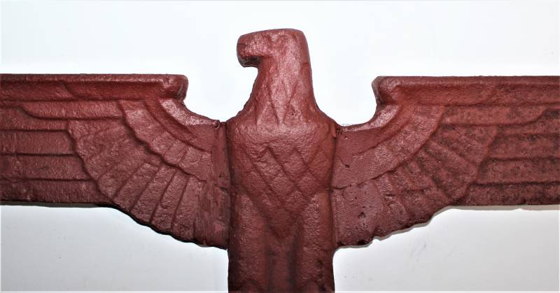 Wall eagle in cast iron, very worn, repainted with red color, the wings have been repaired and re-welded to the eagle´s body. Size about 40x25. 100% original WWII period.