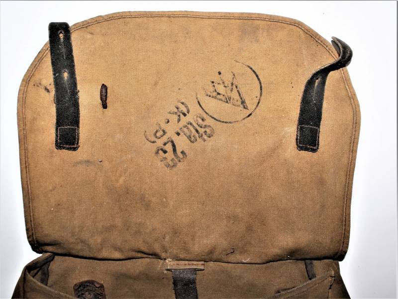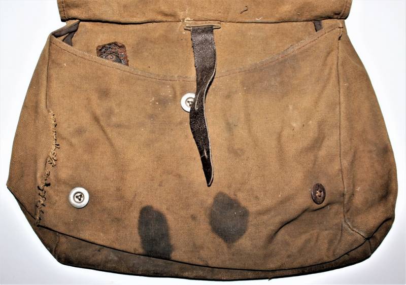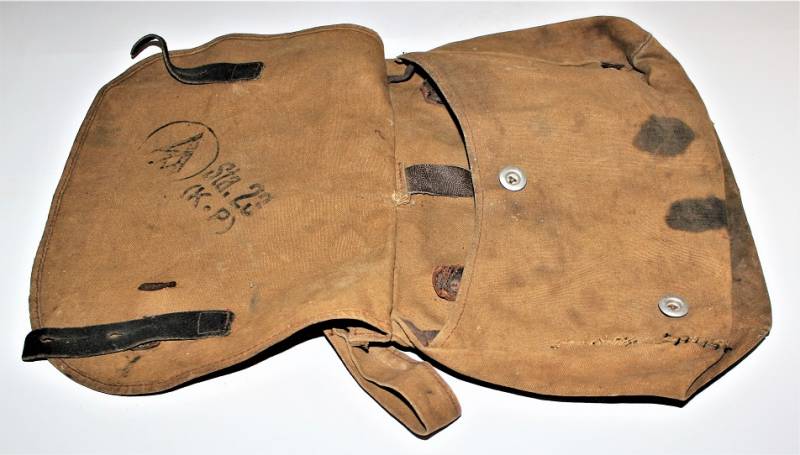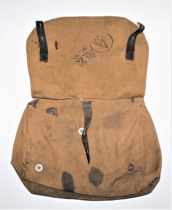 Bred bag M31 of the SA in cotton cloth, used and worn with patina of time and use, complete in all its parts except the belt, on the left side there is a repair of about 10 cm, internally marked with codes and symbol of the SA.
