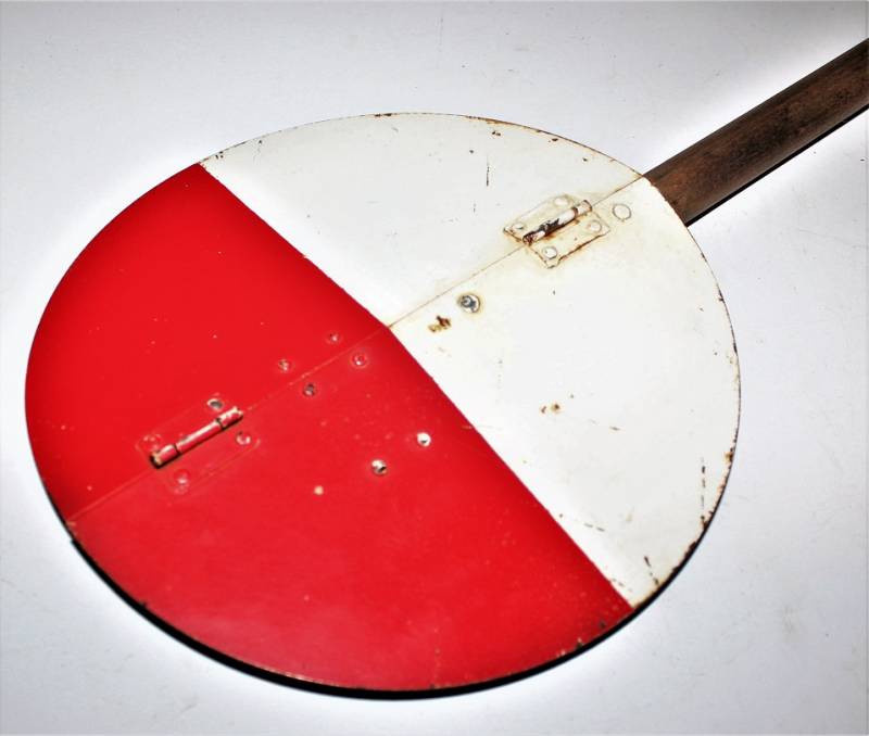 WH paddle Artillery signaling and communication folding hinged model in good condition, not restored or repaired, but with patina of time and use, in the regulatory colors red and white and panzergrau inner side, wooden grip riveted on the headstock.