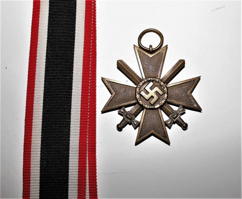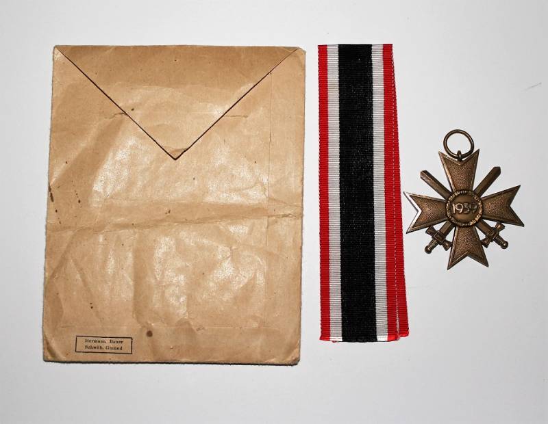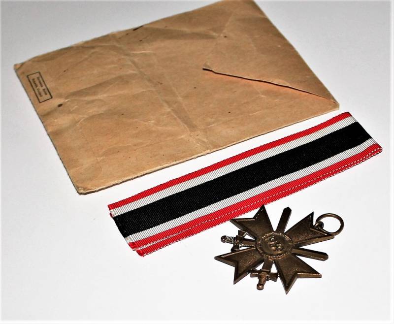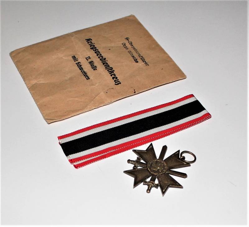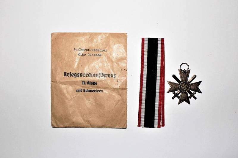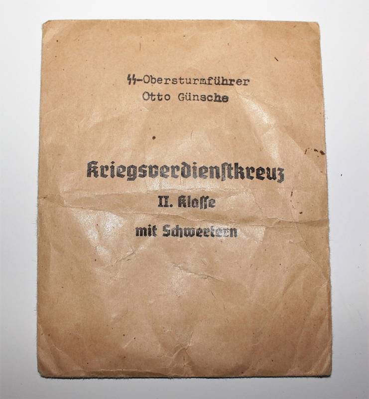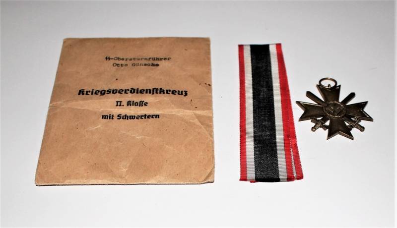 Medal cCross Merits of war with swords of 2nd class in perfect condition, complete with ribbon and its conferment envelope belonged to SS-OBERSTURMFUHRER OTTO GUNSCHE a personal assistant to Adolf Hitler, the machine-typed name and grade is engraved on the envelope. Original 100% WWII period.