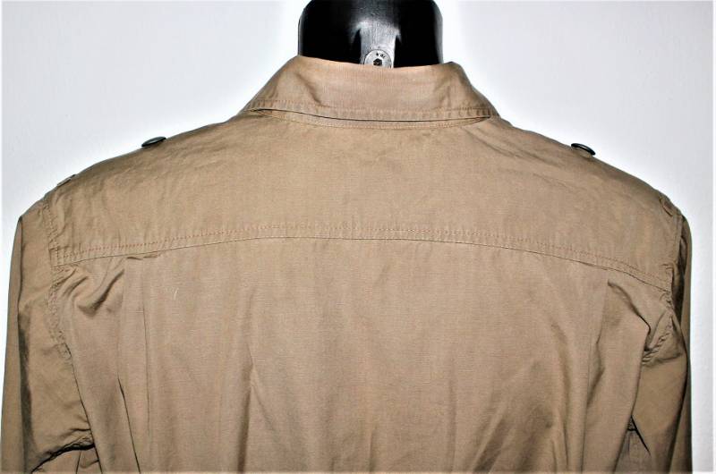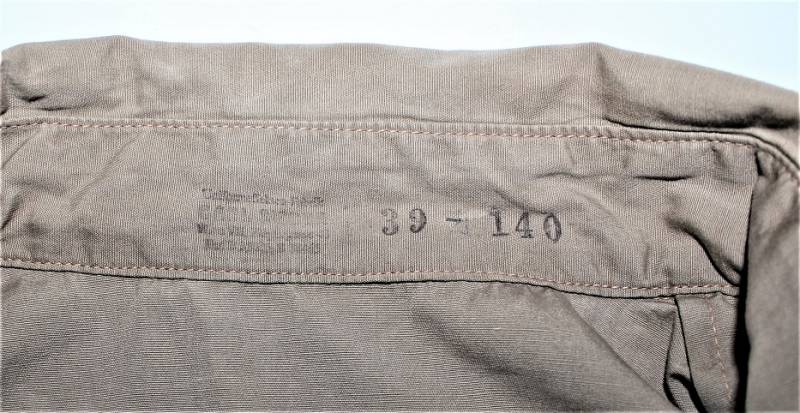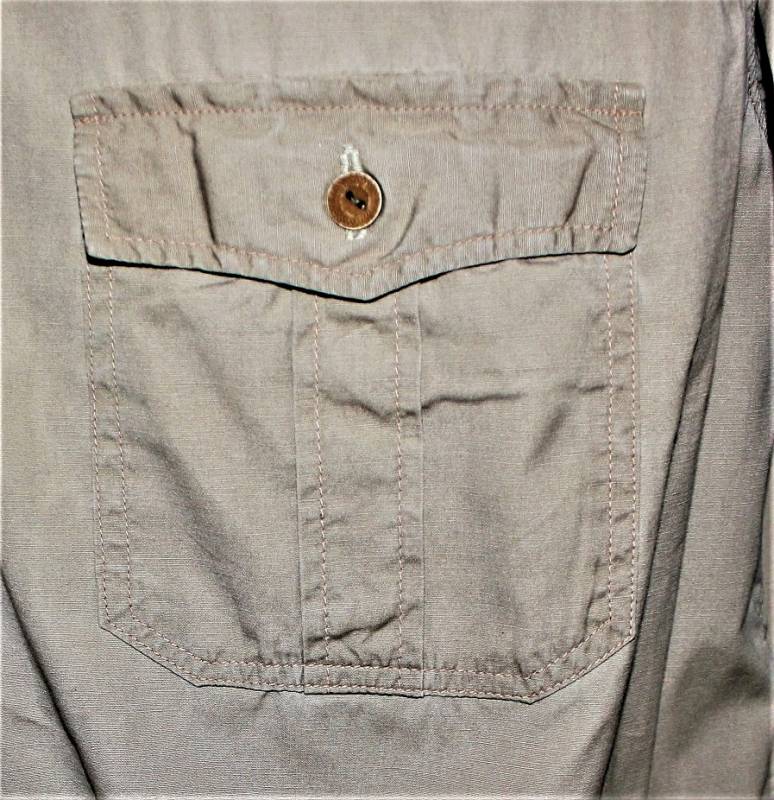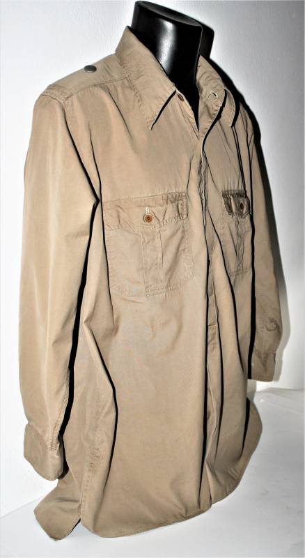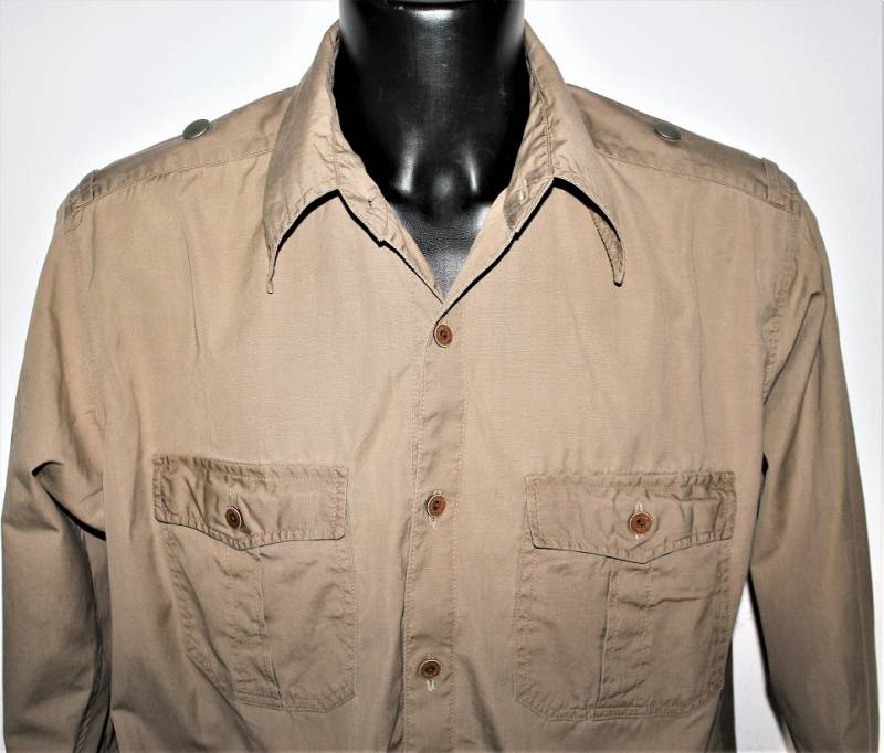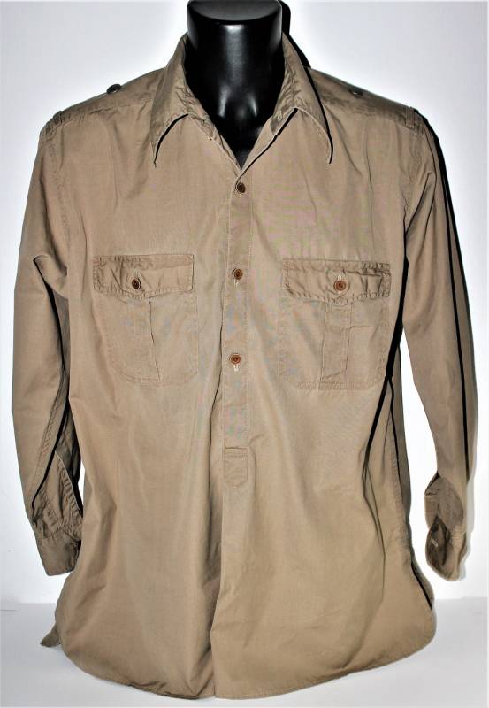 Stupenda camicia tropicale DAK WH-LW-SS nata in cotone in colorazione grigio-beige, condizioni perfette pari al nuovo, mai usata fondo di magazzino, completa di bottoni per spalline, marcata con nome del fabbricante e numeri taglia. Taglia grande circa 52. Originale 100% WWII periodo.