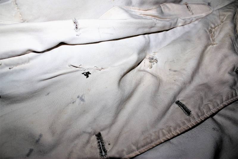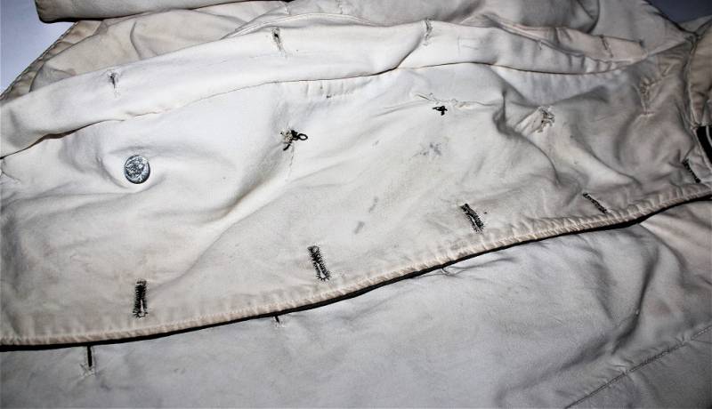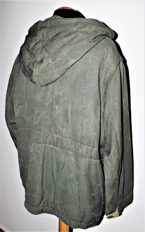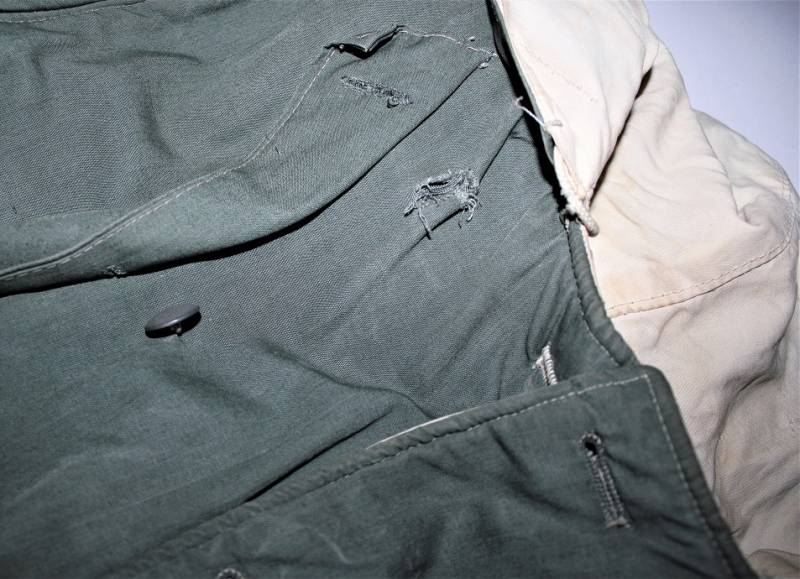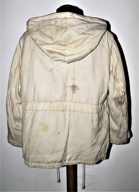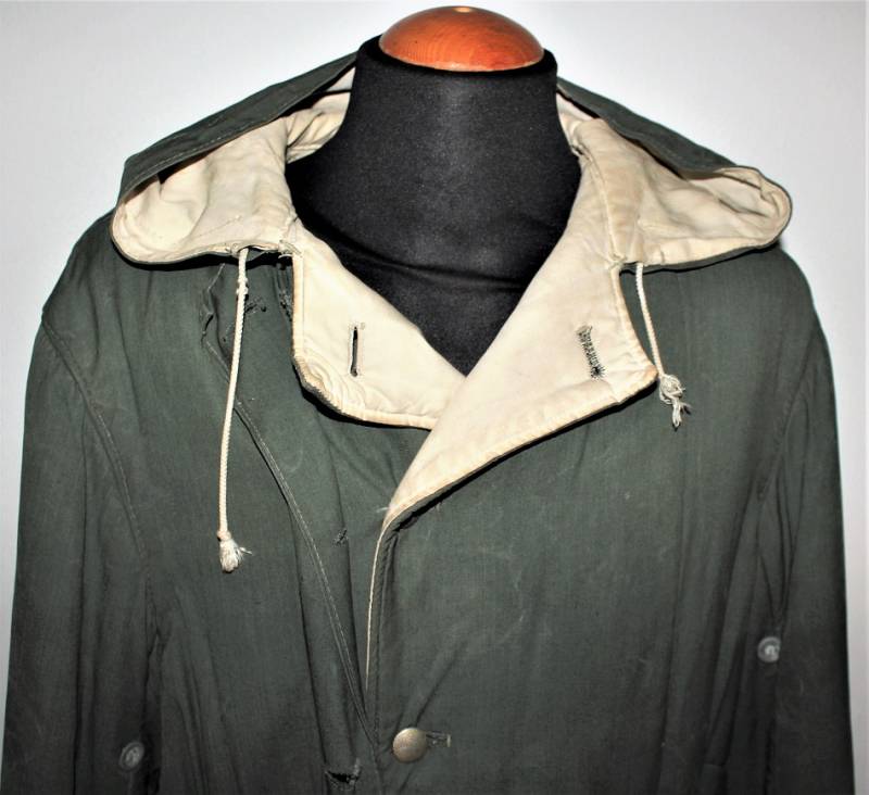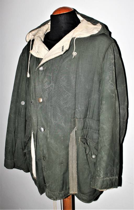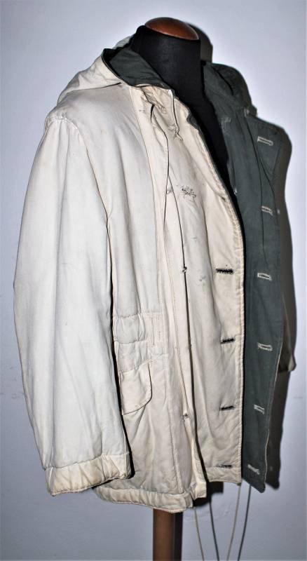 Giaccone reversibile due colori verde e bianco in discrete condizioni ma usato, molta patina del tempo e dellŽuso, sulla parte bianca mancano 4 bottoni e ci sono alcuni rammendi al posto dei bottoni, nel complesso ancora con molto fascino.