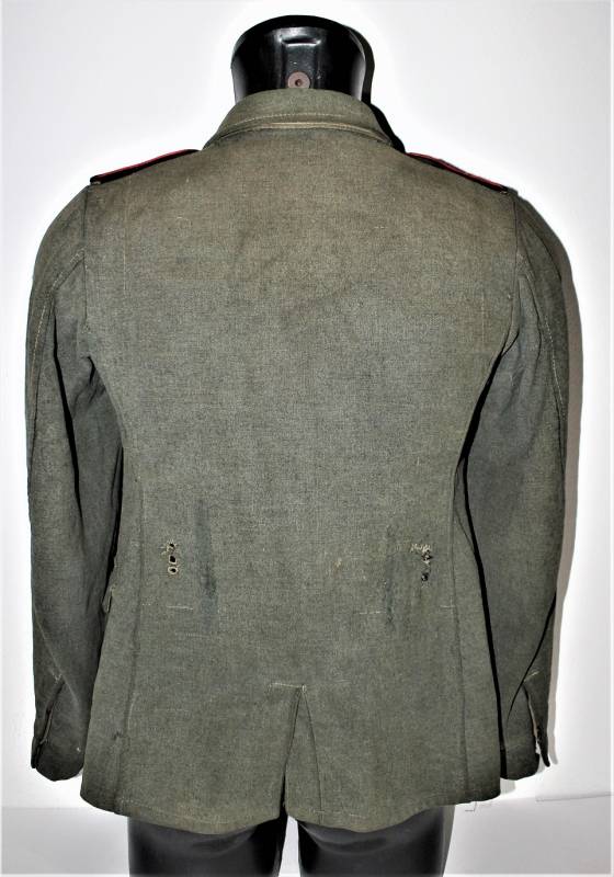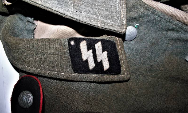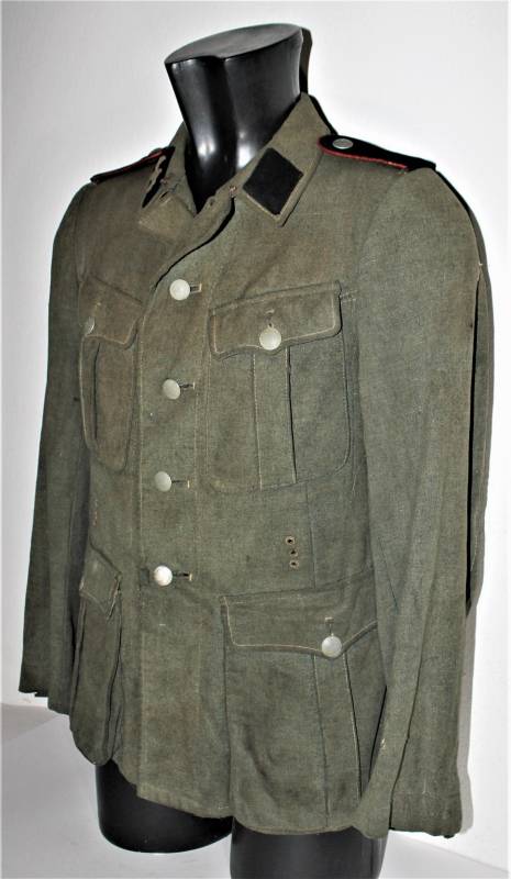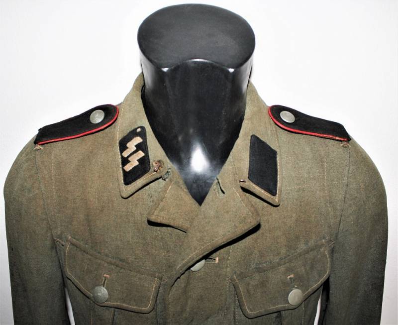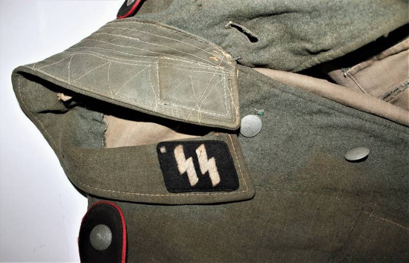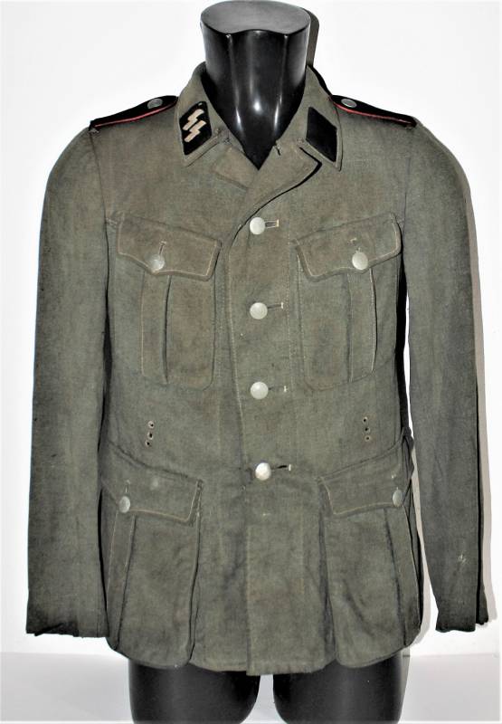 Giacca da truppa mod. M40 W.SS molto vissuta, completa di mostrine e spalline montate in epoca, è mancante dell´aquila sulla manica di cui si vede ancora la traccia, sono presenti diversi piccoli strappi e rammendi e il panno è molto usurato ma nel complesso ha ancora il suo fascino, internamente sulla fodera sono ben evidenti le marcature delle taglie e la sigla B41.