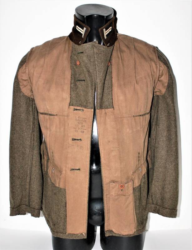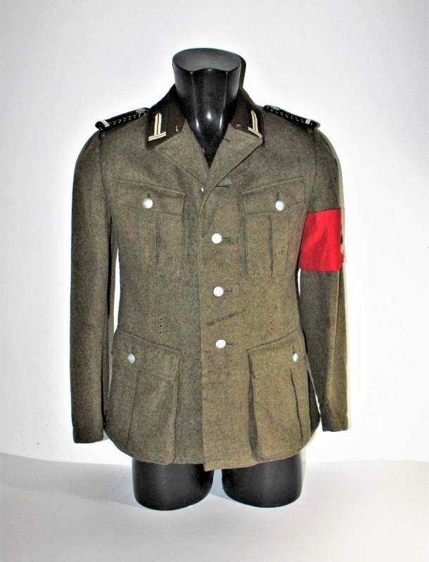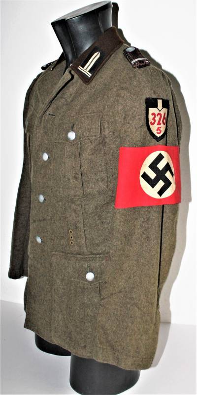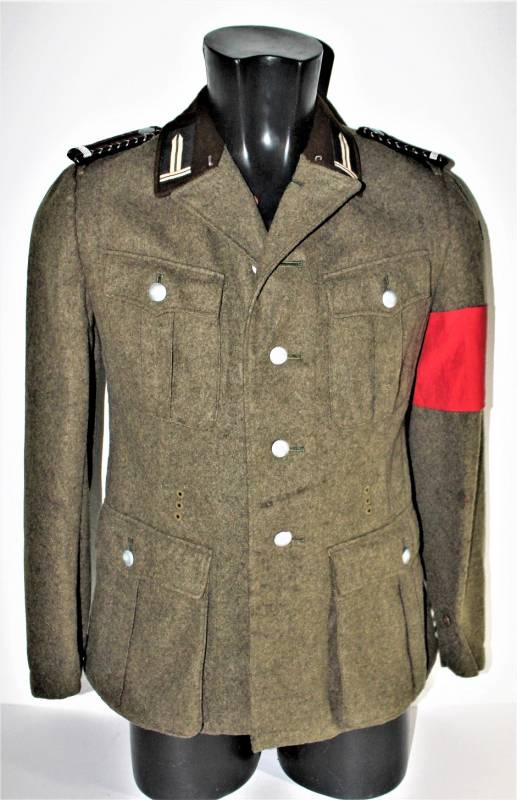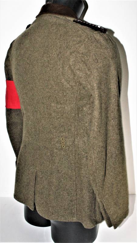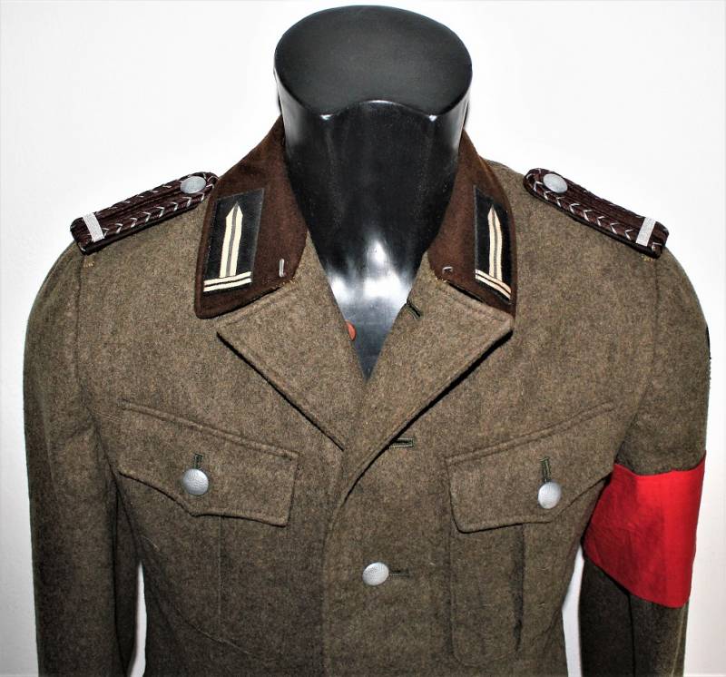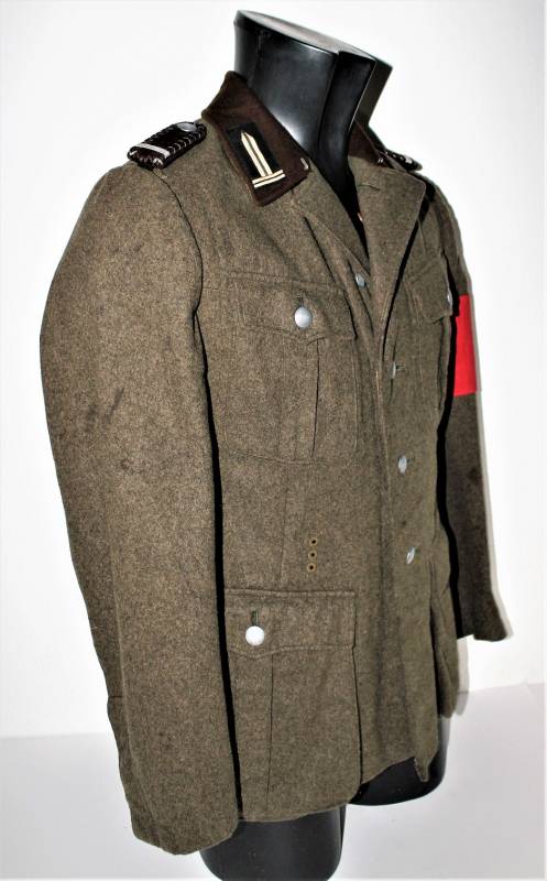 Giacca M36 da Sottufficiale della RAD in ottime condizioni e completa in ogni sua parte, non restaurata o riparata, nata in panno di lana marrone tipico della RAD, completa di tutta la sua mostreggiatura montata in epoca, il tutto solo con leggera patina del tempo, in alcuni punti sono presenti tracce di tarme ma non buchi, marcata internamente con nome del fabbricante, data 1939, numeri di taglia e marchi RAD.