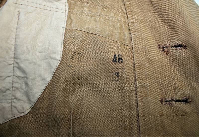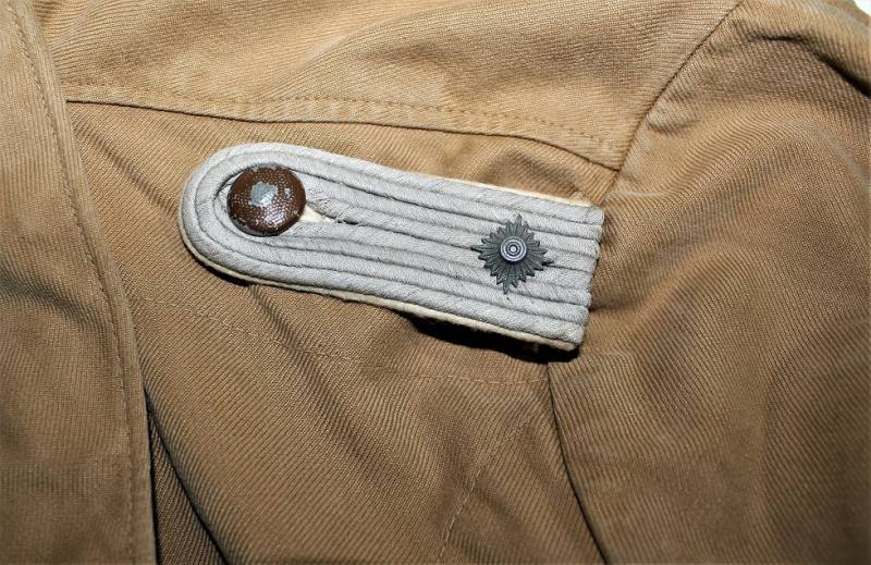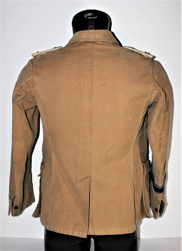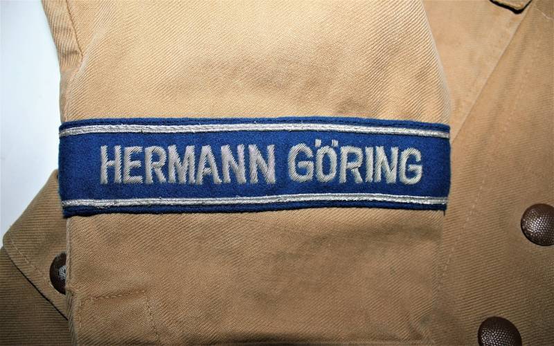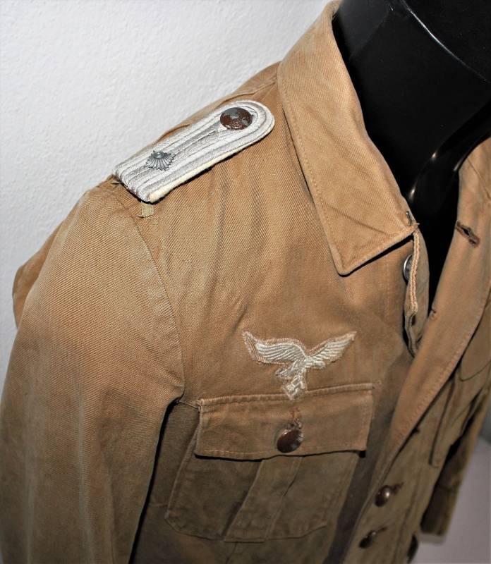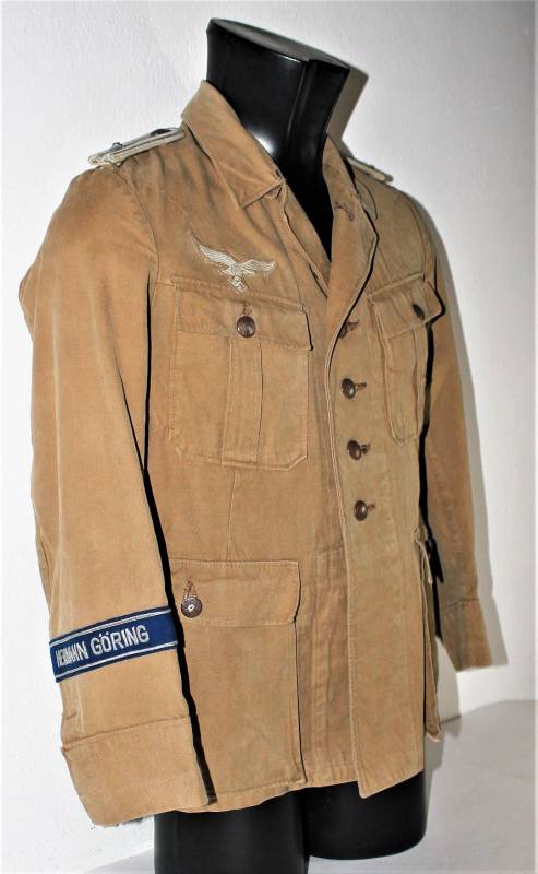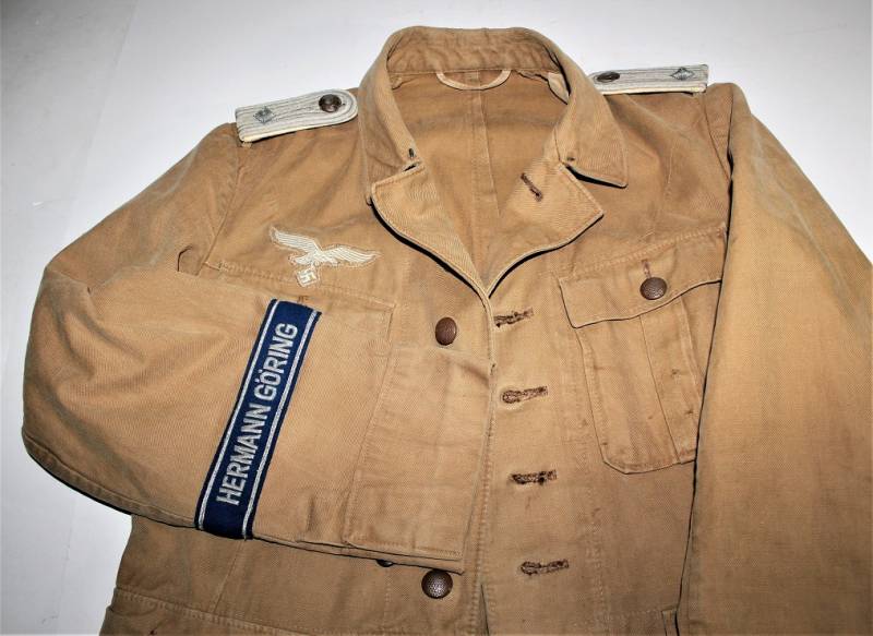 Stupenda giacca Tropicale Luftwaffe Divisione Hermann Goering da Ufficiale nel grado di Tenente, condizioni ottime, non restaurata o riparata senza buchi o strappi e con cuciture perfette, solo con leggerissima patina del tempo, completa di tutta la sua mostreggiatura montata in epoca compresa la sua fascetta Hermann Goering.