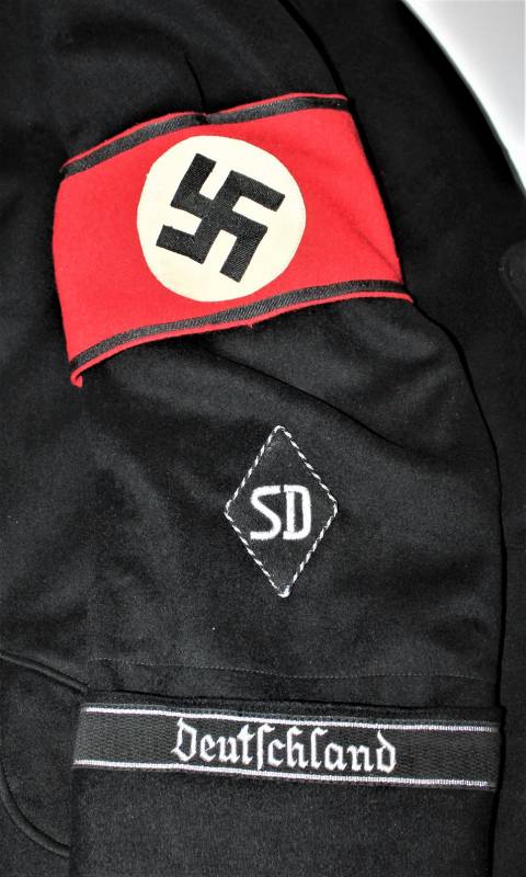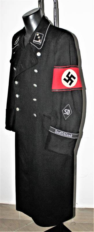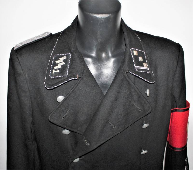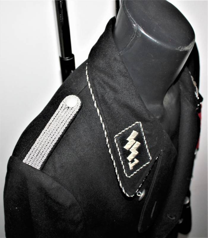 Tutta la mostreggiatura del cappotto, spalline, mostrine, aquila e fascia Divisionale DEUTFCHLAND sono montati in epoca, sulle spalline sono presenti i monogrammi argentati Divisionali, tutta la mostreggiatura è ricamata in filo metallico argentato (canottiglia), sulla manica sinistra è presente la fascia da braccio anch´essa montata in epoca, completa della sua etichetta in carta con i marchi d´accettazione RZM...