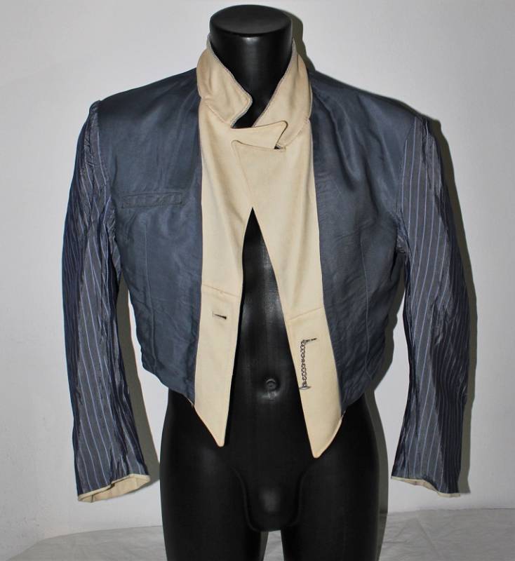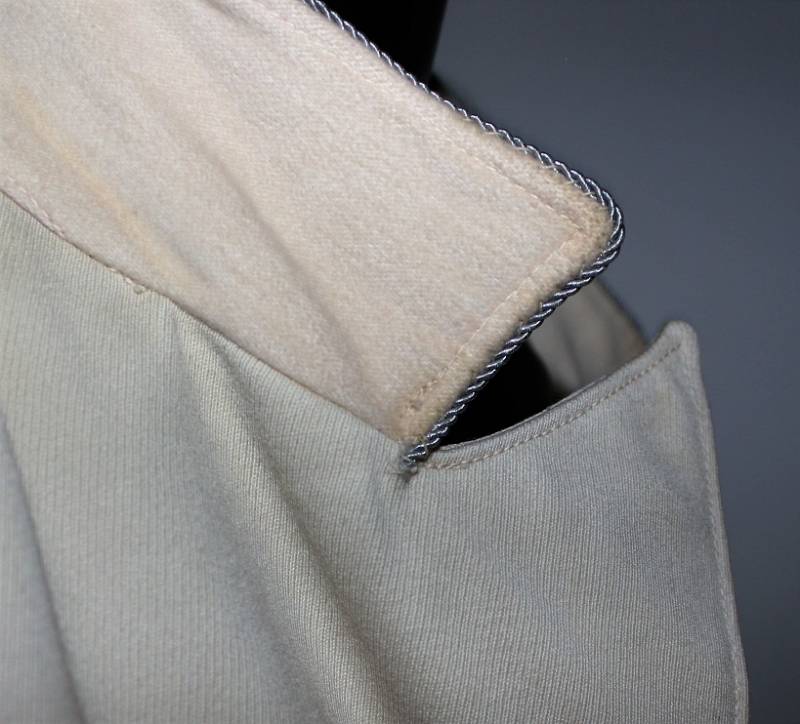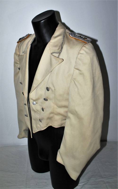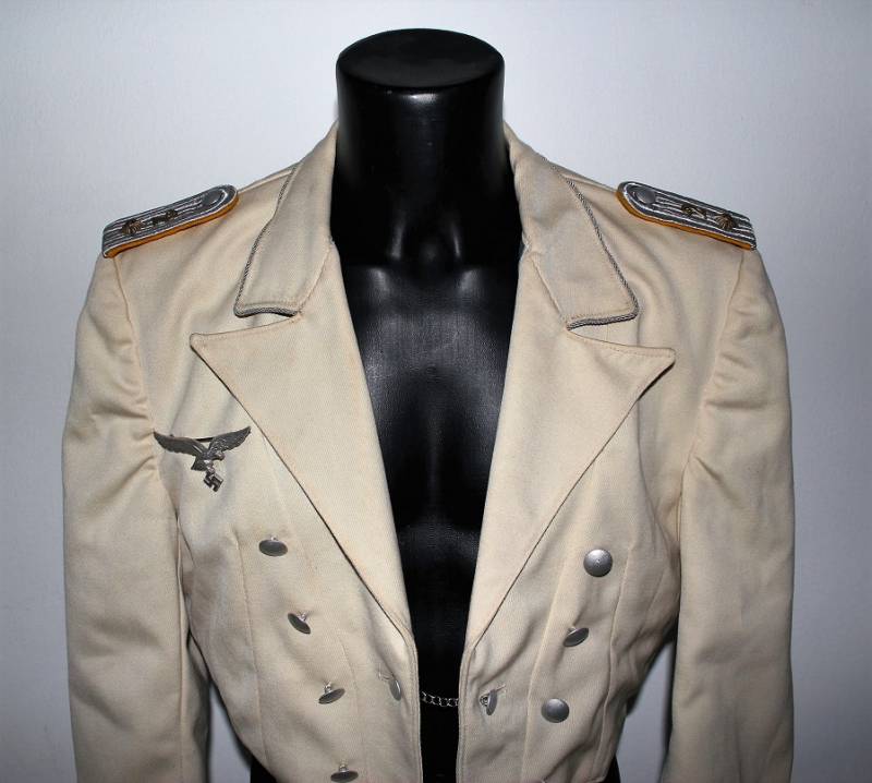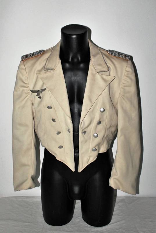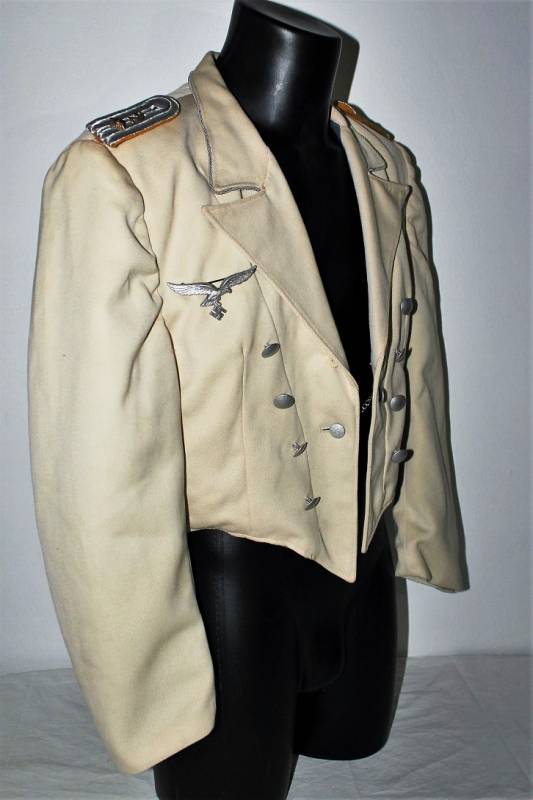 Giacchino LW bianco da sera e da gala in ottime condizioni, leggerissimi segni del tempo e dellŽuso, senza buchi, strappi o riparazioni, nato in gabardina diagonale colore bianco panna, allŽinterno sulla fodera è stata tolta lŽetichetta della sartoria, completo di tutta la sua mostreggiatura originale dŽepoca. Taglia circa 48. Originale 100% WWII periodo.