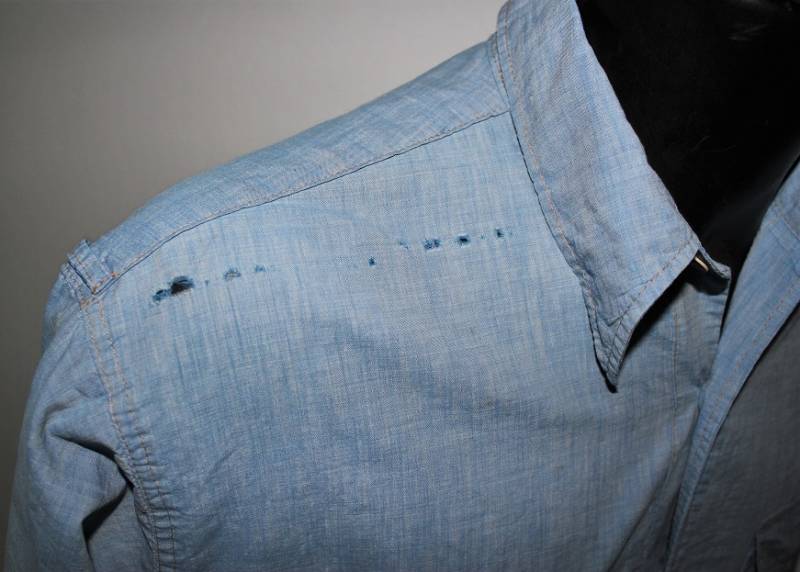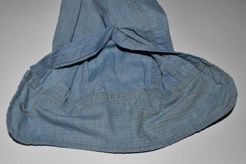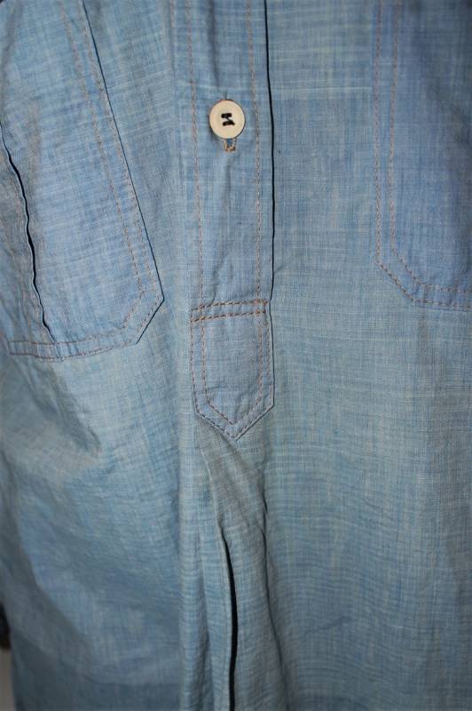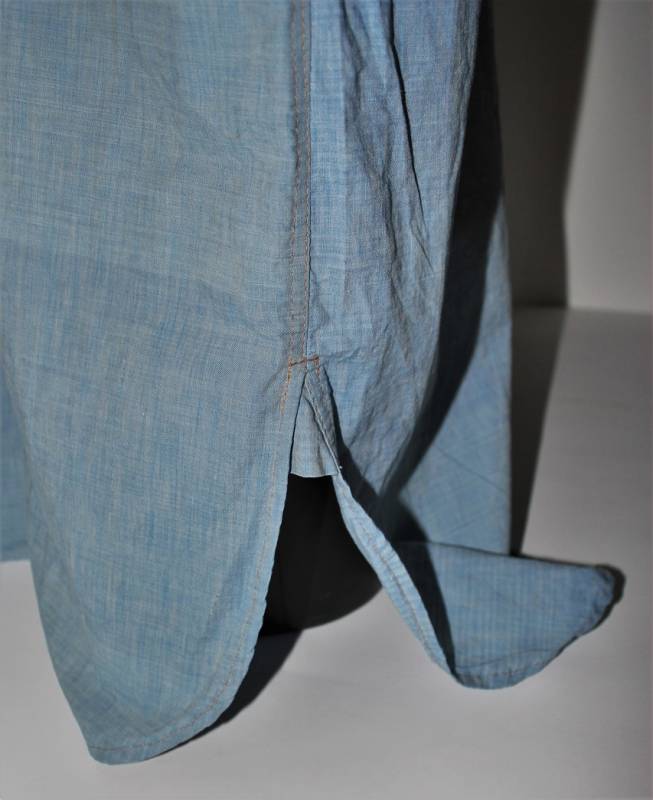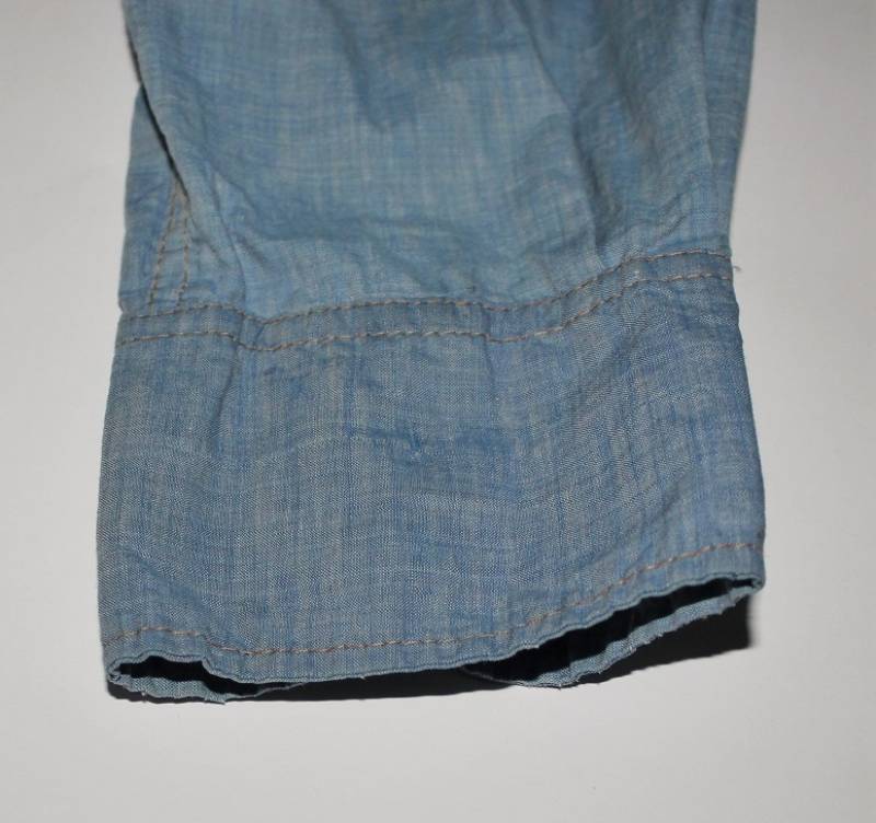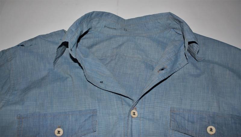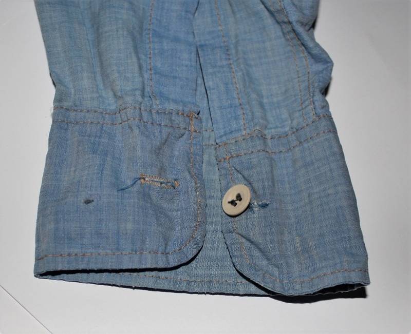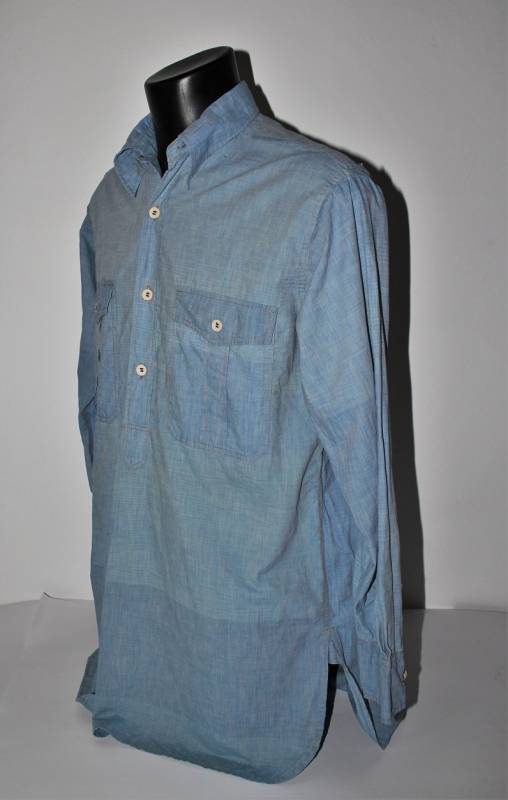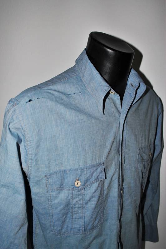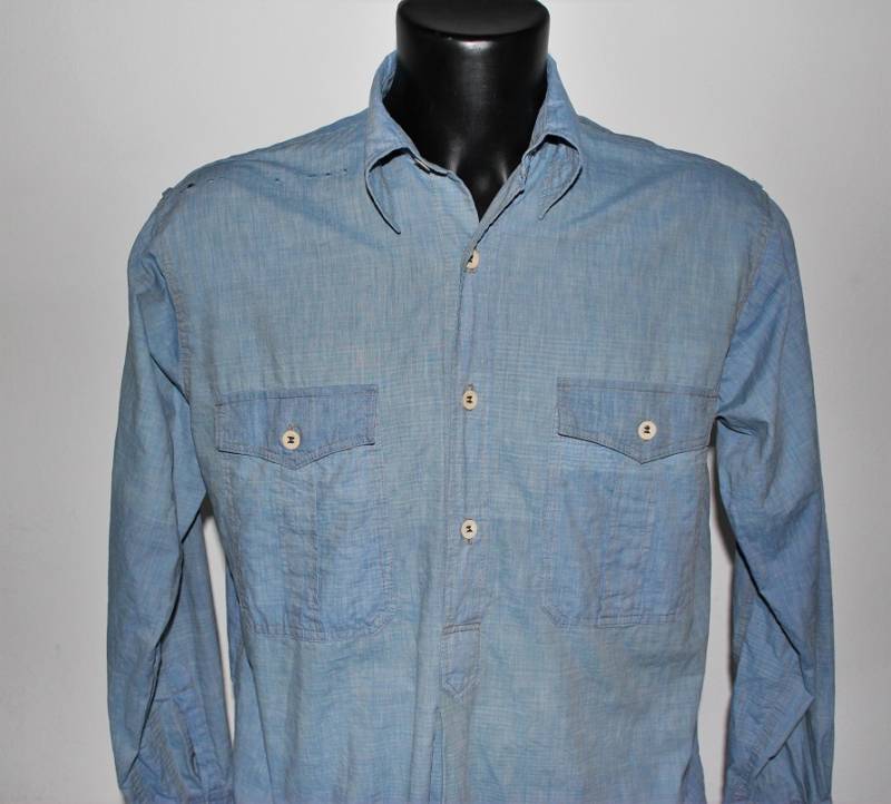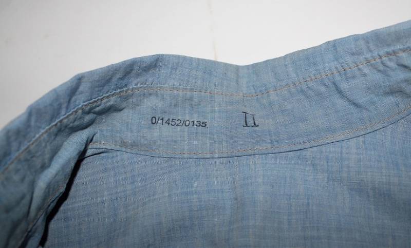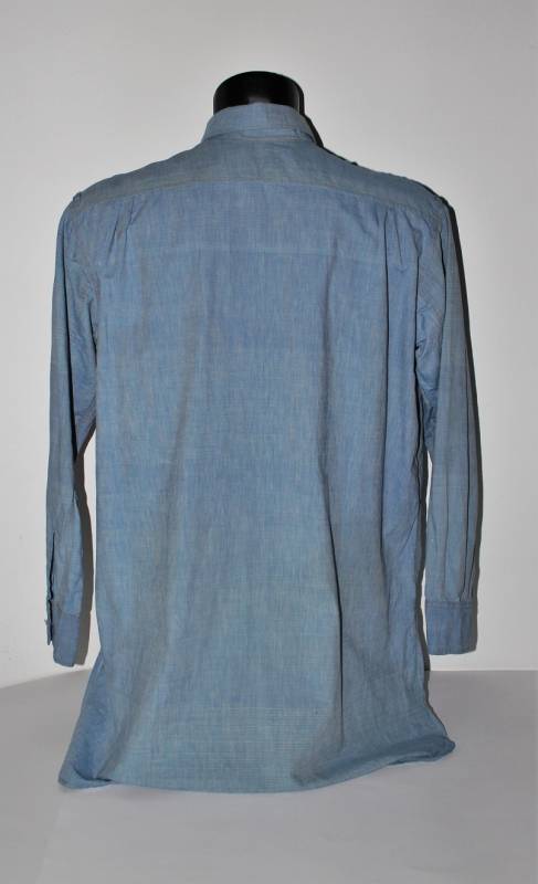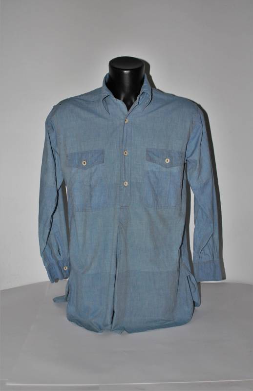 Camicia di servizio della LW in cotone blu, condizioni buone, con patina del tempo e dellŽuso, completa in ogni sua parte, piccole lesioni sulla spalla destra, marcata internamente sul colletto con numeri di lotto e taglia (II). Taglia circa 50. Originale 100% WWII periodo.