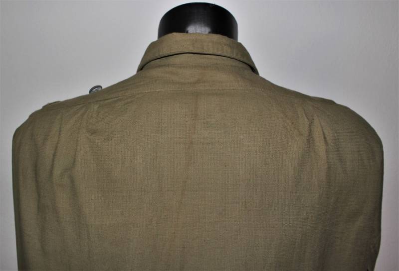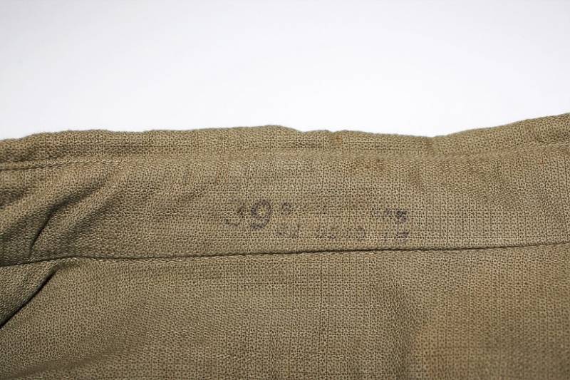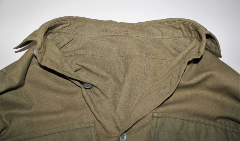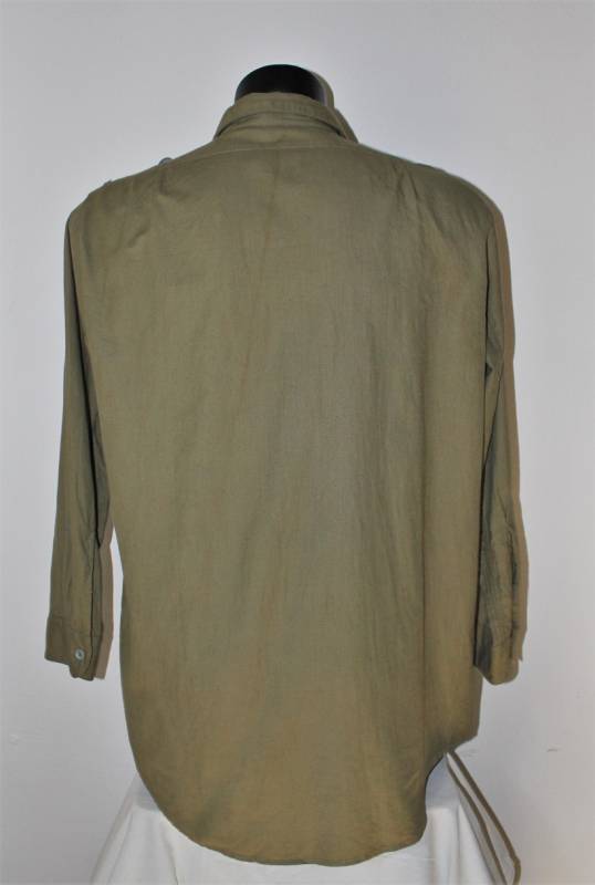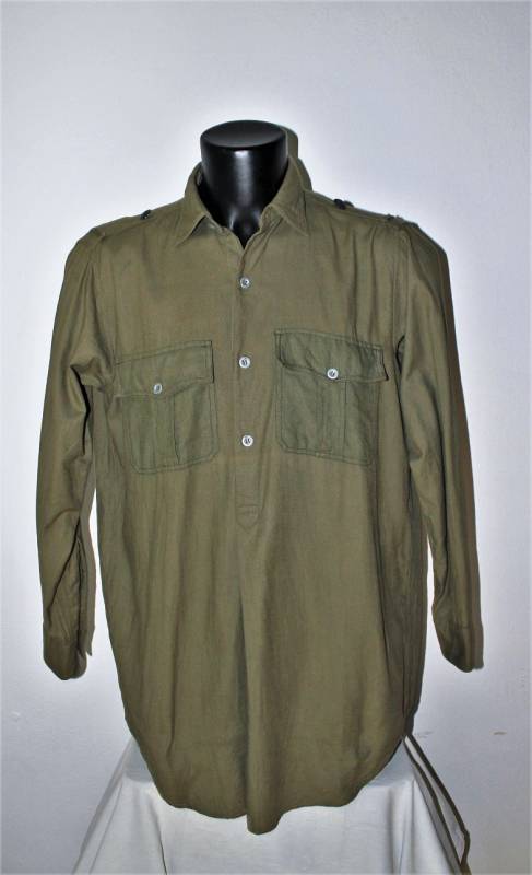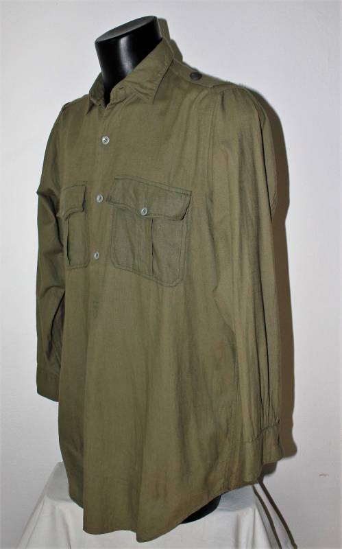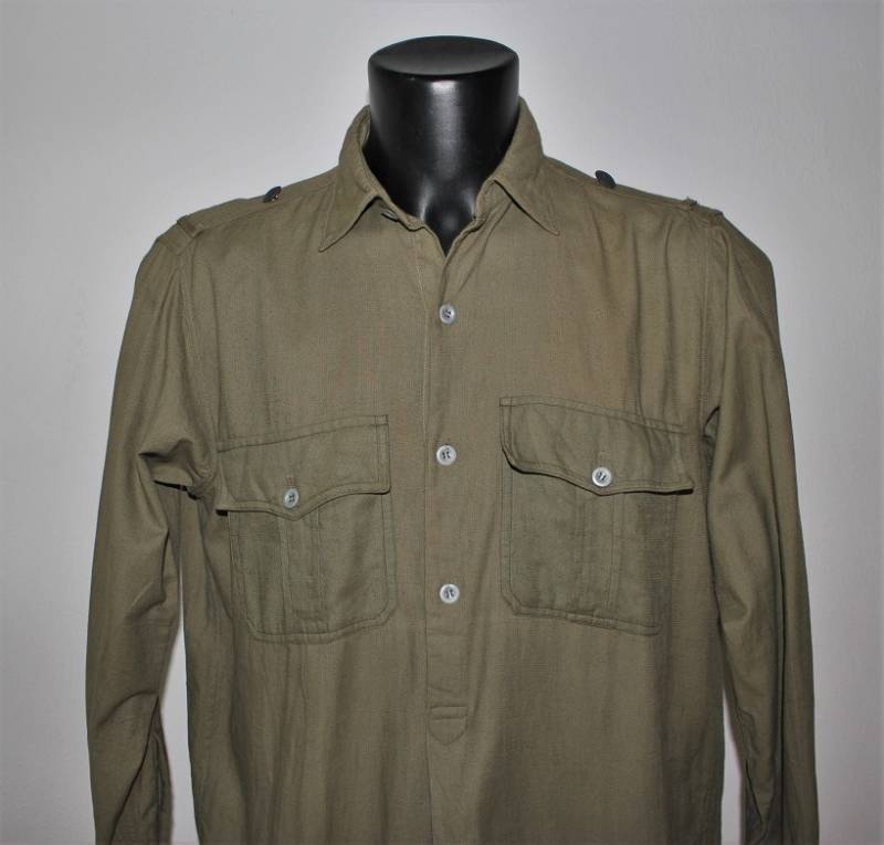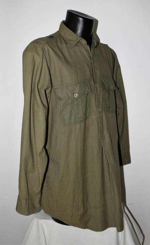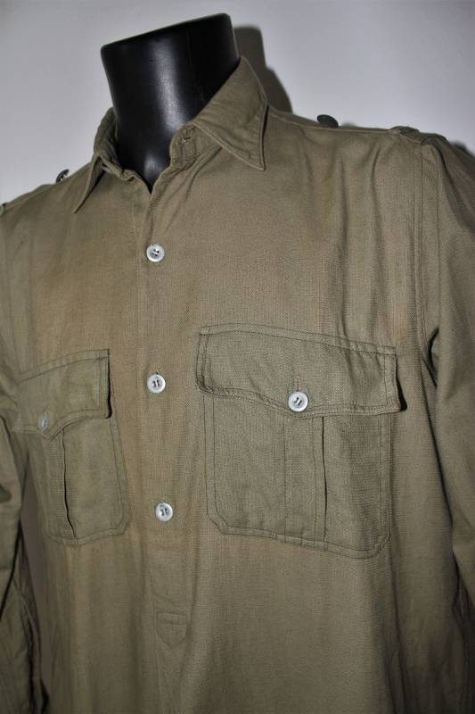 Camicia di servizio in cotone a maniche lunghe in dotazione a tutti i reparti WH-SS-LW in condizioni pari al nuovo, mai usata, fondo di magazzino, marcata internamente sul colletto con fabbricante e taglia circa 50 (39). Originale 100% WWII periodo.