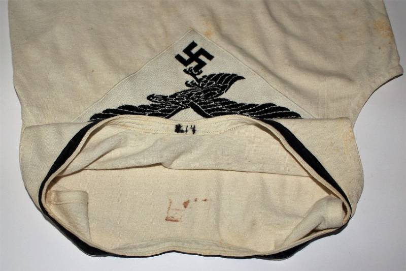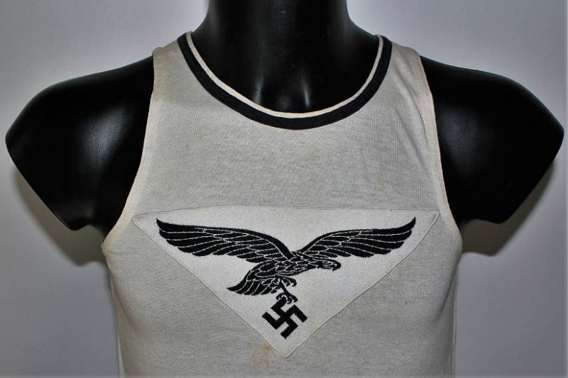 Canottiera in cotone bianco sportiva per la Luftwaffe con emblema cucito a macchina sul petto, condizioni ottime con leggera patina del tempo e dellŽuso, ma sana senza buchi o strappi. Taglia circa 46-48. Originale 100% WWII periodo.