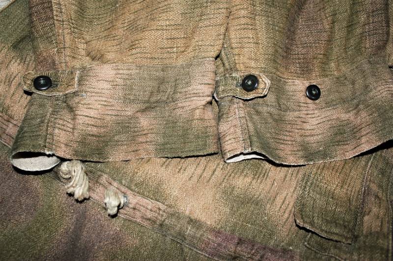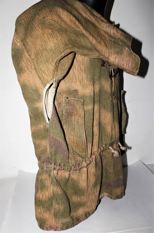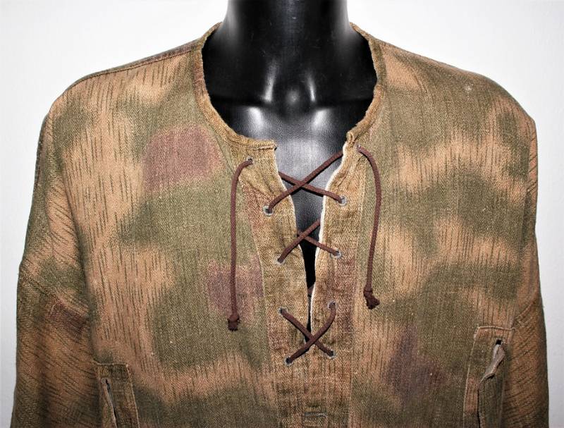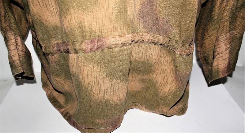 Spolverina mimetica Luftwaffe M43 in stoffa drillick, in ottime condizioni, completa in ogni sua parte, non restaurata o riparata, con leggerissimi segni del tempo e dellŽuso, quasi pari al nuovo, marcata con RBN N..., taglia G2 e L.B.N.43. Originale 100% WWII periodo.