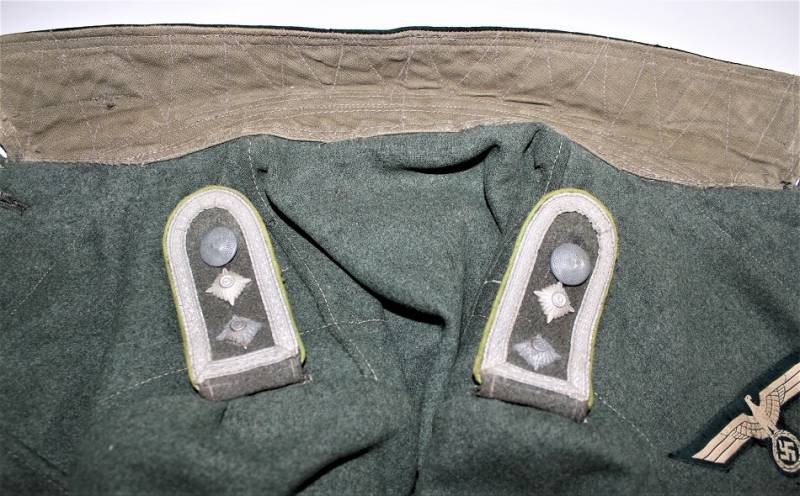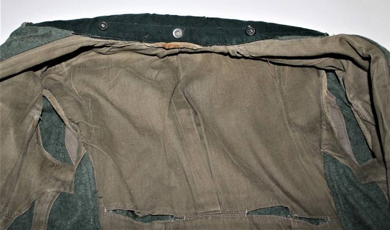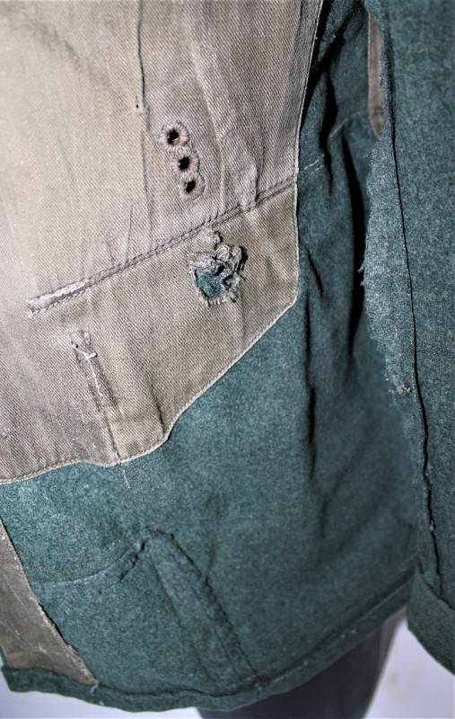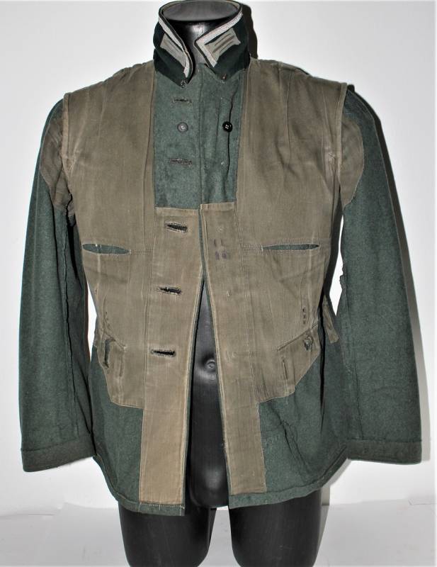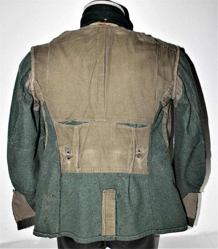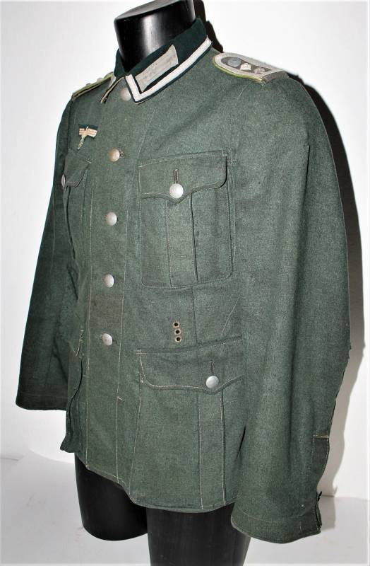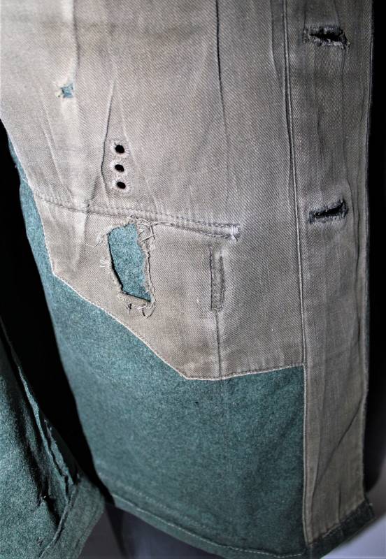 Giacca M36 da Sottufficiale della WH Panzergrenadier waffenfarbe verde mela, condizioni molto usate con alcuni buchi rammendati e due toppe sulle maniche, ma non modificata, completa di tutta la sua mostreggiatura montata in epoca, all´interno s´intravede le marcature delle taglie, vissuta ma molto suggestiva. Originale 100% WWII periodo.