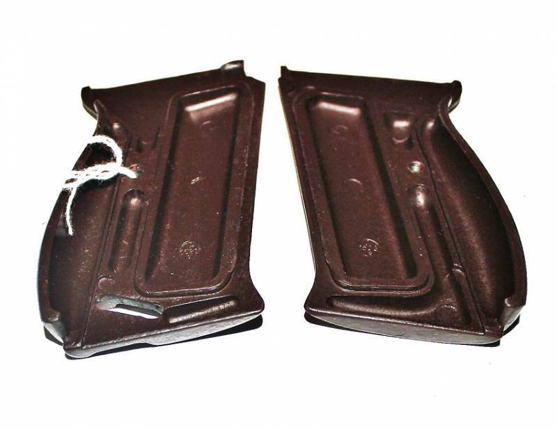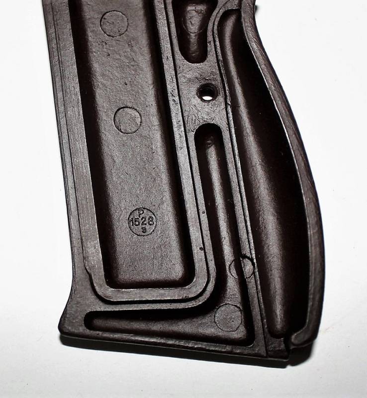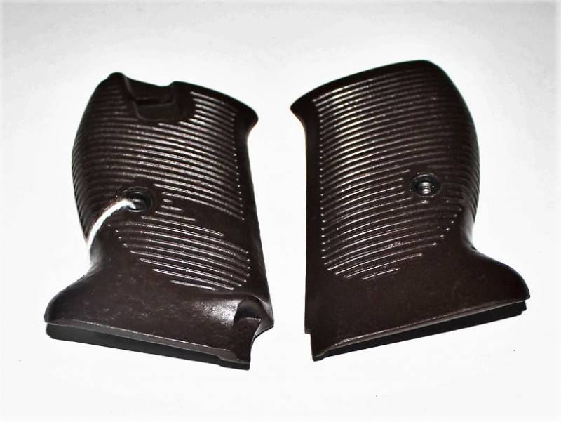 Coppia di guancette in bakelite marrone-rossa per pistola Walther P38, in condizioni perfette, mai usate, marcate internamente con codice. Originale 100% WWII periodo.