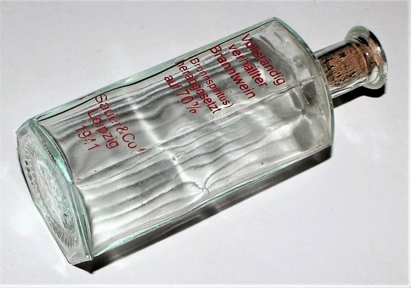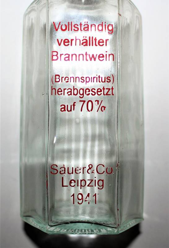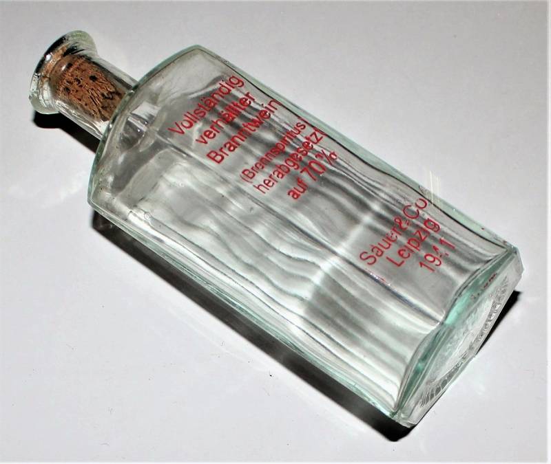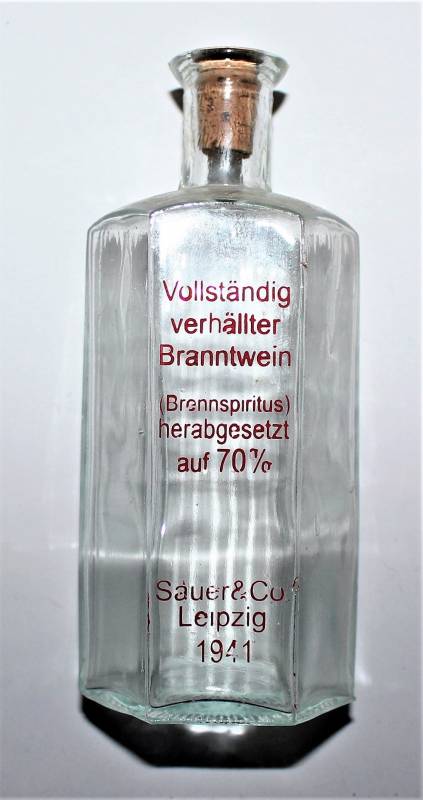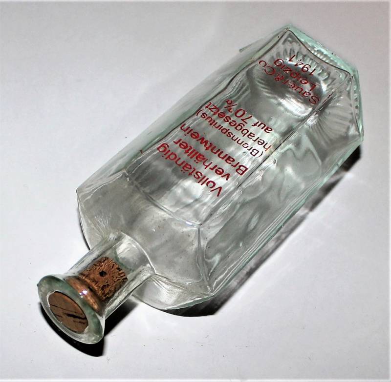 Piccola bottiglia per contenitore acquaviti o spiriti denaturati al 70% in ottime condizioni pari al nuovo, marcata con fabbricante e data 1941.