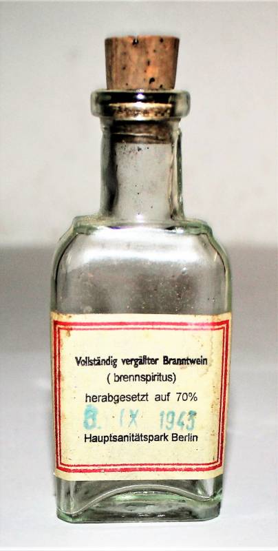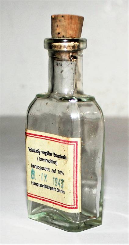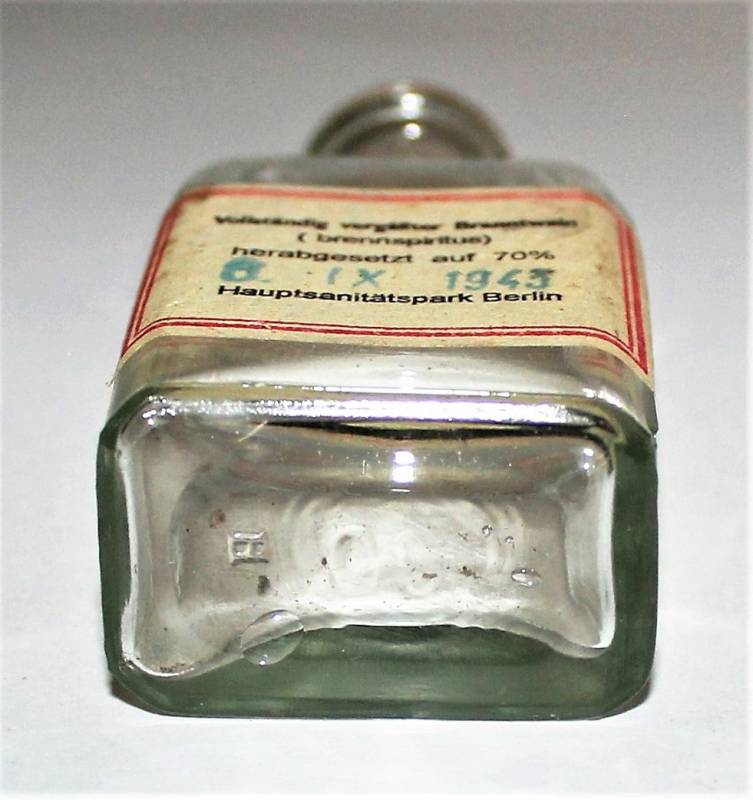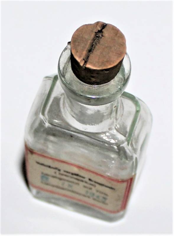 Piccola bottiglia per contenitore in vetro per spiriti-alcol in ottime condizioni pari al nuovo, datata 6 Settembre 1943.
