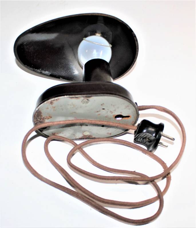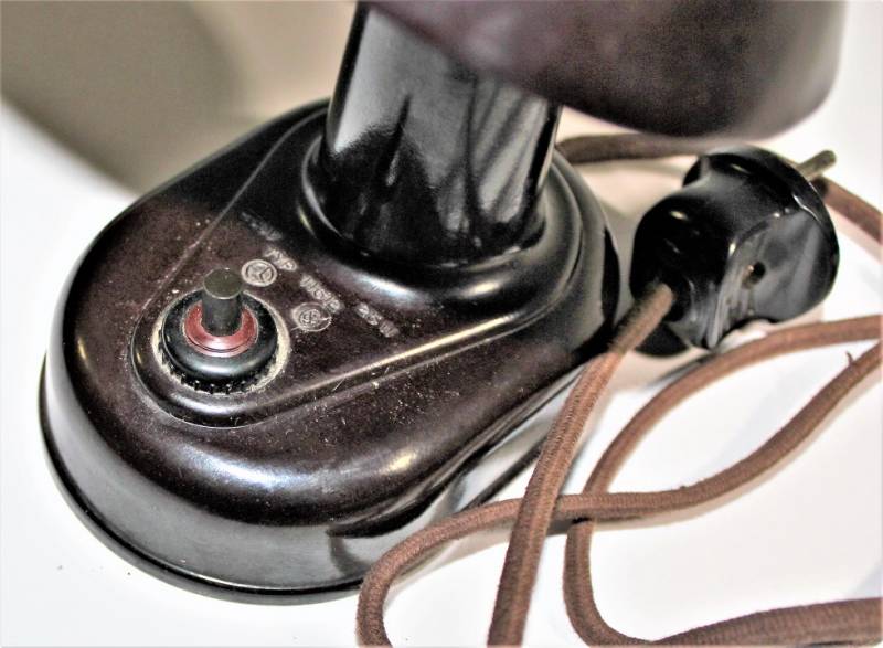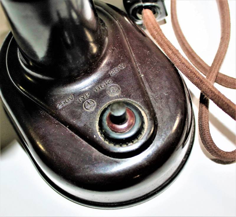 Stupenda lampada da ufficio SS-WH-LW in bakelite rossa-marrone in ottime condizioni, quasi pari al nuovo, completa in ogni sua parte, bakelite perfetta non lesionata, perfettamente funzionante, solo leggerissima patina del tempo, marcata con marchi del fabbricante, voltaggio e numero di serie, completa del suo cavetto e della spina originale.
