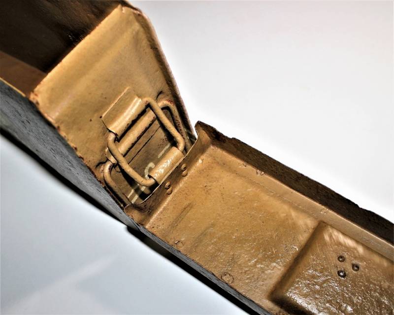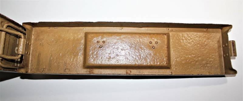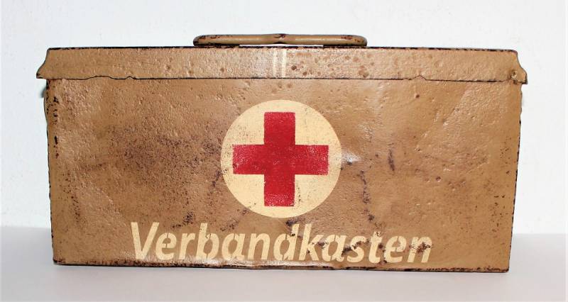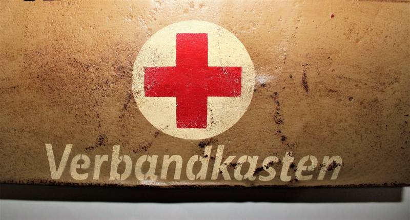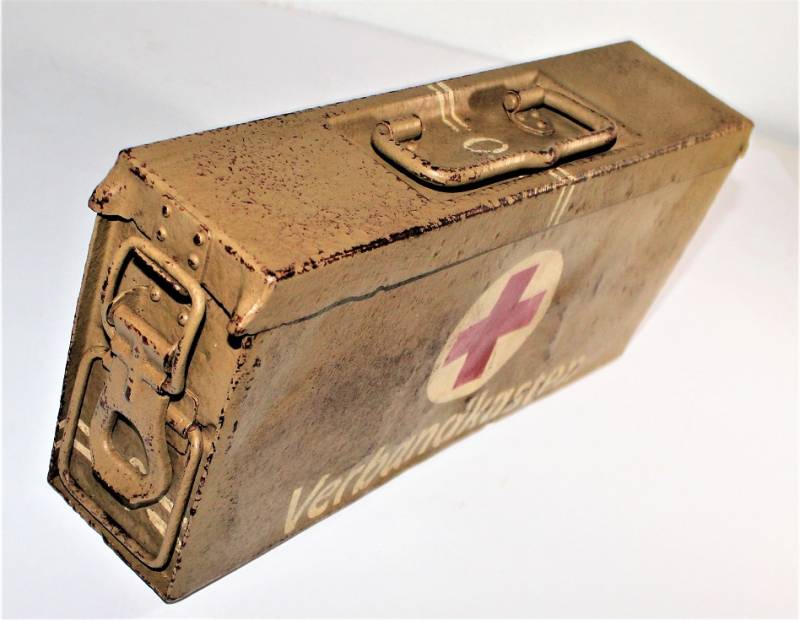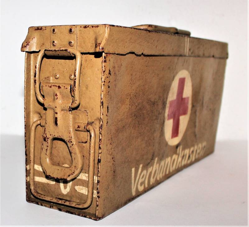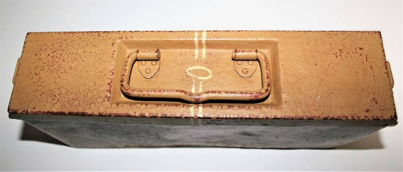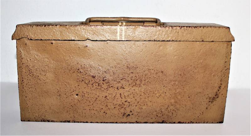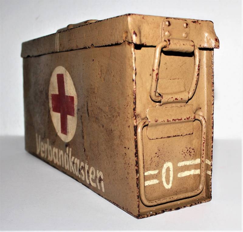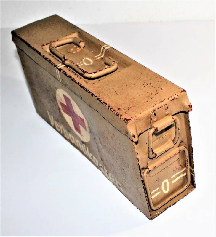 Cassetta per munizioni MG34 MG42 usata dalla Croce Rossa, completamente riverniciata in colorazione mimetica gialla con Croce Rossa, condizioni buone, ma su base molto usata.