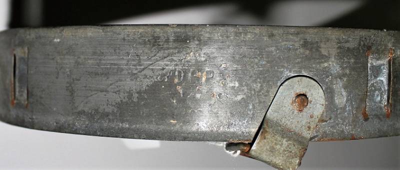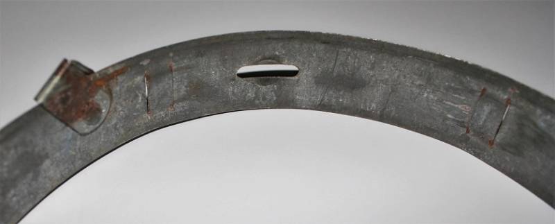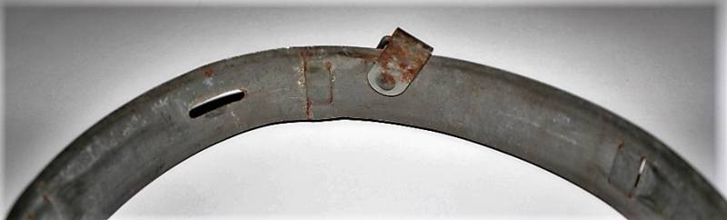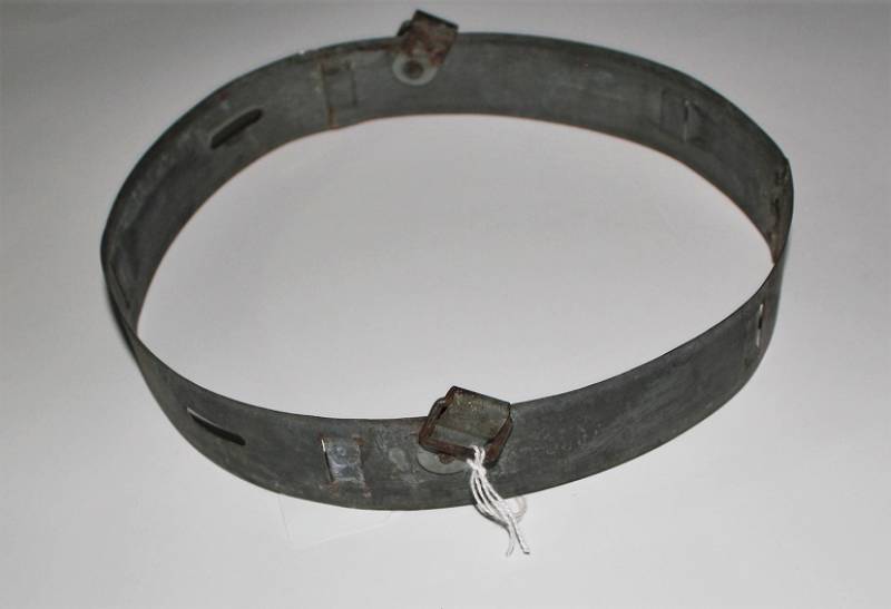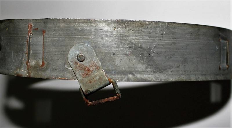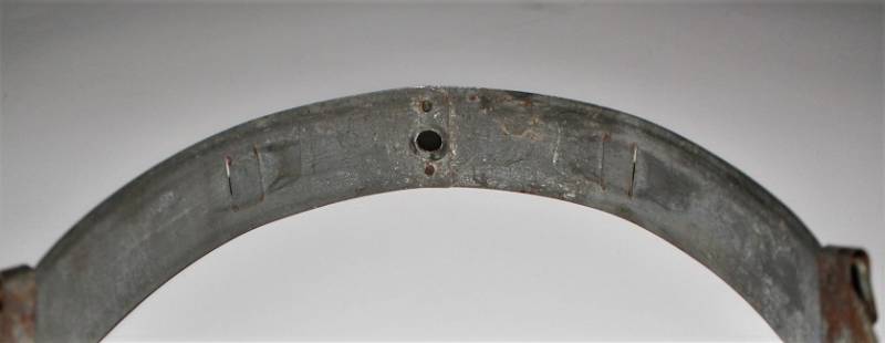 Cerchione zincato per elmetto mod.40-42, completo e in buono stato, con patina del tempo e dellŽuso, taglia ferro ET64, per pelle tg.56, marcato con fabbricante e anno. Originale 100% WWII periodo.