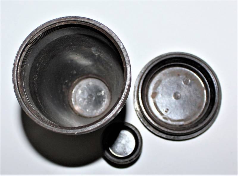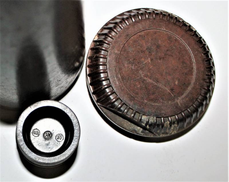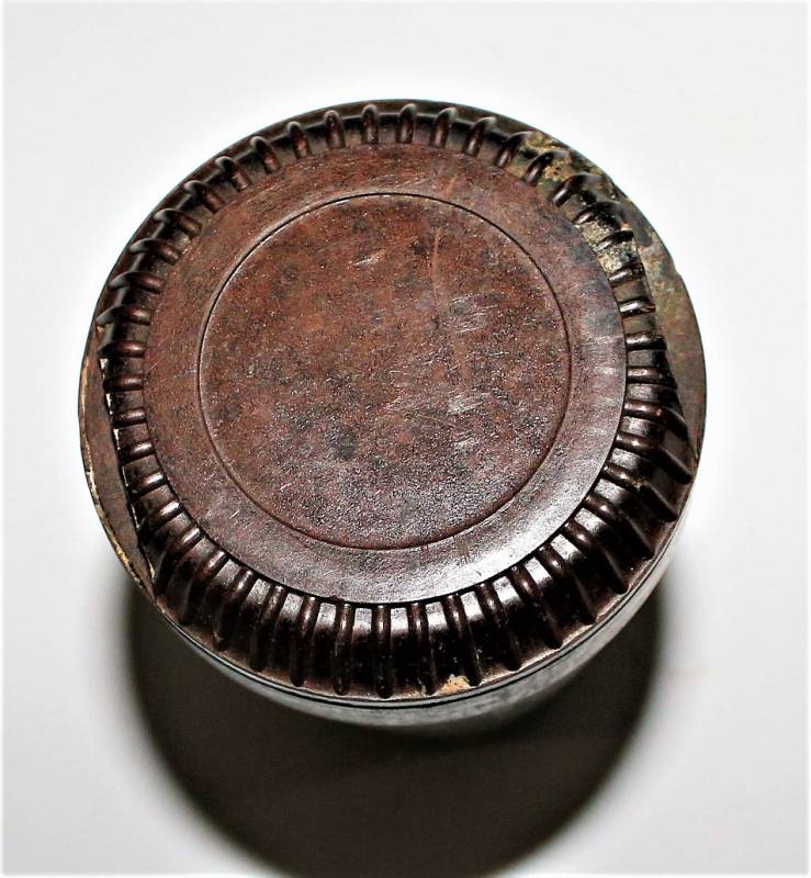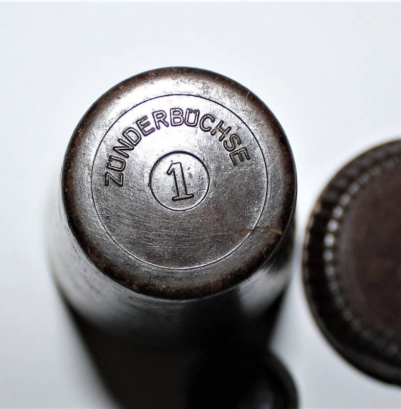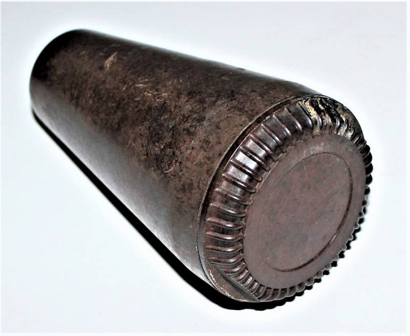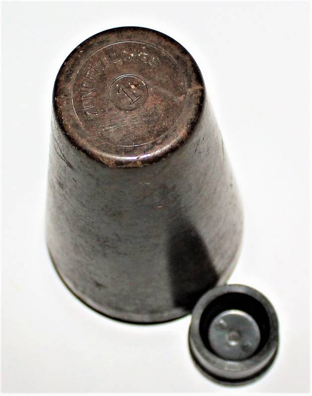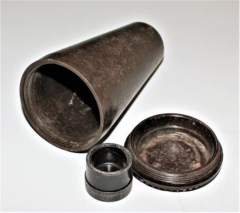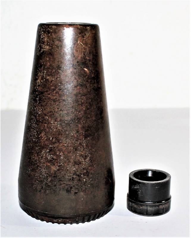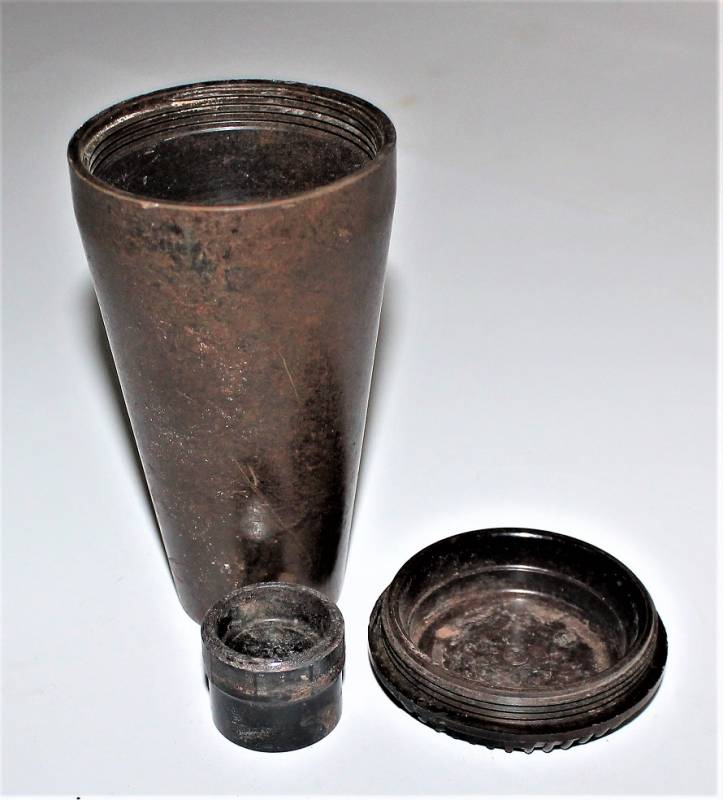Contenitore in bachelite marrone per spoletta dŽartiglieria in ottime condizioni, non danneggiato, solo con leggera patina del tempo e dellŽuso, marcato con codice produttore, altri codici di produzione e data.