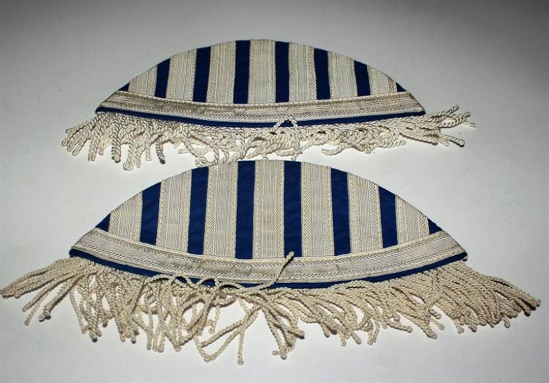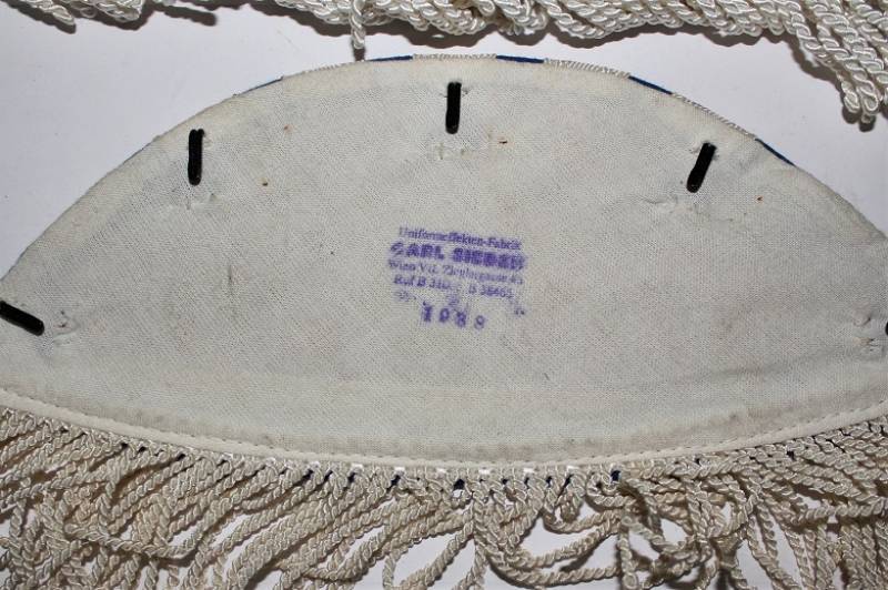 Spalline per giacca da musicante in waffenfarde blu, condizioni ottime pari al nuovo, mai usate, con frange in canottiglia, marcate su retro con fabbricante e data 1938. Originale 100% WWII periodo.
