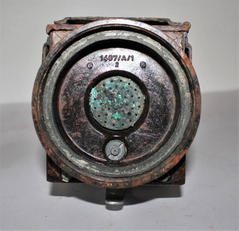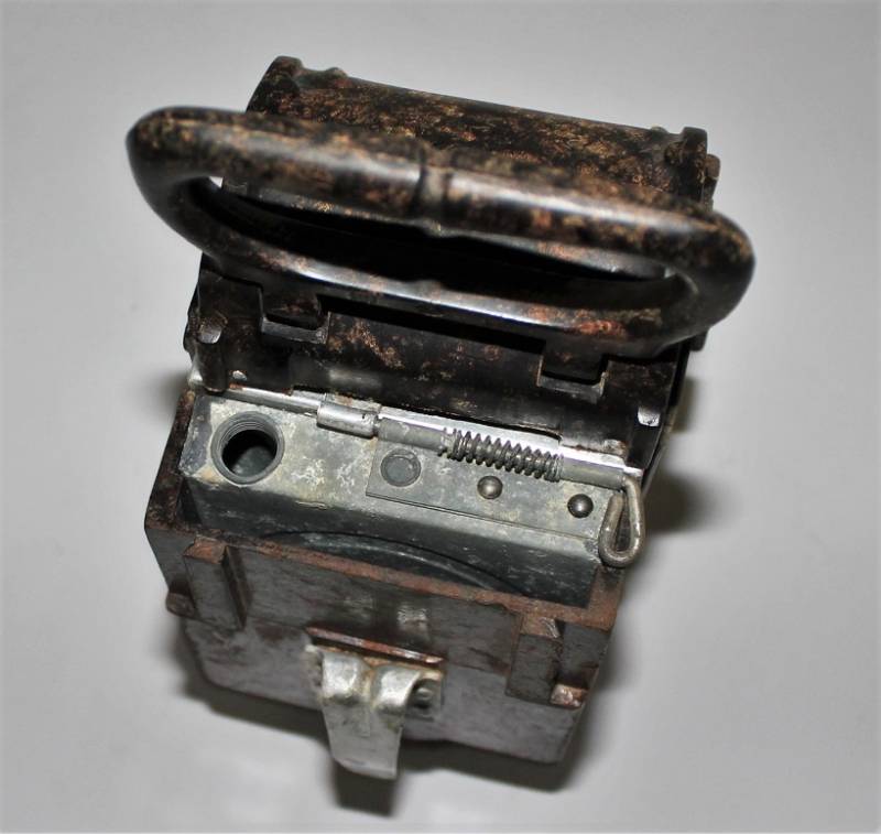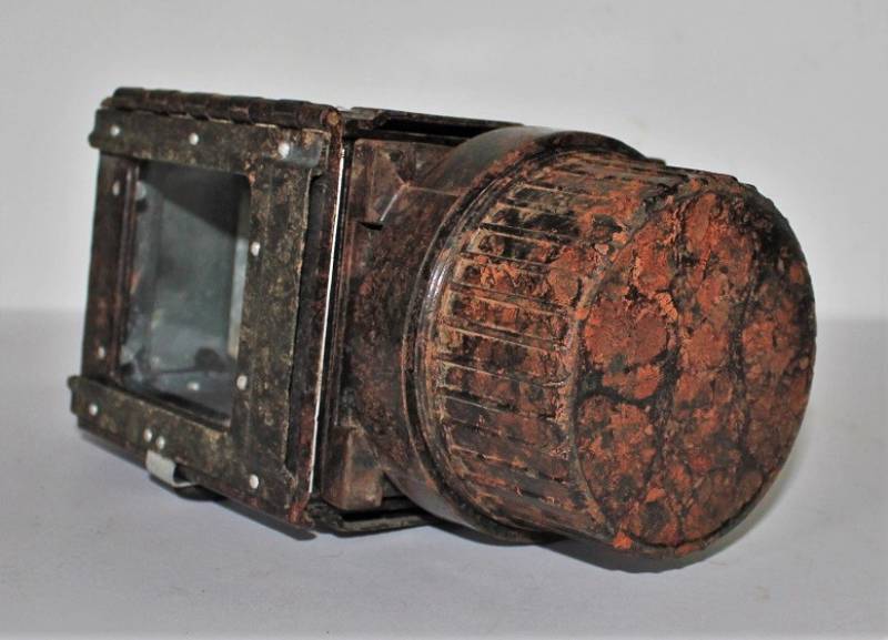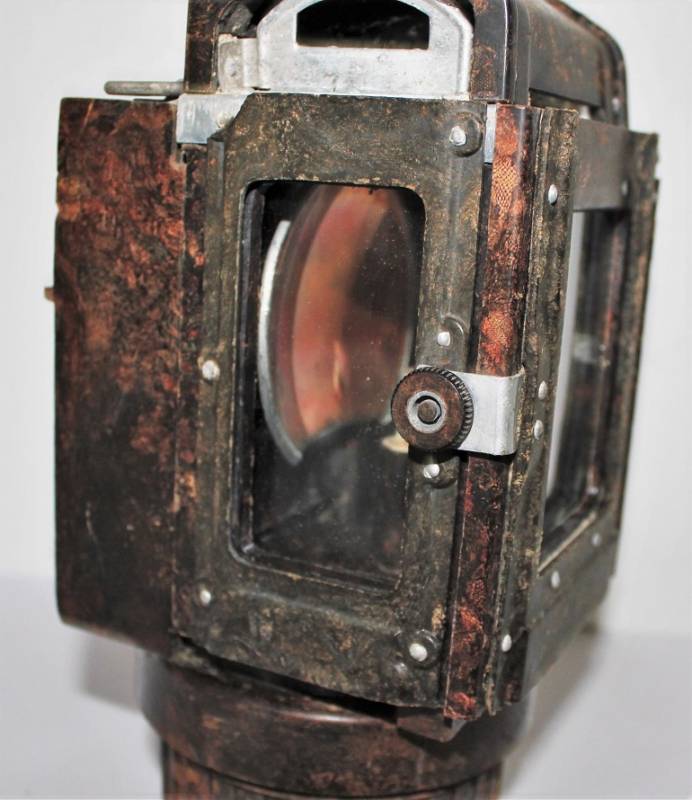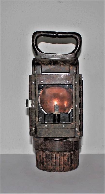 Lanterna a carburo in bakelite rossa, completa in ogni sua parte, condizioni ottime, non restaurata o riparata, leggera patina del tempo e dellŽuso, marcata con codice fabbricante sulla base della maniglia dellŽimpugnatura. Originale 100% WWII periodo.