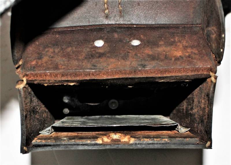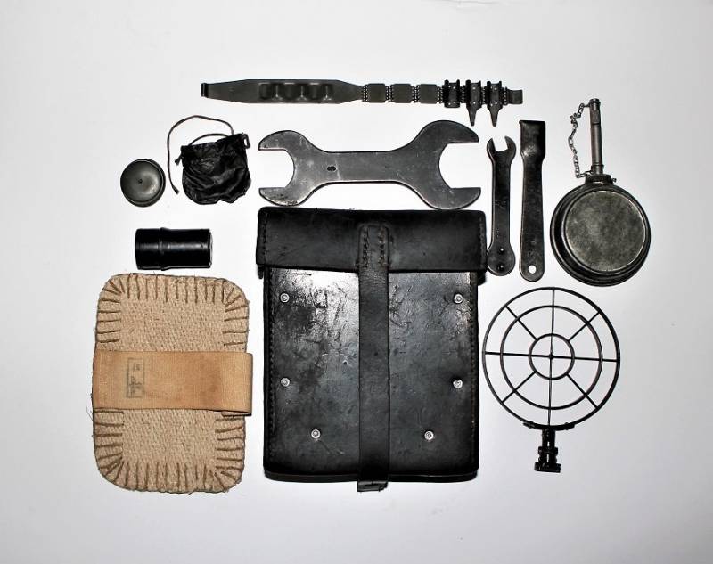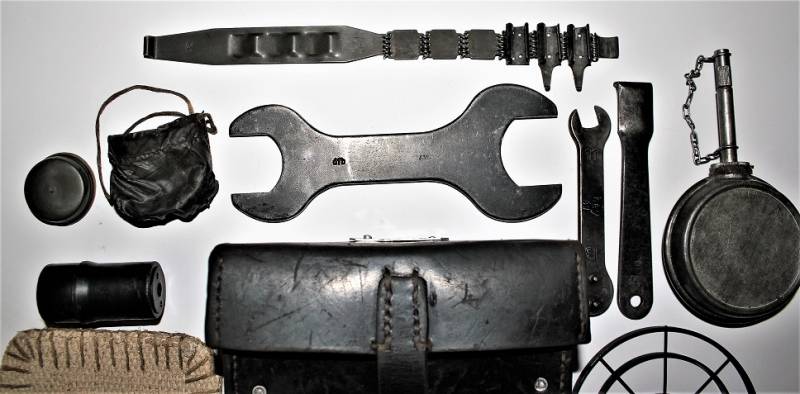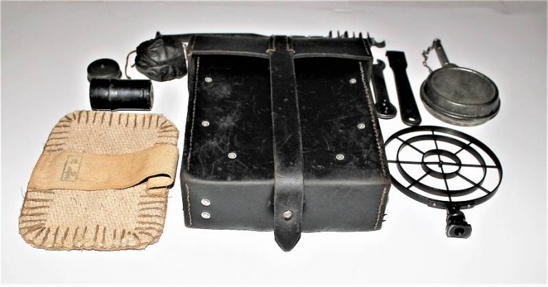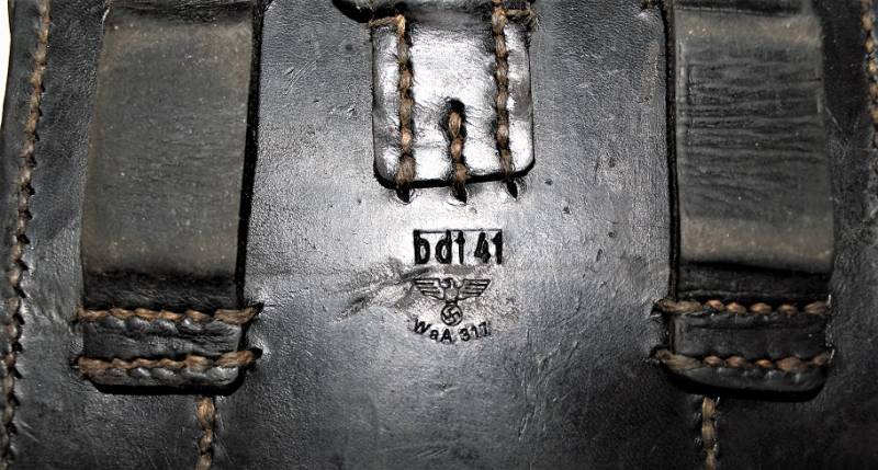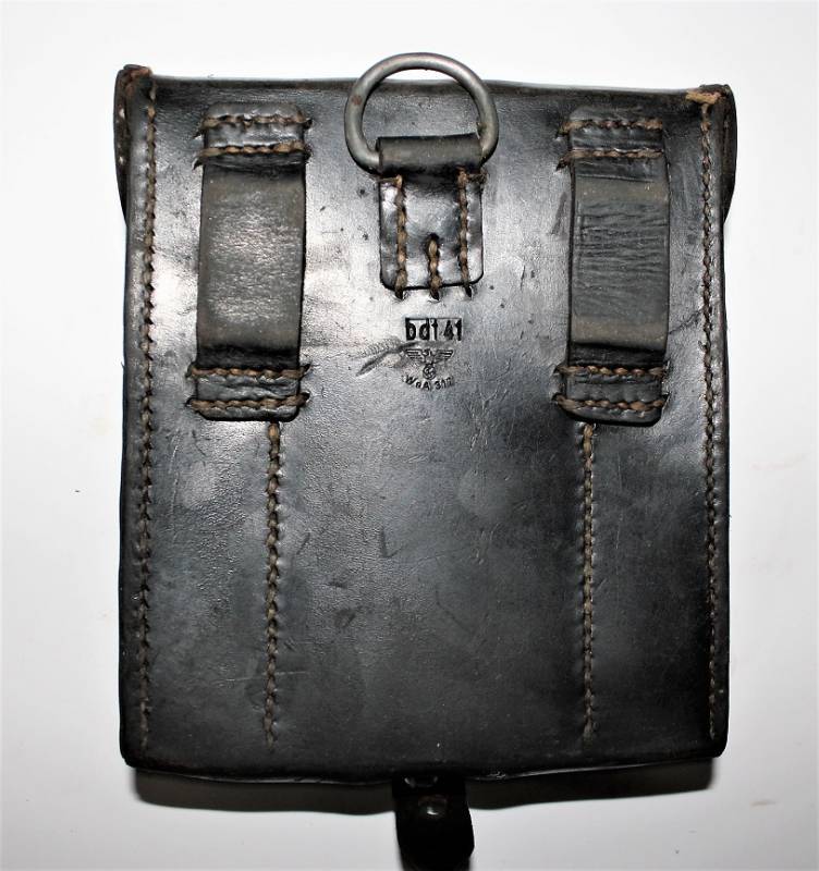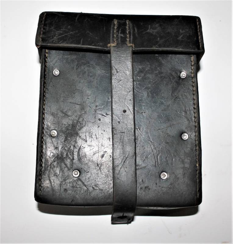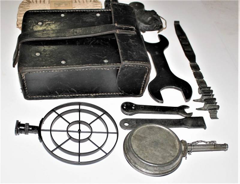 Kit pulizia per MG34 in pelle nera in belle condizioni, non lesionato, non restaurato o riparato, pelle morbida con leggera patina del tempo e dellŽuso, completo di tutti gli accessori, compreso guanto dŽamianto (mancante solo dellŽotturatore), accessori marcati con codice fabbricante e data. Contenitore in pelle marcato con sigla fabbricante, data 1941 e waffenamt. Originale 100% WWII periodo.