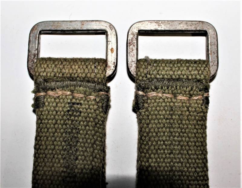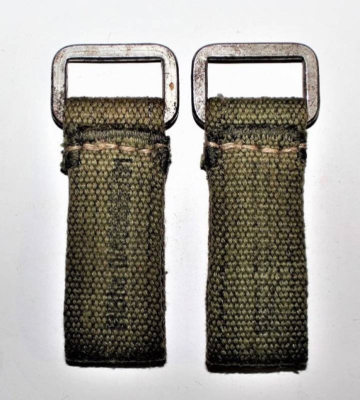 Coppia di ganci a sospensione in tela tropicale D.A.K. colore giallo-verde in condizioni perfette, marcati con RBN N°..... Originale 100% WWII periodo.