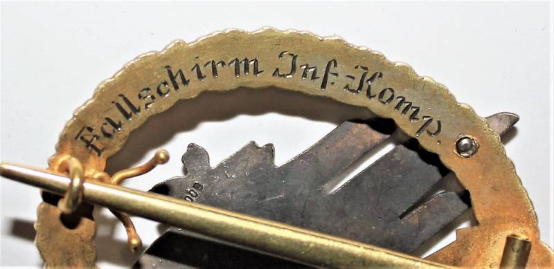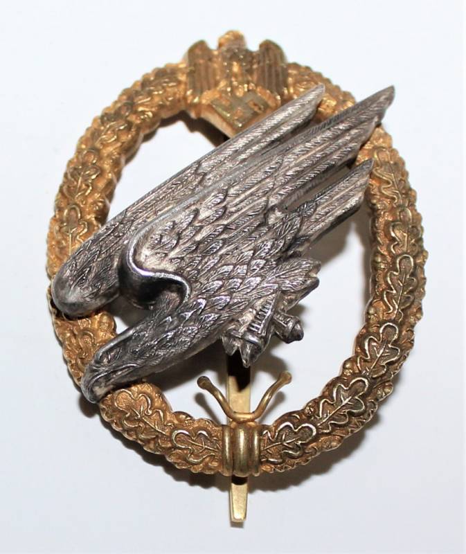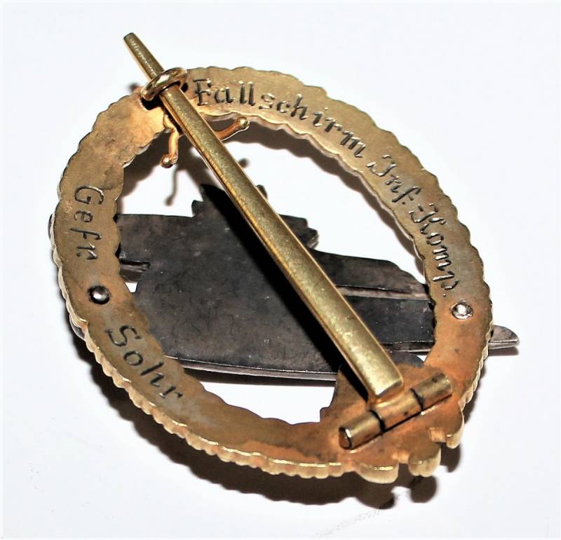 Stupendo e raro distintivo da Paracadutista dell´esercito in condizioni perfette quasi pari al nuovo, stupendi dettagli, modello nato in argento con corona e aquila dell´esercito dorata e aquila parà in argento massiccio marcato 800, manifattura di C.E. JUNKER, unico fabbricante di questo modello, con iscrizione incisa sul retro "Fallschirm Inf.-Komp" e nome del soldato "Gefr. Shor".