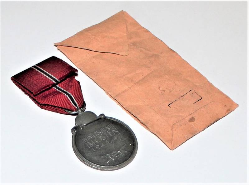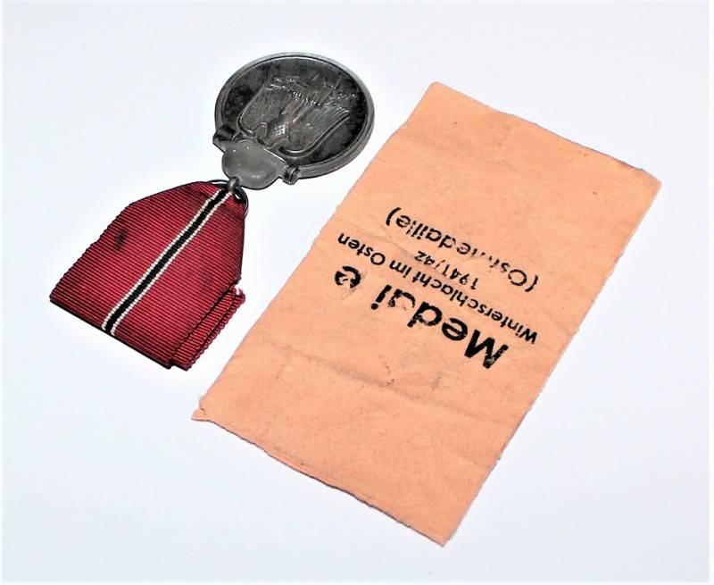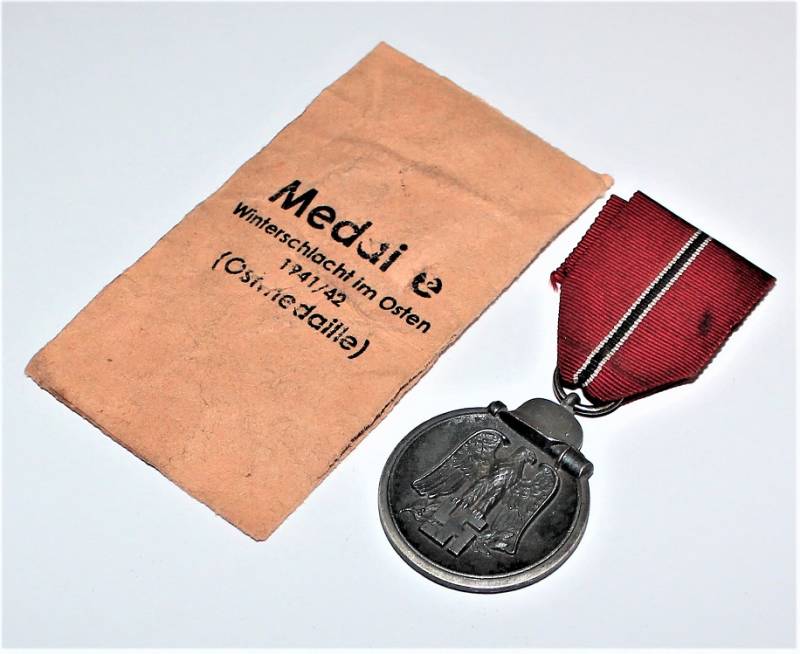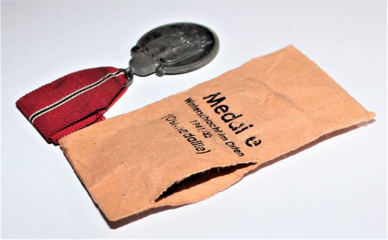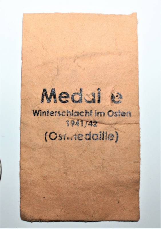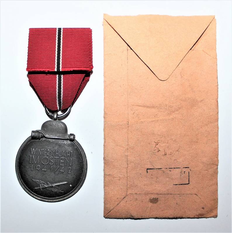 Medaglia della Campagna di Russia in buone condizioni con patina del tempo e completa di nastrino e della sua busta di carta. Originale 100% WWII periodo.