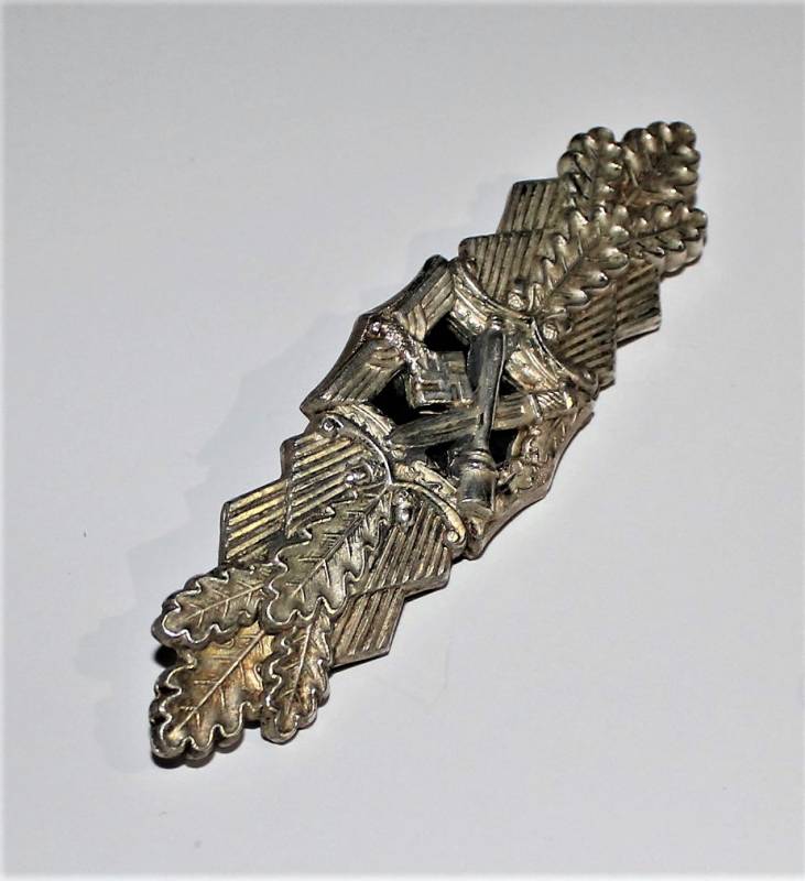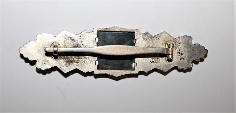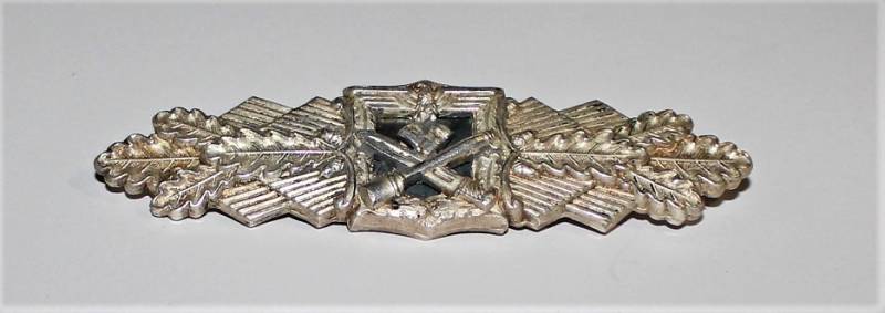 Distintivo per combattimento ravvicinato classe in argento "NAHKAMPFSPANGHE", condizioni molto belle, leggerissima patina del tempo e dellŽuso, ottimi dettagli, marcato sul retro con codice fabbricante. Originale 100% WWII periodo.