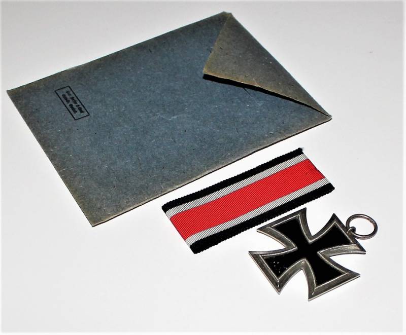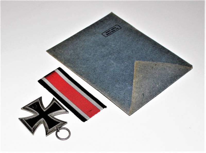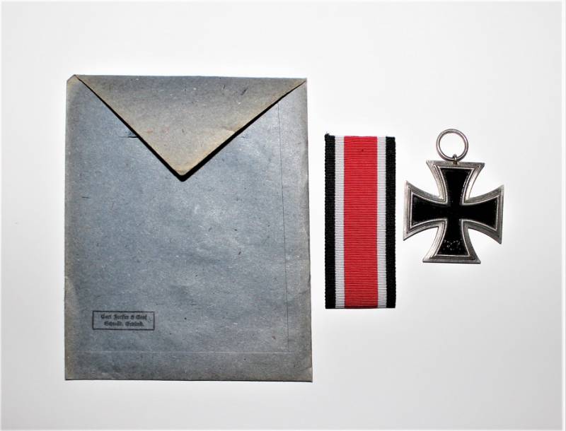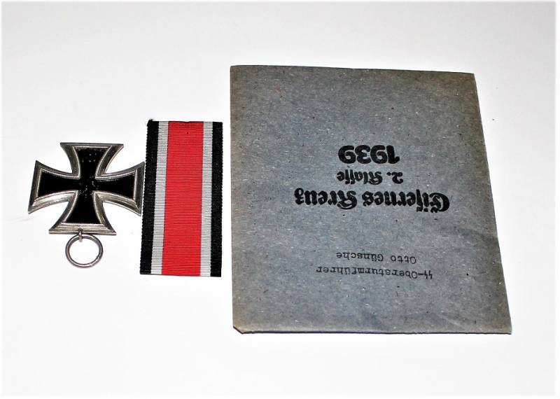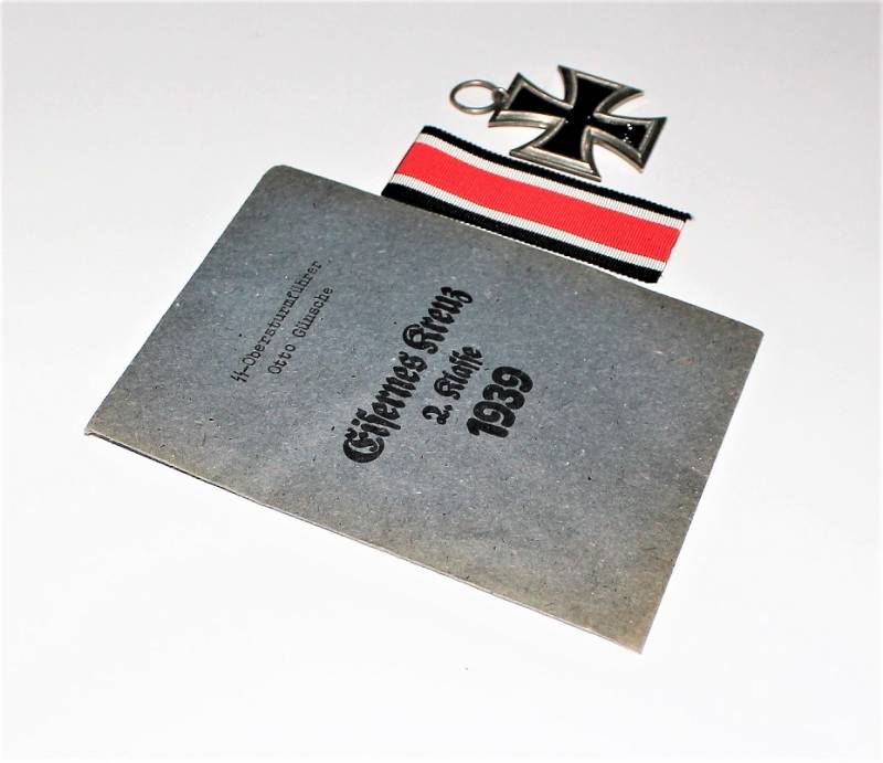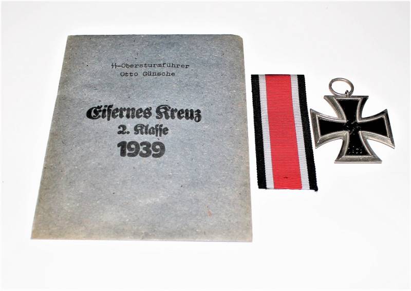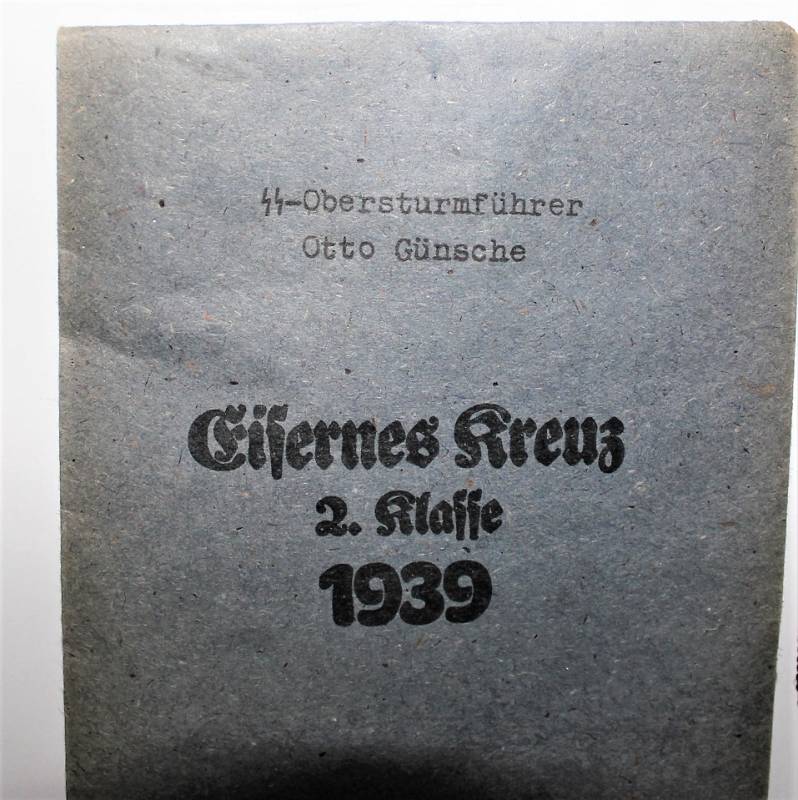 Croce di ferro di 2°classe completa di nastrino in condizioni perfette pari al nuovo, completa della sua busta di carta con il nome del fabbricante con cui veniva consegnata in origine. Il distintivo apparteneva a SS OBERSTURMFUHRER OTTO GUNSCHE, auiutante personale di Adolf Hitler, sulla busta č inciso il nome e il grado scritti a macchina. Originale 100% WWII periodo.