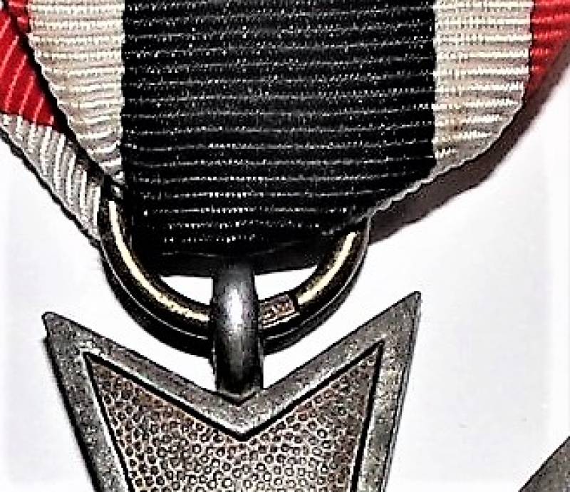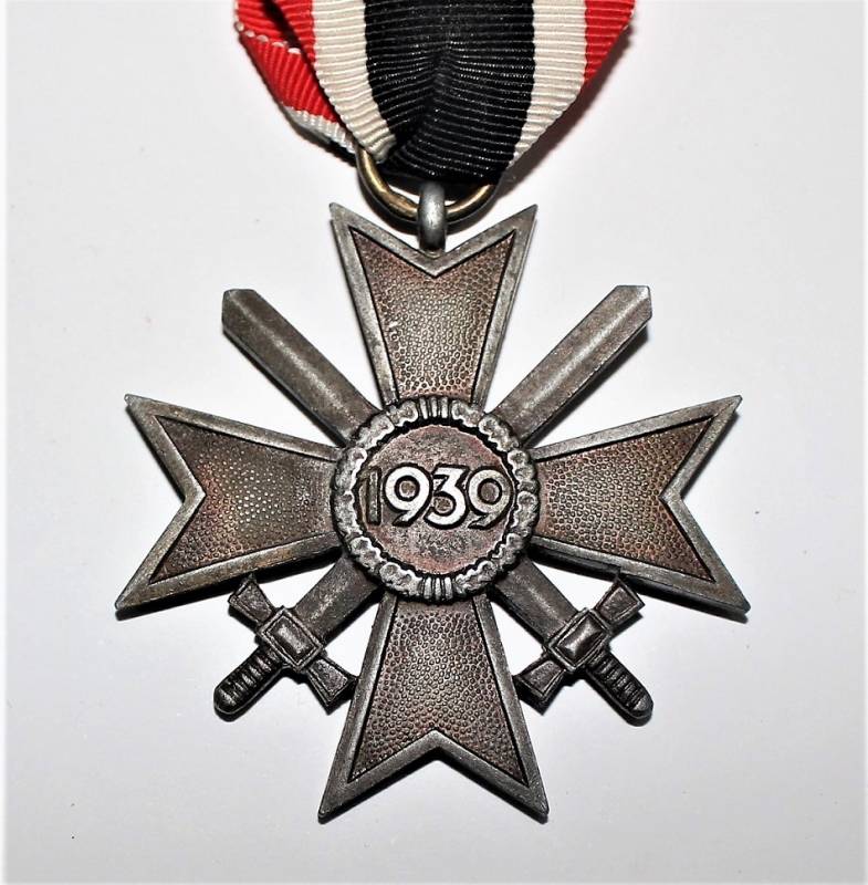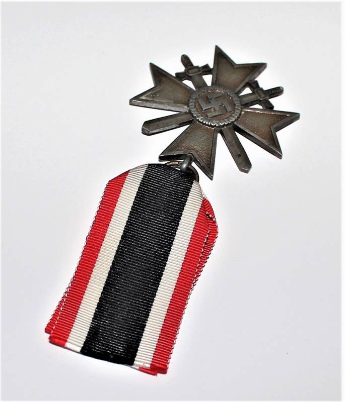 Medaglia meriti di guerra con spade grado in bronzo, completa di nastrino, con patina del tempo ma in buone condizioni, anello marcato con numero 45 riferito al fabbricante. Originale 100% WWII periodo.