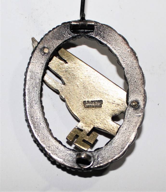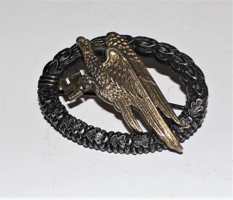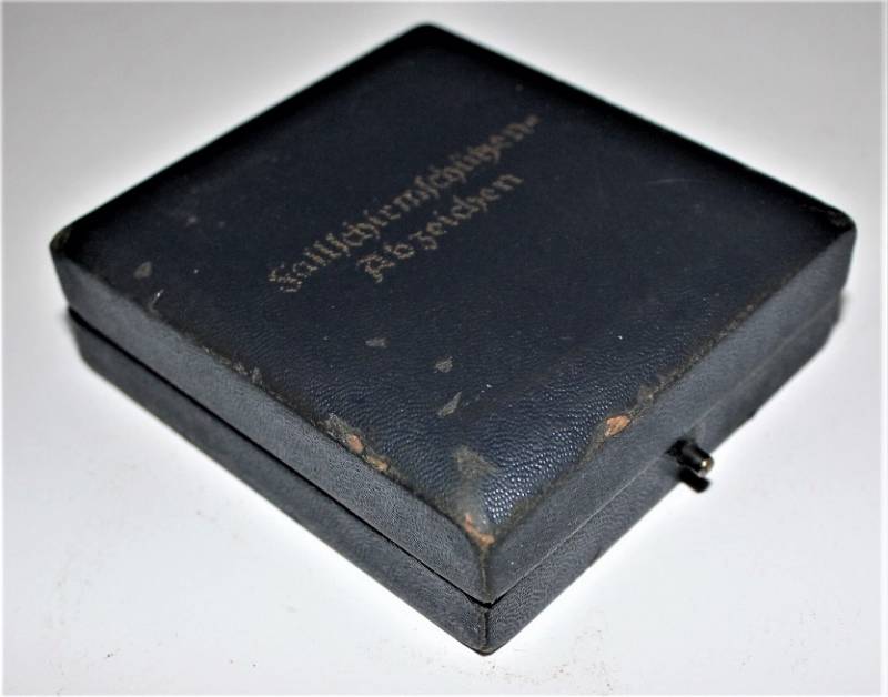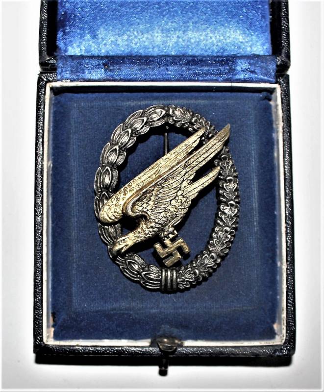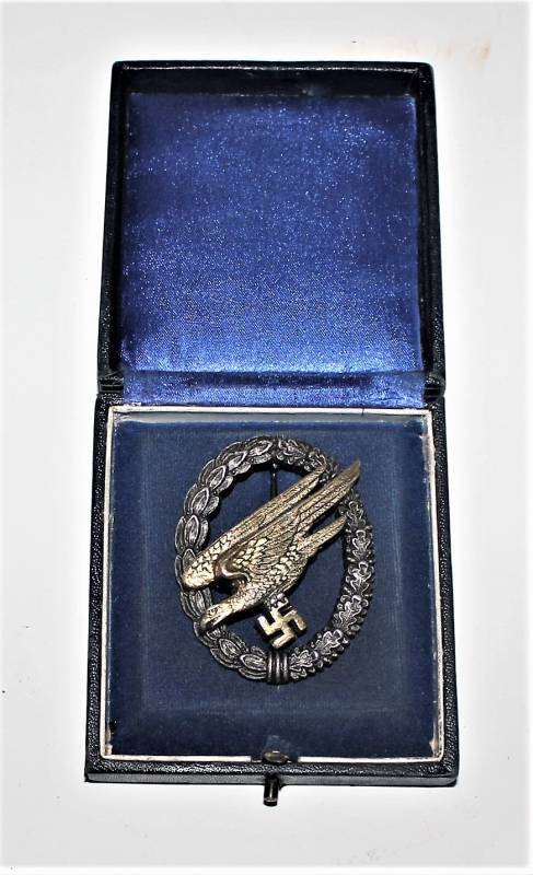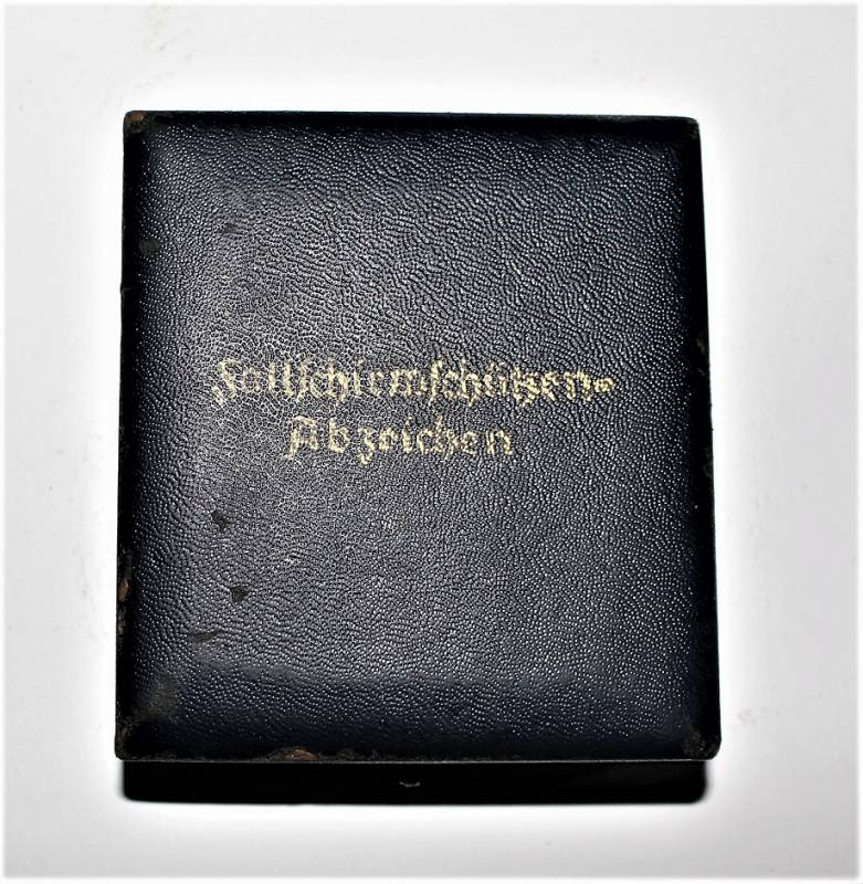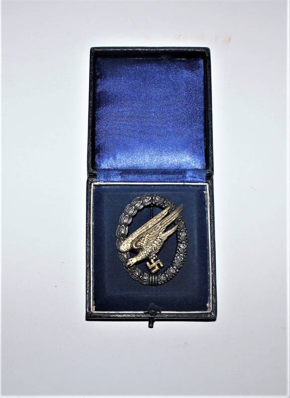 Bellissimo distintivo da paracadutista nella sua scatola, leggera patina del tempo e dellŽuso, ma non manomesso o restaurato, marcato sul retro con fabbricante. Scatola in buone condizioni leggermente patinata dal tempo. Originale 100% WWII periodo.