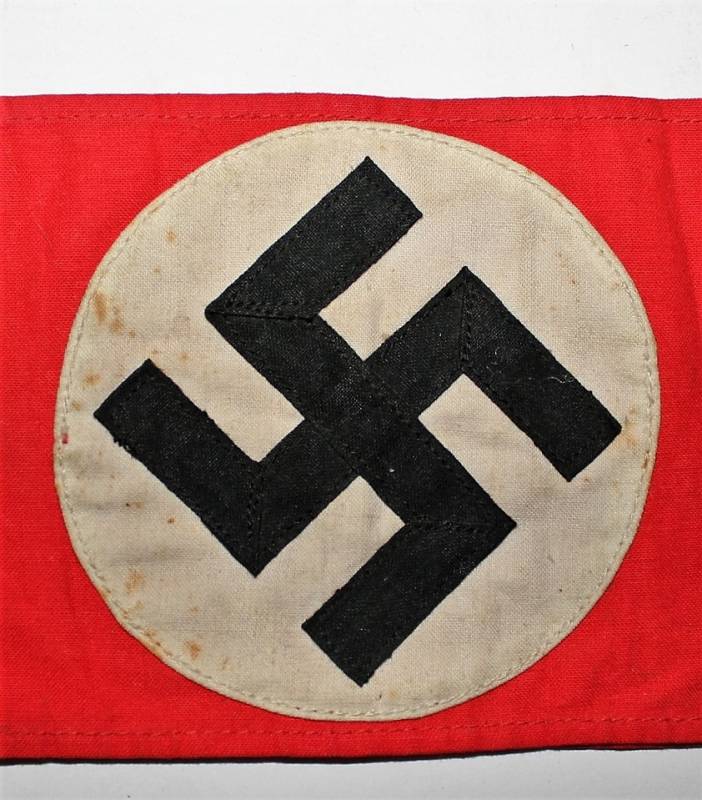 Fascia da braccio per organizzazioni N.S.D.A.P. in buone condizioni leggermente patinata dal tempo, nata su banda di cotone rosso e svastica cucita su fondo bianco. Originale 100% WWII periodo.