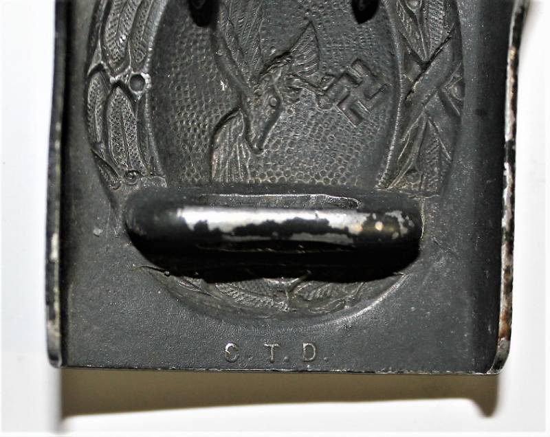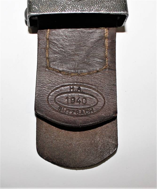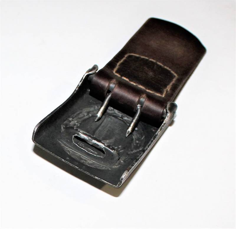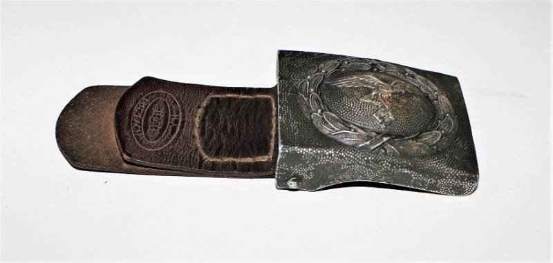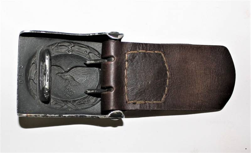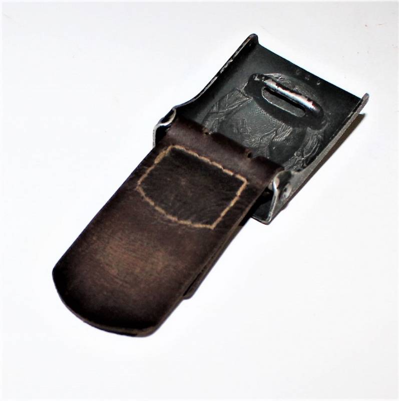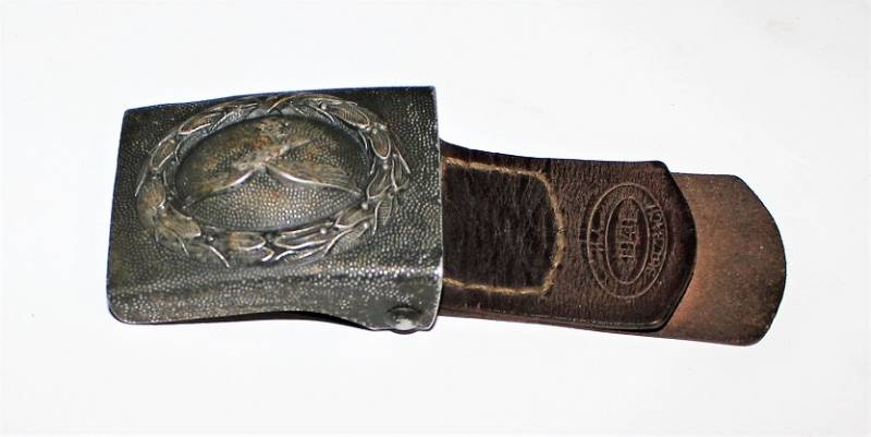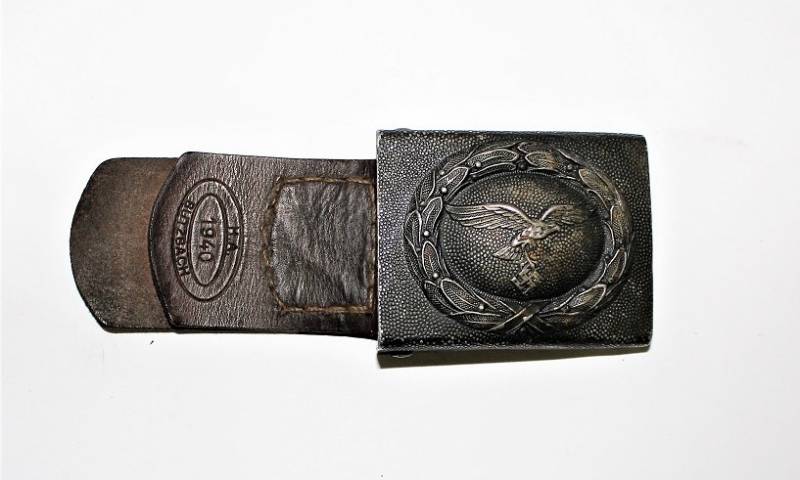 Fibbia in alluminio in colorazione blugrau della Luftwaffe completa di pattina, condizioni buone, con leggera patina del tempo e dellŽuso, fibbia marcata con codice fabbricante, pattina in pelle marcata con fabbricante e data 1940. Originale 100% WWII periodo.