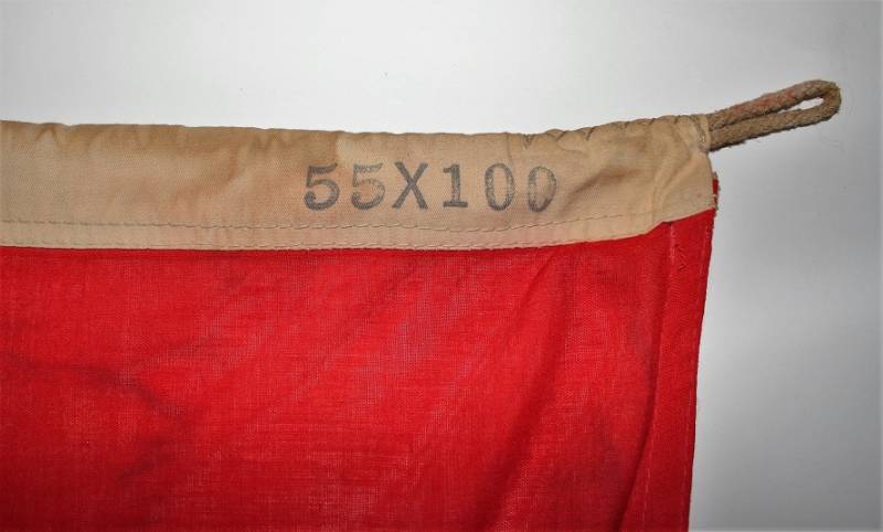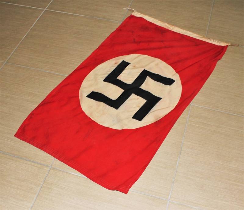 Tipica bandiera N.S.D.A.P. in buone condizioni senza buchi o strappi, in cotone, con svastica e cerchio bianco stampati, marcata con dimensioni 55x100. Originale 100% WWII periodo.