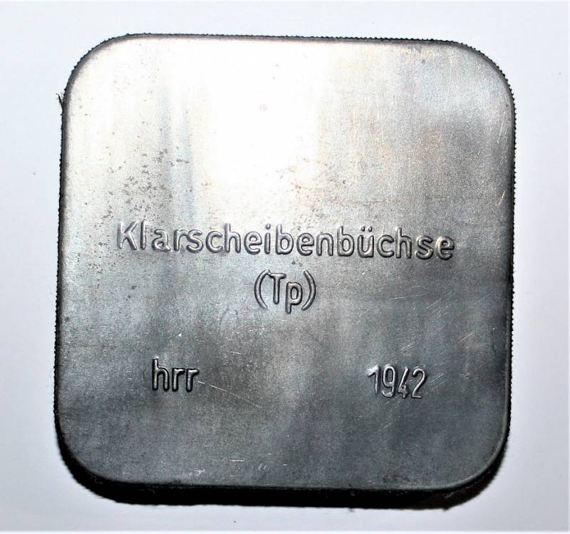 Contenitore M31 in metallo lenti di ricambio per maschera anti-gas da paracadutista in condizioni perfette pari al nuovo, contenitore in metallo ancora sigillato, marcato con codice fabbricante e data 1942. Originale 100% WWII periodo.