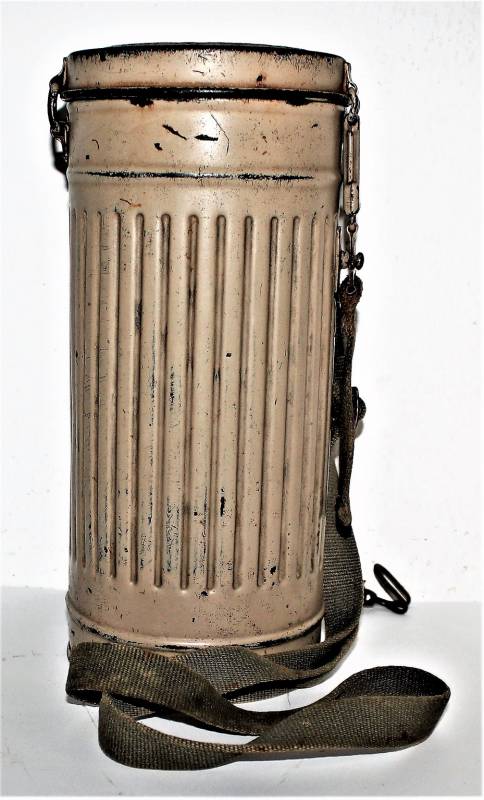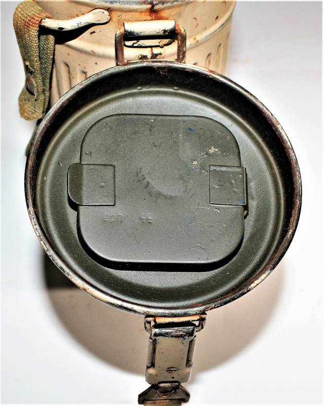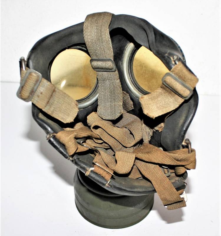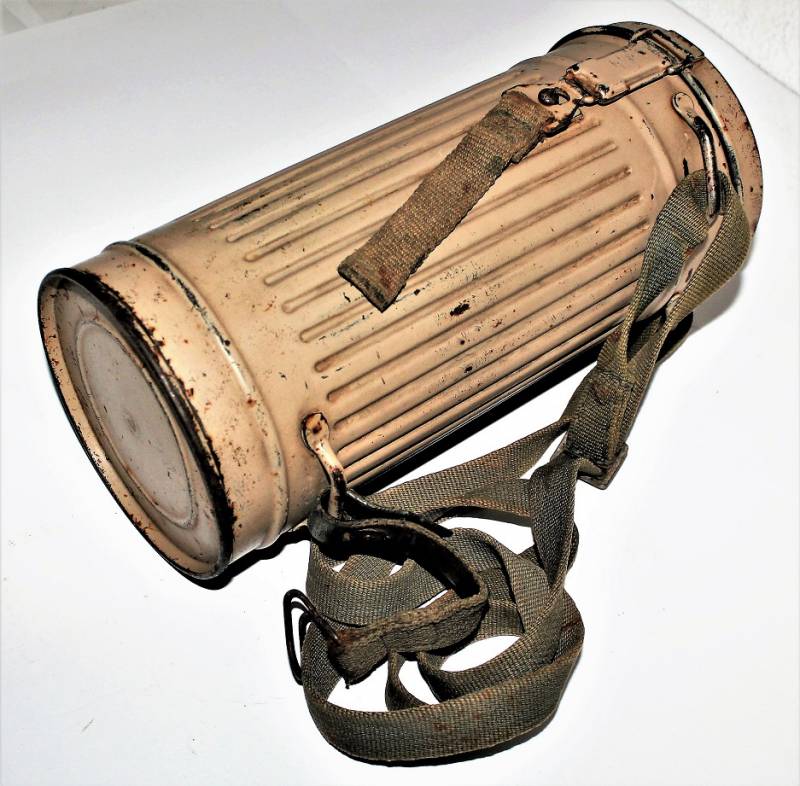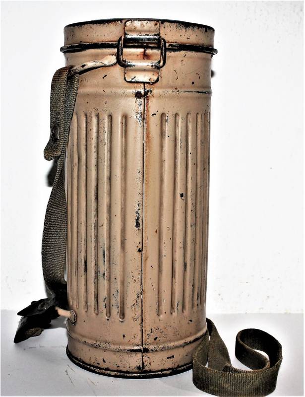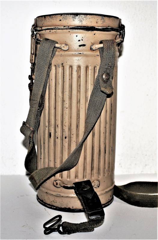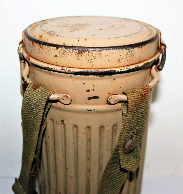 Maschera antigas mimetica gialla, fronte del Sud, probabile Campagna dŽItalia, condizioni molto belle, con leggera patina del tempo e dellŽuso, non restaurata o riparata, la colorazione mimetica si presenta al 90%-95% circa, completa in ogni sua parte, compreso il cinghiaggio e tutti gli accessori (come si può vedere in foto), marcata con codice fabbricante e data 1944. Originale 100% WWII periodo.
