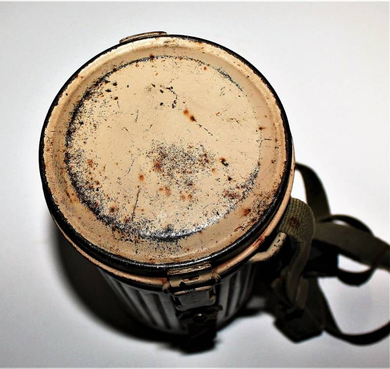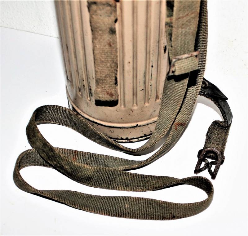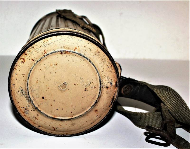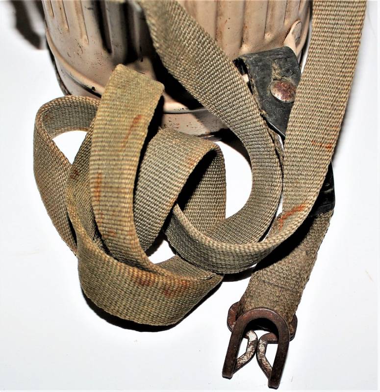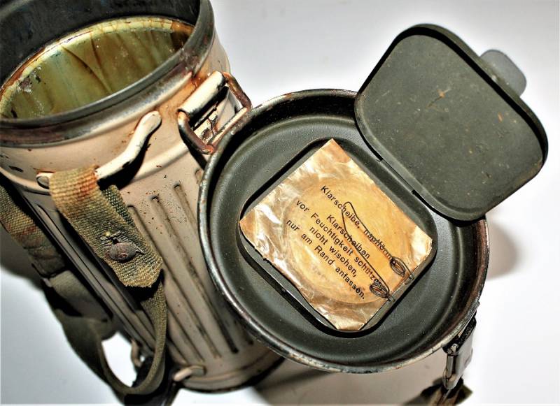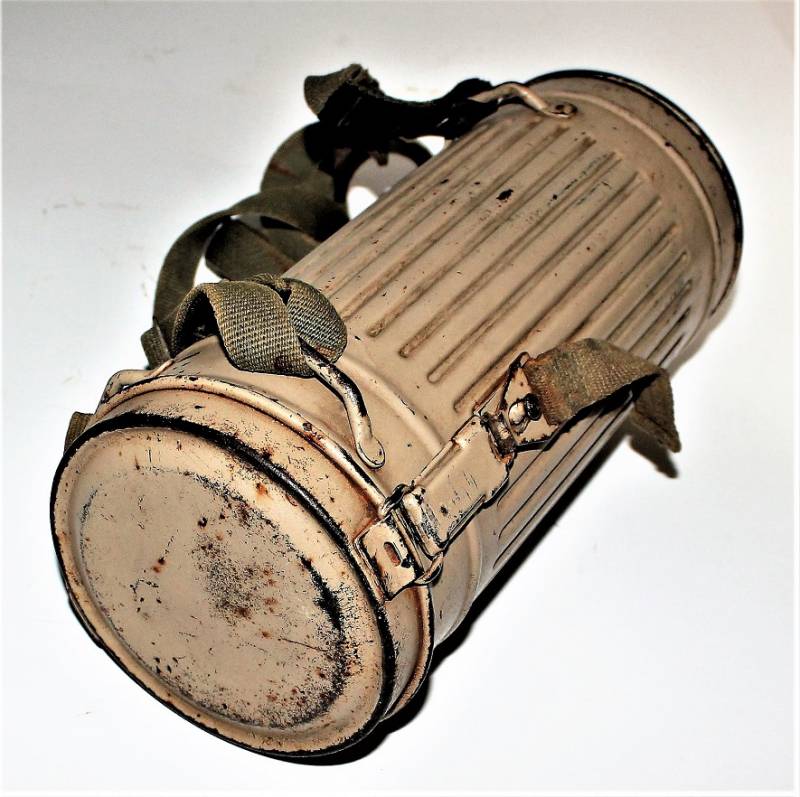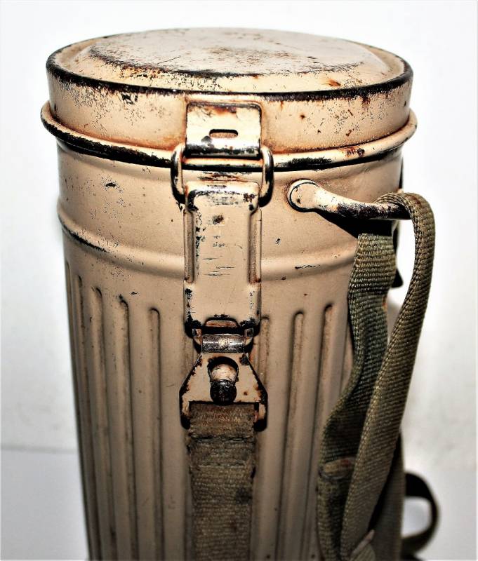 Maschera antigas mimetica gialla, fronte del Sud, probabile Campagna dŽItalia, condizioni molto belle, con leggera patina del tempo e dellŽuso, non restaurata o riparata, la colorazione mimetica si presenta al 90%-95% circa, completa in ogni sua parte, compreso il cinghiaggio e tutti gli accessori (come si può vedere in foto), marcata con codice fabbricante e data 1944. Originale 100% WWII periodo.